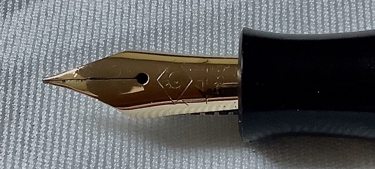 Anche il pennino in oro 14 carati ha giocato il suo ruolo nell'attirare la mia attenzione, semplice eppure particolare nel disegno impresso. Essendo io ignorate in materia di stilografiche, mi ci è voluto un poco a capire chi fosse il produttore, anche perché nessun nome è riportato sopra: solo quel rombo con inscritto il disegno - ho visto poi che rappresenta una metà del sole con i suoi raggi e una mezza luna affiancati - , la dicitura 14K e sotto il numero 585, e nulla più.