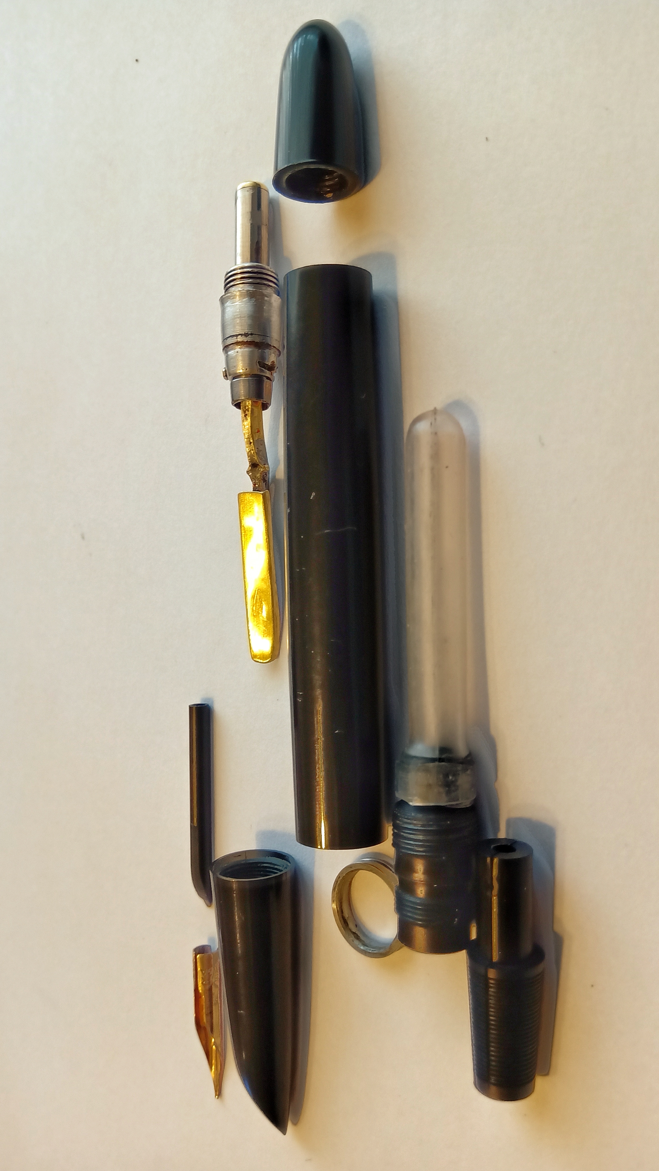 Then I had to fabricate the pulser, for which I used a replacement ballpoint pen stem and a brass screw to generate the pulser head. The screw was ground to the dimensions of the pen stem and I did a little rework on its end to give it a texture similar to Parker's pulsating Red Band. The button was sawn to generate the guides where it was going to slide, and a small ring was welded on the end to act as a travel limiter.