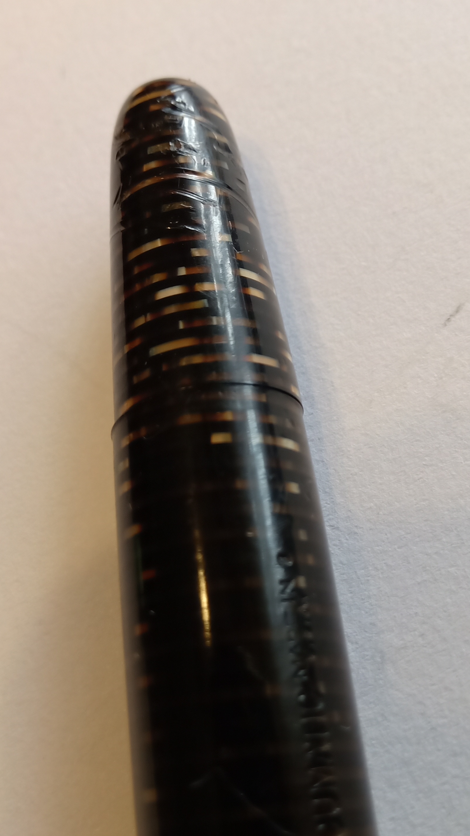 Dear friends of the forum, I want to share with you this time, the restoration of a Parker Vacumatic Tiger Eye Speedline from the 1930s, which I was able to acquire at a reasonable price (US$38) since its nib was intact and the barrel was in very good condition, without cracks and with the entire imprint...