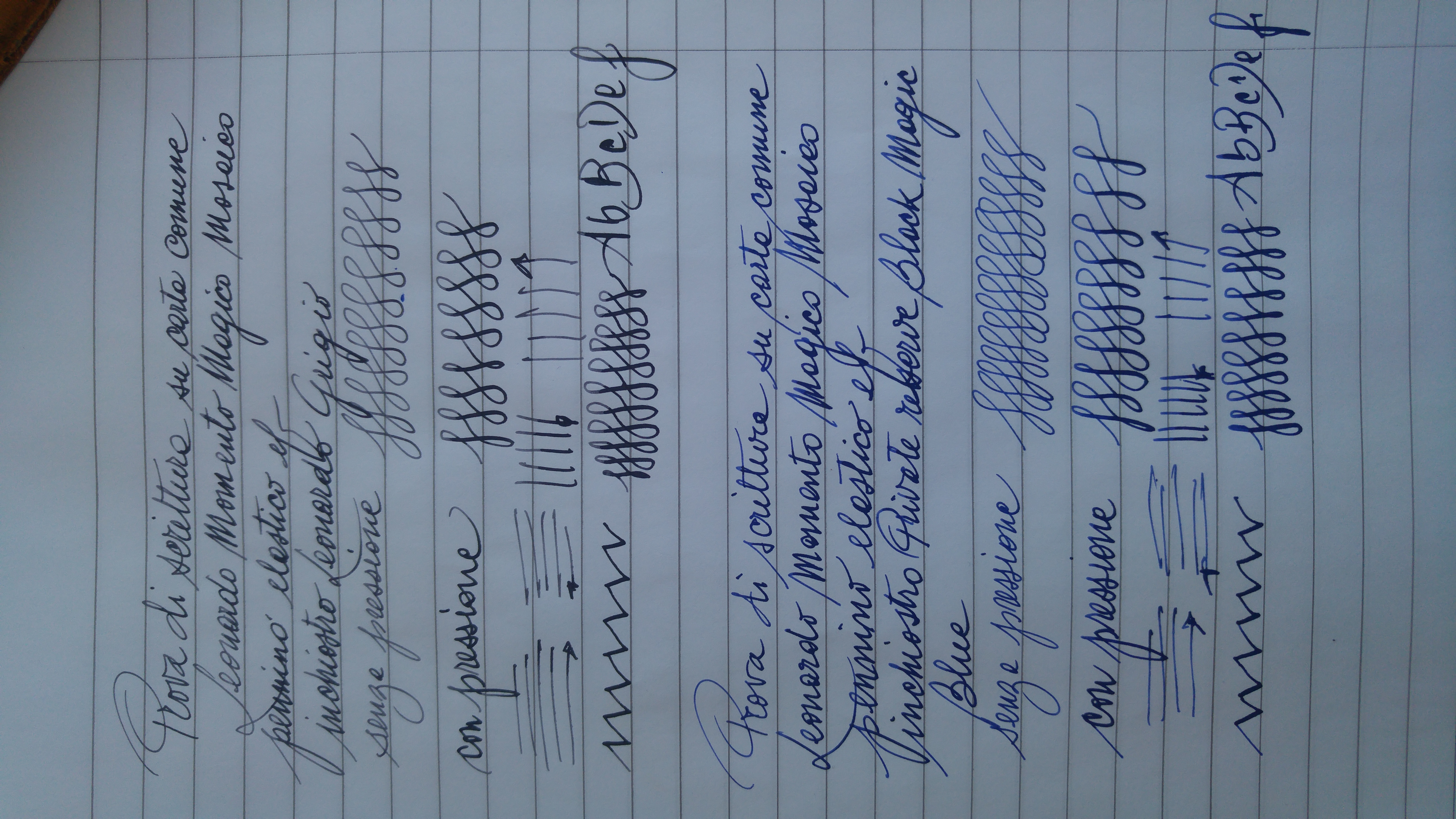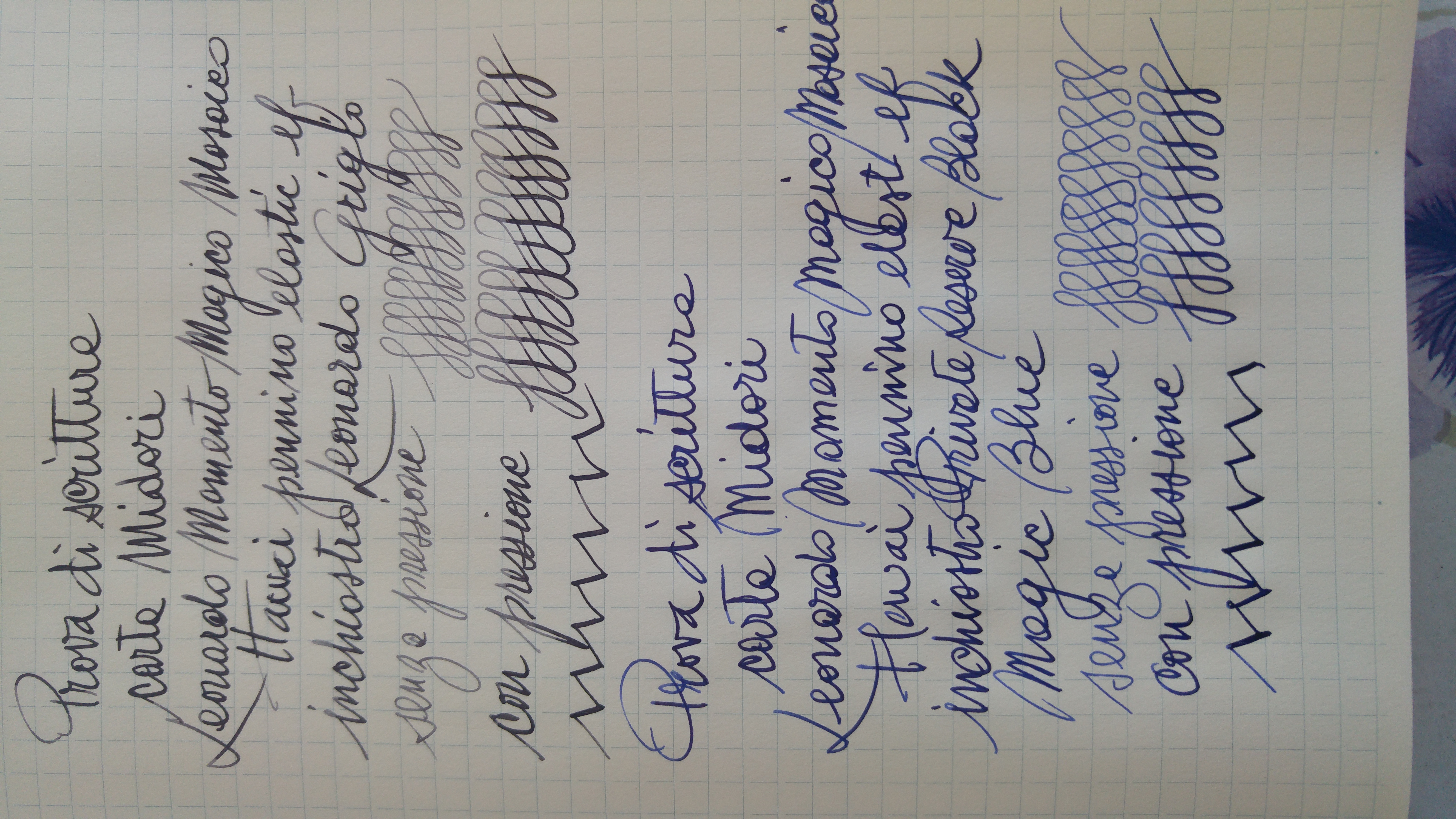 Grazie, ma non ho ben capito cosa compari. E' la stessa penna con lo stesso pennino con due ink diversi ? Se si, parliamo di una Leonardo con Pennino Elastic Steel Nib ? Non è una comparativa tra il pennino in acciaio e quello in oro ?