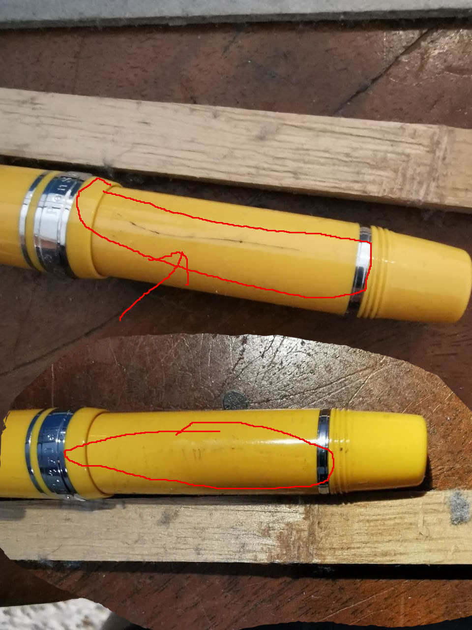 Il Mio consiglio è quello di lavorare la parte rotta del fusto in modo da levigare le crepe e facilitare il riempimento con la colla, come mostrato ne wiki sulla riparazione delle crepe e poi riempire tutto miscelando una bicoponente trasparente e un poco di tempera gialla in polvere; dai uno strato appena abbondante e quando è tutto asciutto levighi il tutto con carta da micromesh sino a lucidare con il polish. Viene molto bene. Non uso mai l'attak sulle stilografiche, anche perchè tende sempre a frantumarsi, la bicomponente è una colla a fortissima presa, pensa che nell modellismo la usiamo per incollare qualsiasi cosa, anche i motori a scoppio sui telai dei modelli di aereo e non si rompe mai, neanche se l'aeromodello precipita, più facile che si rompi in un altro punto. Inoltre non teme vibrazioni. Pensa che le vibrazioni di un motore a scoppio non la intaccano minimamente.