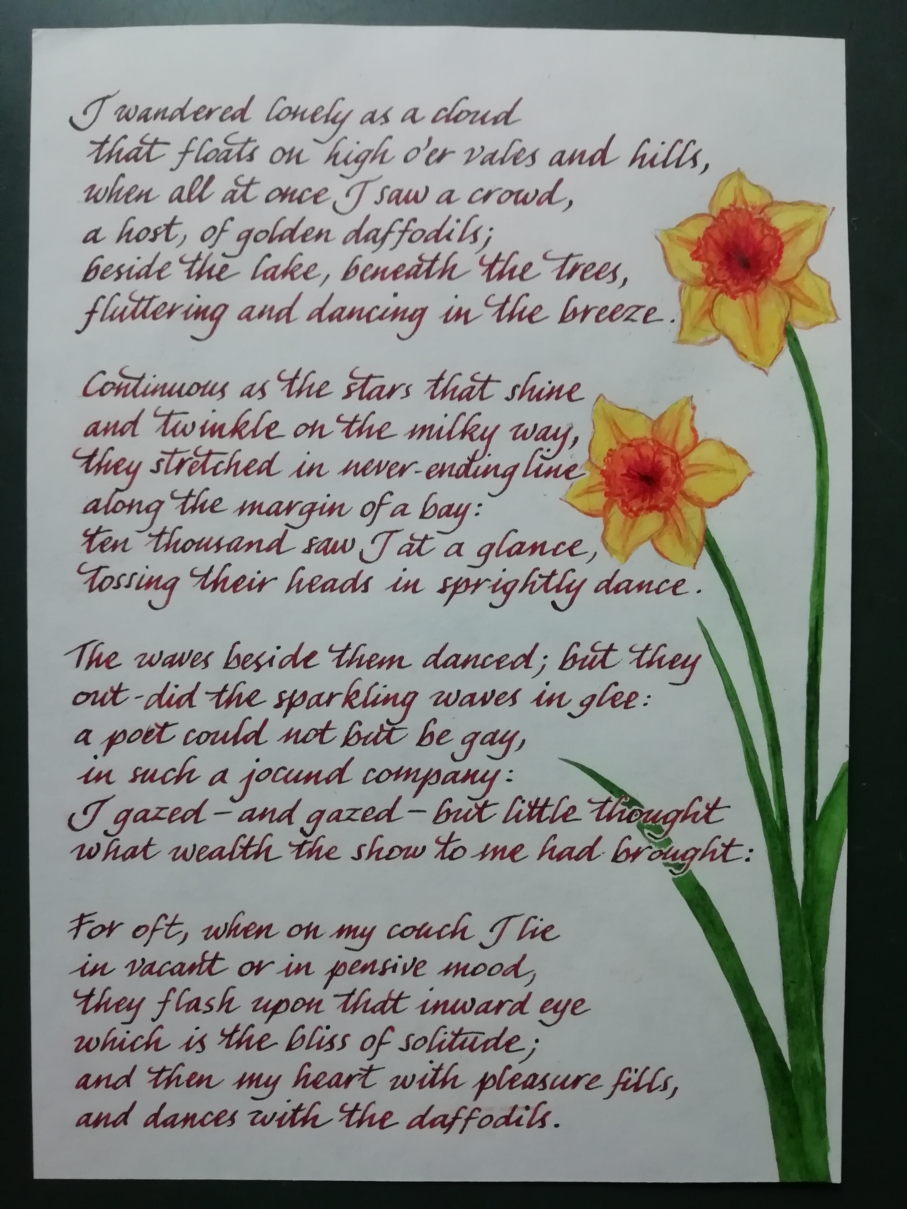 Salve a tutti! Ho pensato di condividere con voi questo pensierino che ho fatto in questi giorni al mio ragazzo. Siccome gli piacciono molto i narcisi e ultimamente ne ha cercato un vaso con molta determinazione gli ho trascritto questa poesia di William Wordsworth in cui questi fiori (daffodils) sono i protagonisti.