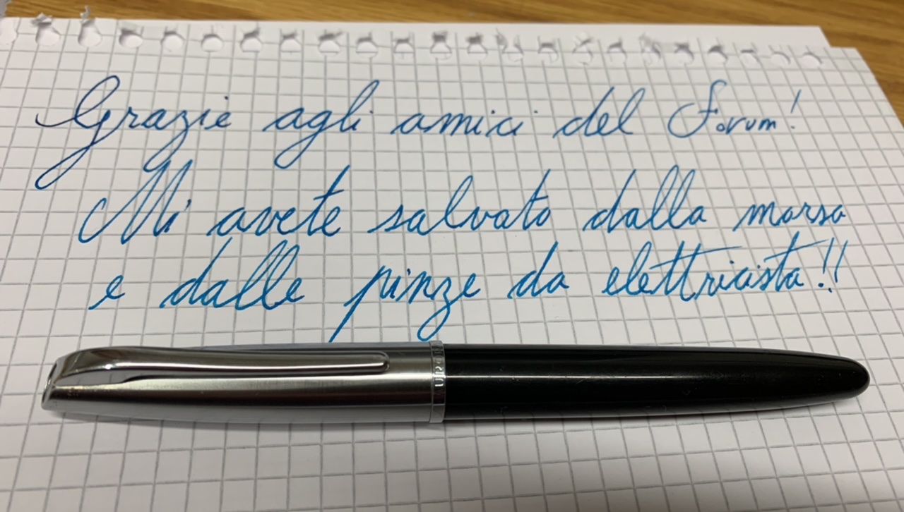 La penna funziona perfettamente con un pennino ottimo e flusso abbondante (pure troppo), ma il cappuccio risulta piuttosto lasco, ovvero il sistema di ritenuta (quello che fa click quando lo si mette per chiudere la penna) ormai si deve essere del tutto consumato con l'uso. Il cappuccio sta in posizione di chiusura, ma basta veramente un soffio per staccarlo e aprire la penna.