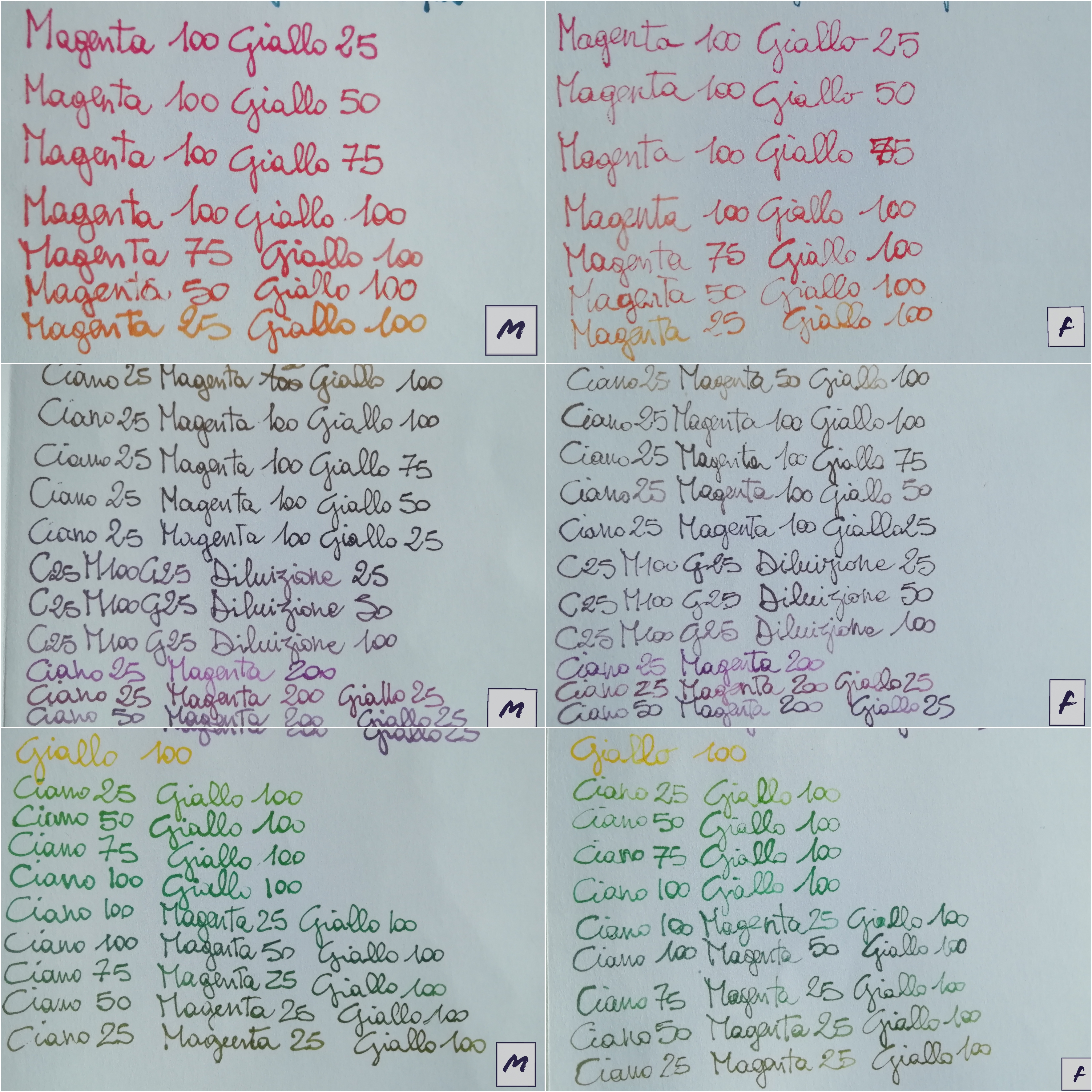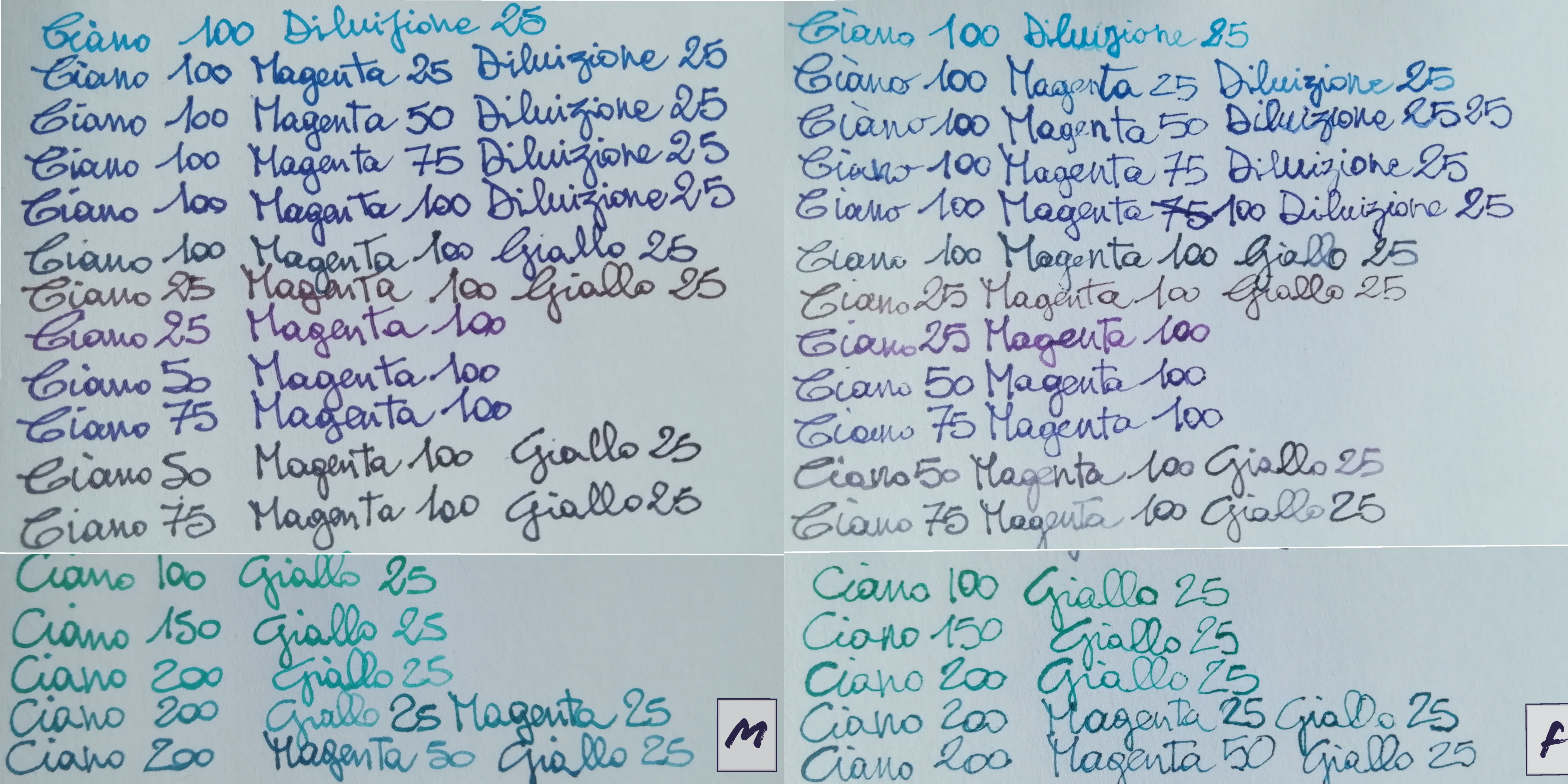 Per ogni miscela ho fatto una prova per intinzione sia con pennino medio che con pennino fine. Non avendo pennini ad intinzione, ho usato due stilo (cosa che per il pennino fine si è rivelata piuttosto... seccante).