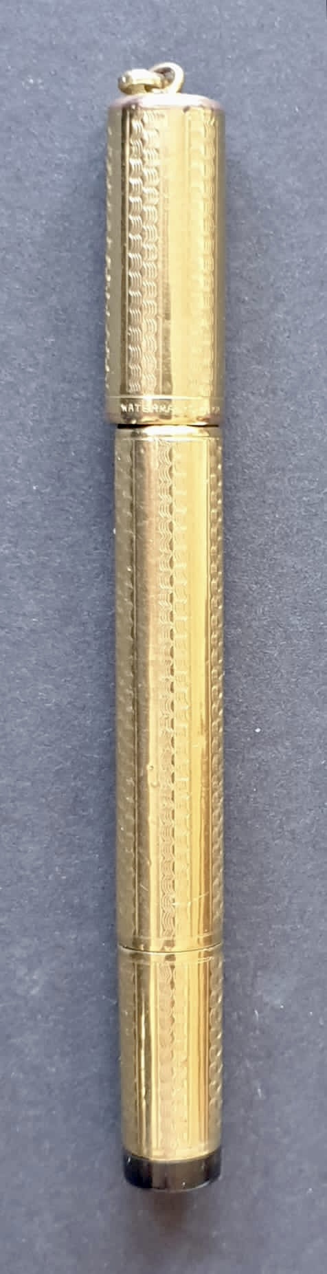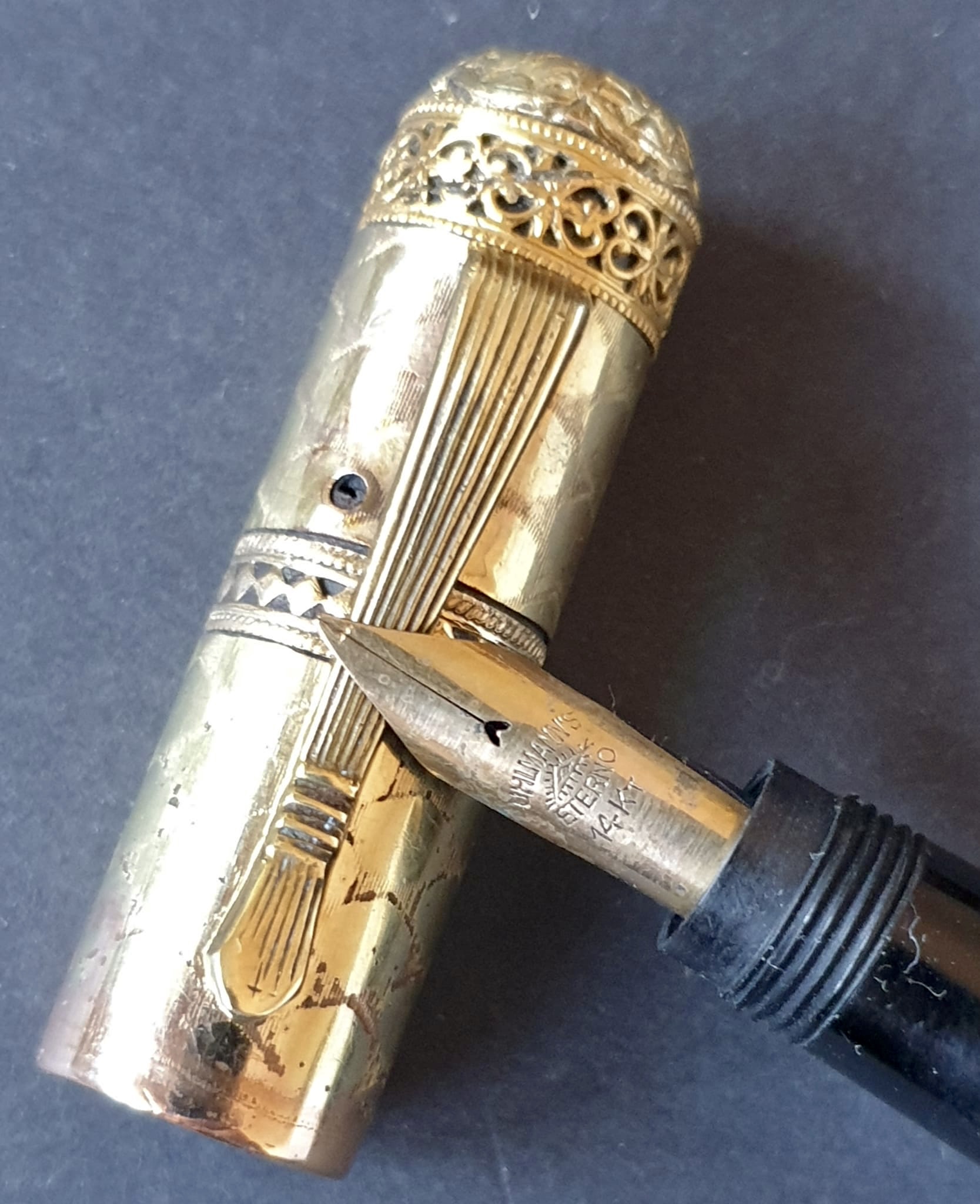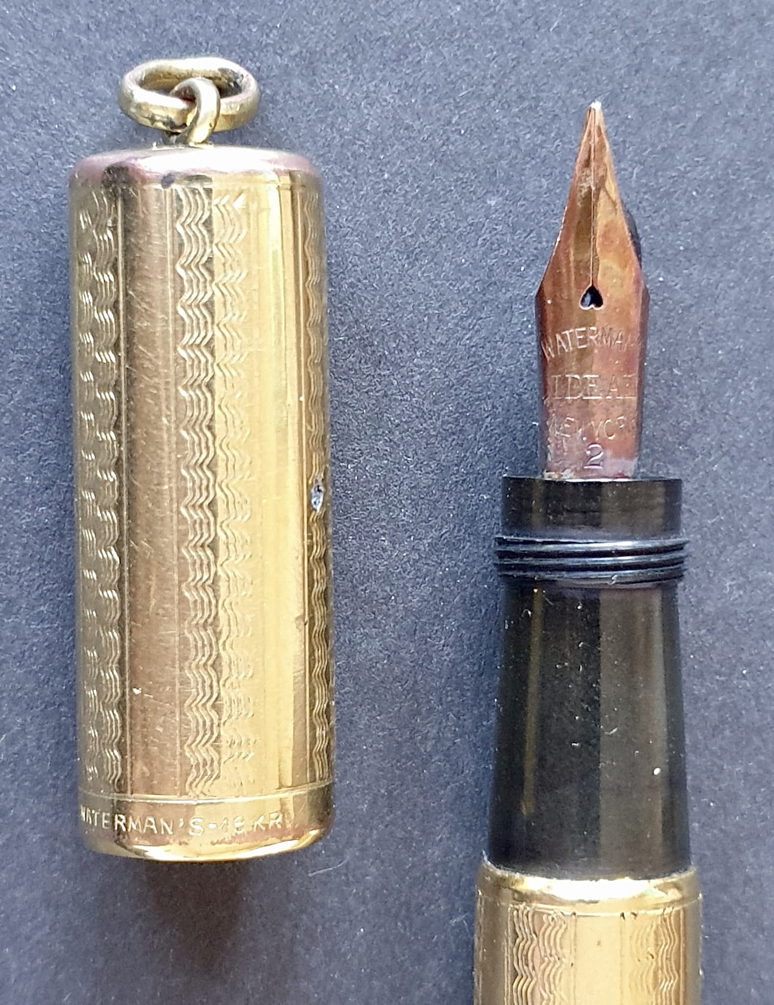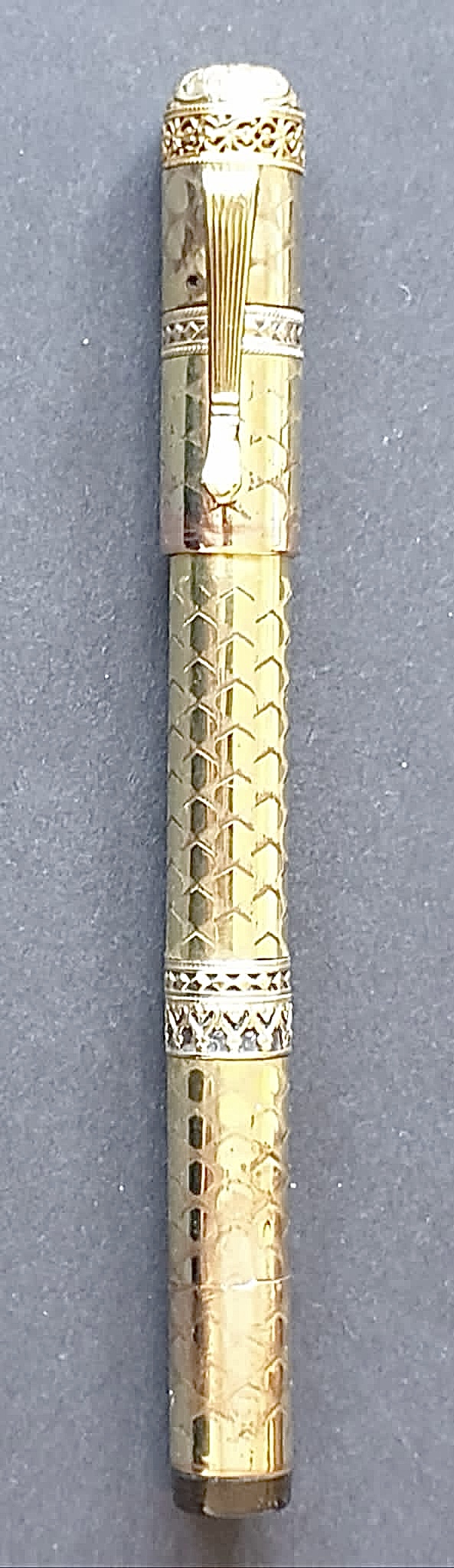 Una Waterman's 42 ed una Uhlmann's Eterno piuttosto rare, con decorazione su tutto il rivestimento, sino al codolo. Nell'americana si nota il filetto corto, tipico delle prime importate in Italia.