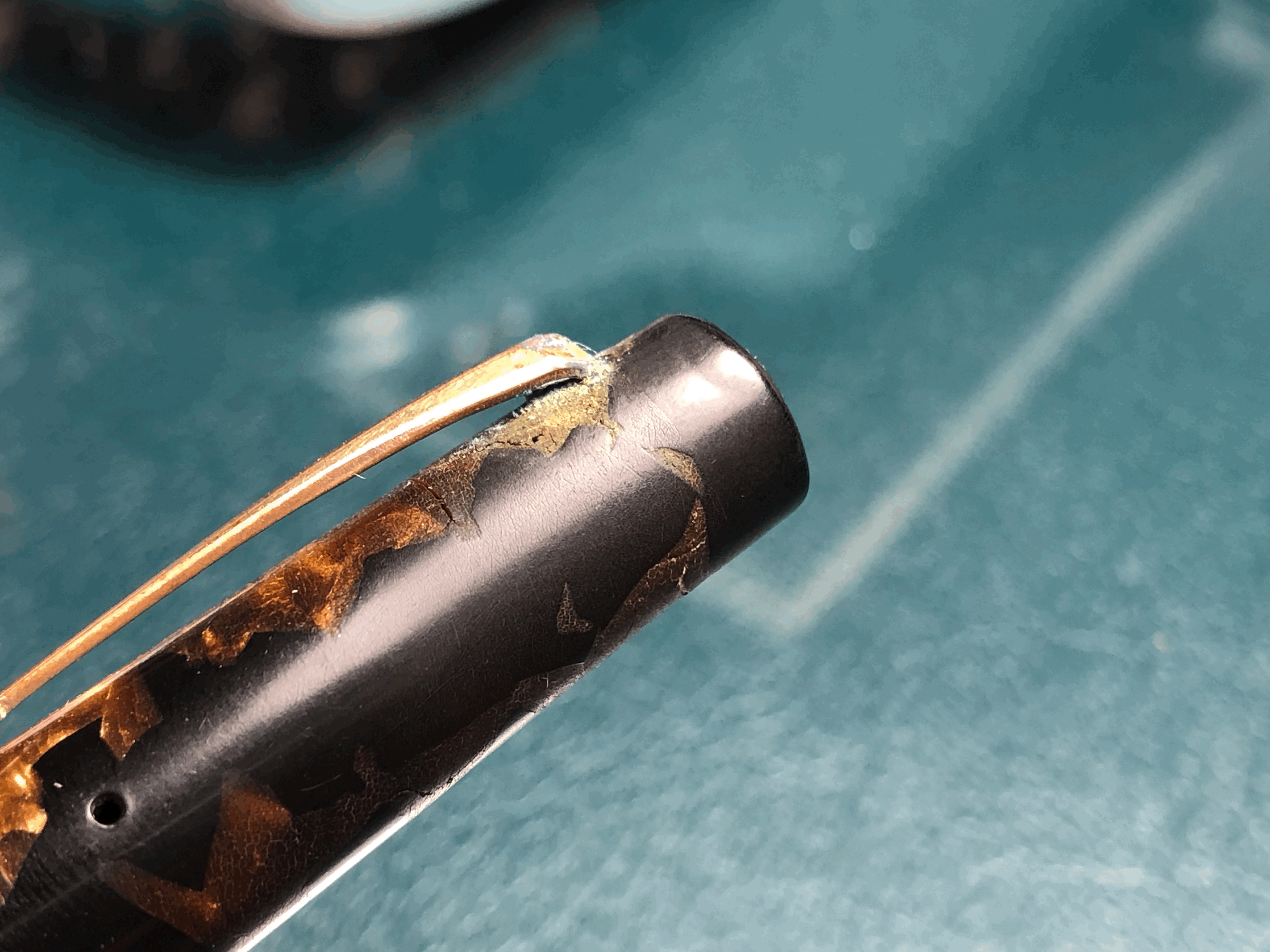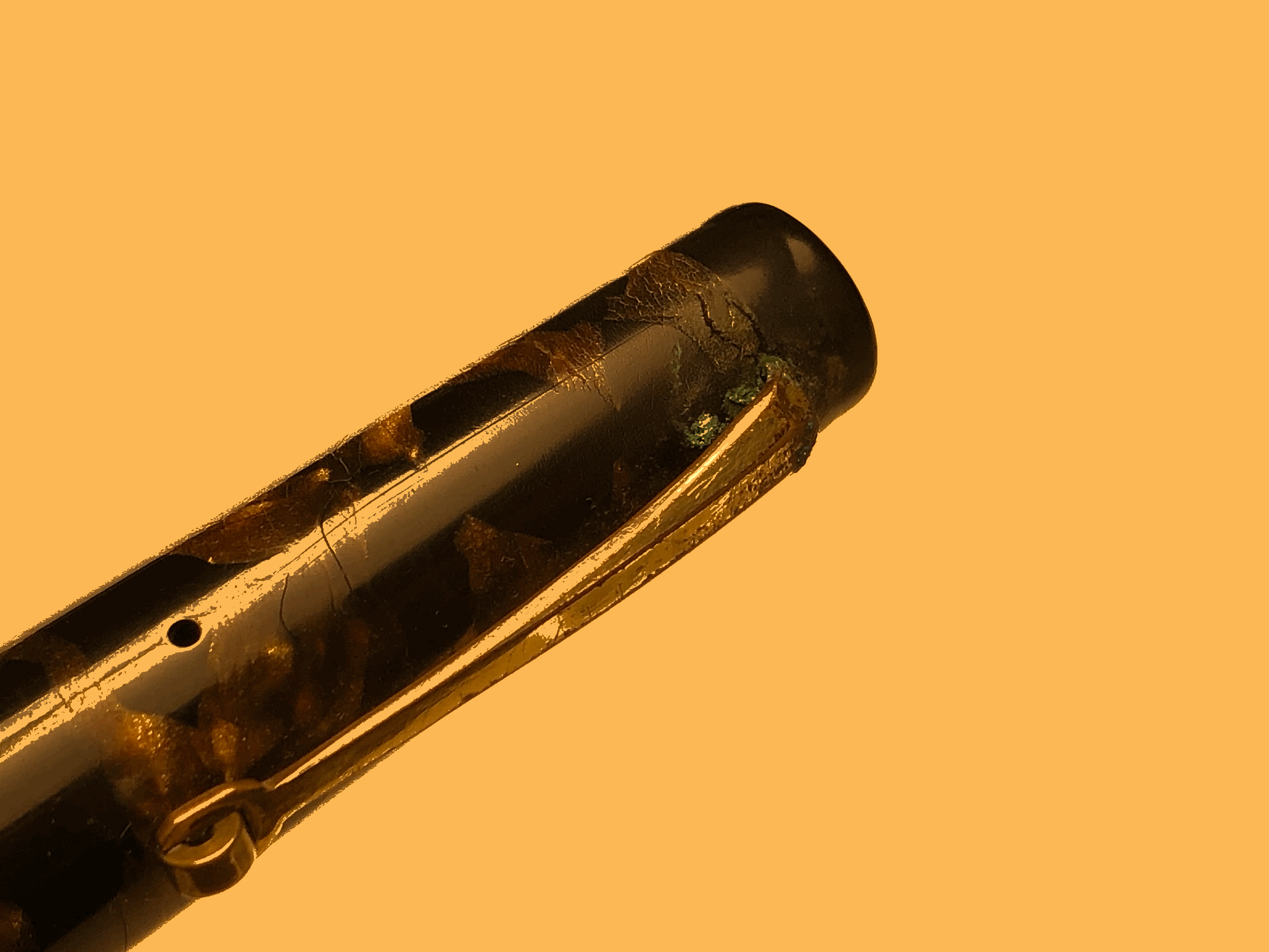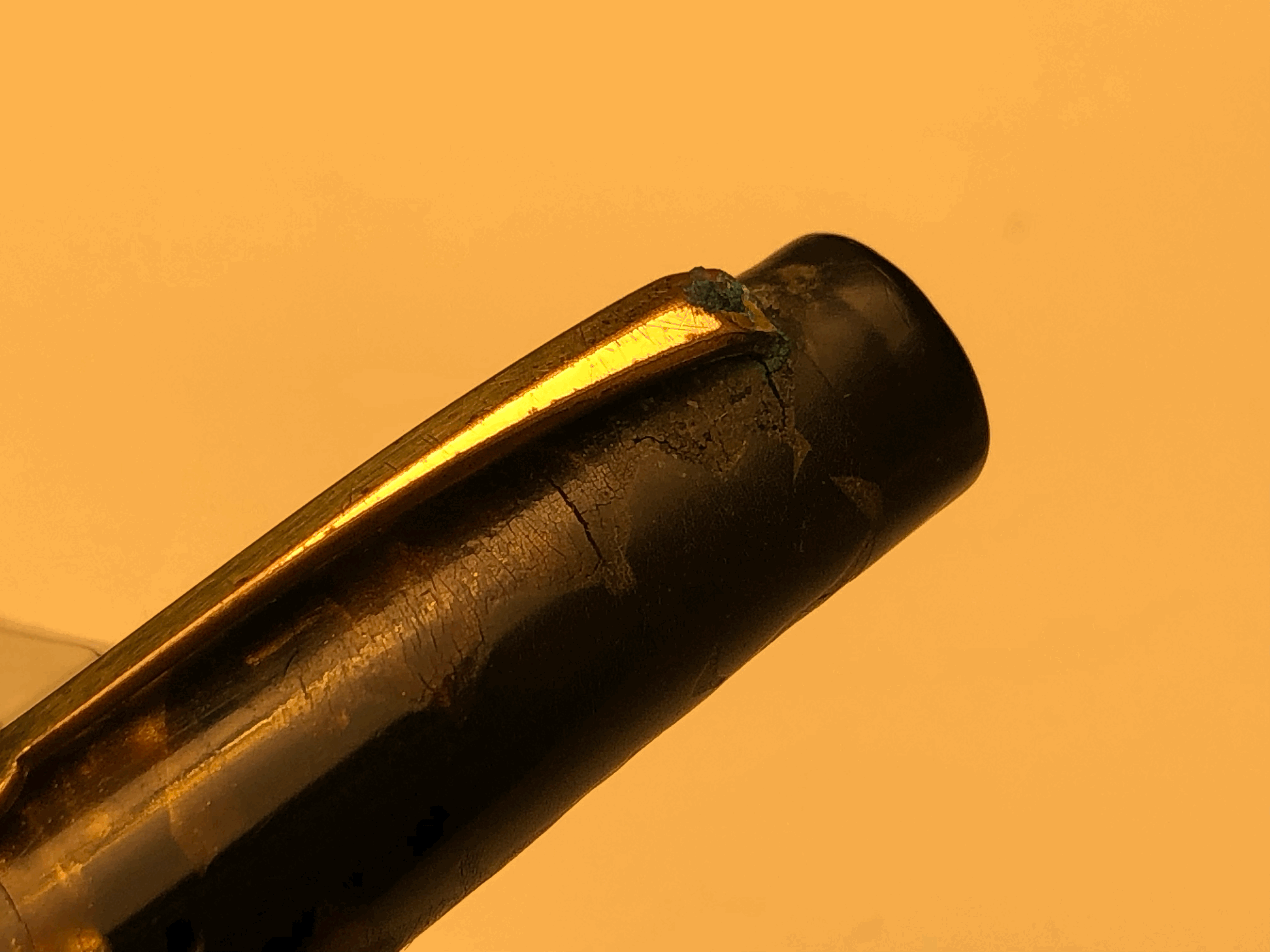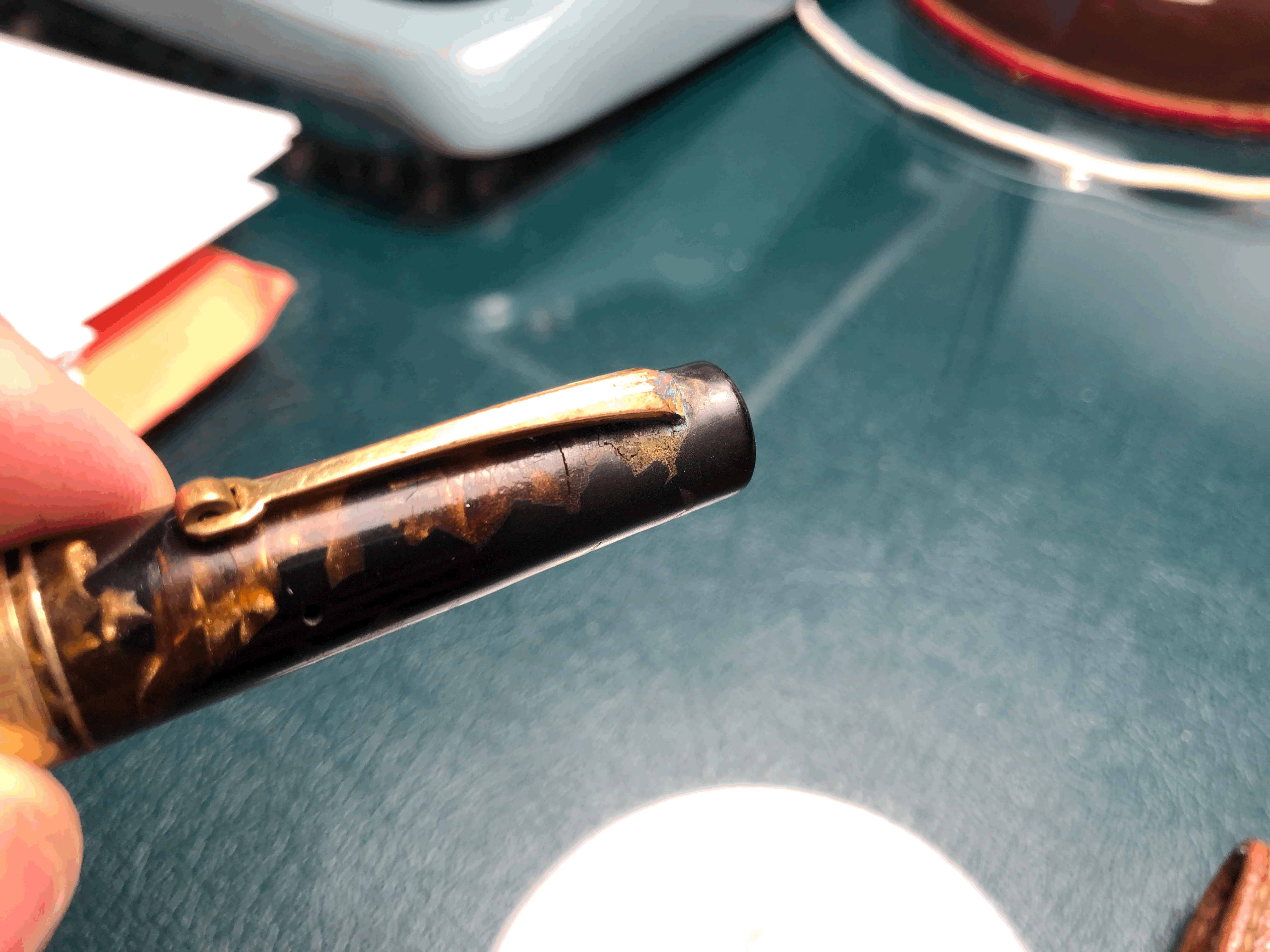 Alcuni dettagli: il cappuccio ha due scheggiature sul bordino, un grande classico dato il suo spessore, quelle so che sono riparabilissime. Sulla parte alta del cappuccio è presente il problema grave, infatti vi sono una decina di crepe dovute al restringimento del materiale; vi sono molte microfratture in solo alcune zone però, ovvero in tutte quella macchie marroni, le parti colorate per intenderci, mentre le parti più nere sono intatte e sembrano essere a posto. Dico che sembrano essere a posto anche perché raschiando leggermente con una piccola lama per togliere via dei residui di ossido azzurri ho notato che il filo della lama raschiava via una polvere di celluloide solo da quella zone, sulle nere non viene via nessuna polverina. Se vado a raschiare lievemente su parti nere, sul fusto della penna, sui fondelli del fusto e del cappuccio questo non accade. In particolare nelle foto si nota che sotto la clip c'è una porzione di celluloide marrone molto opaca e porosa, quella sembra essere la zona peggiore.