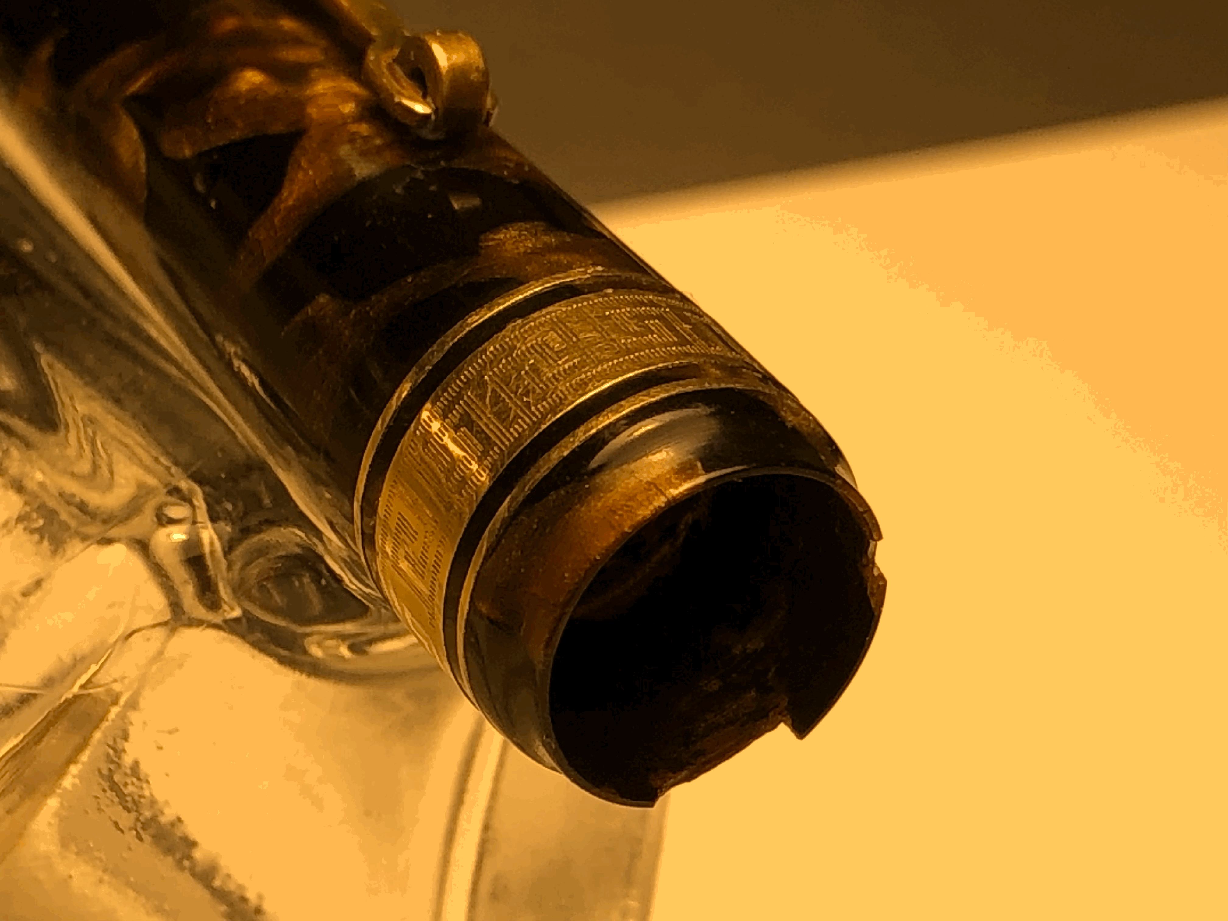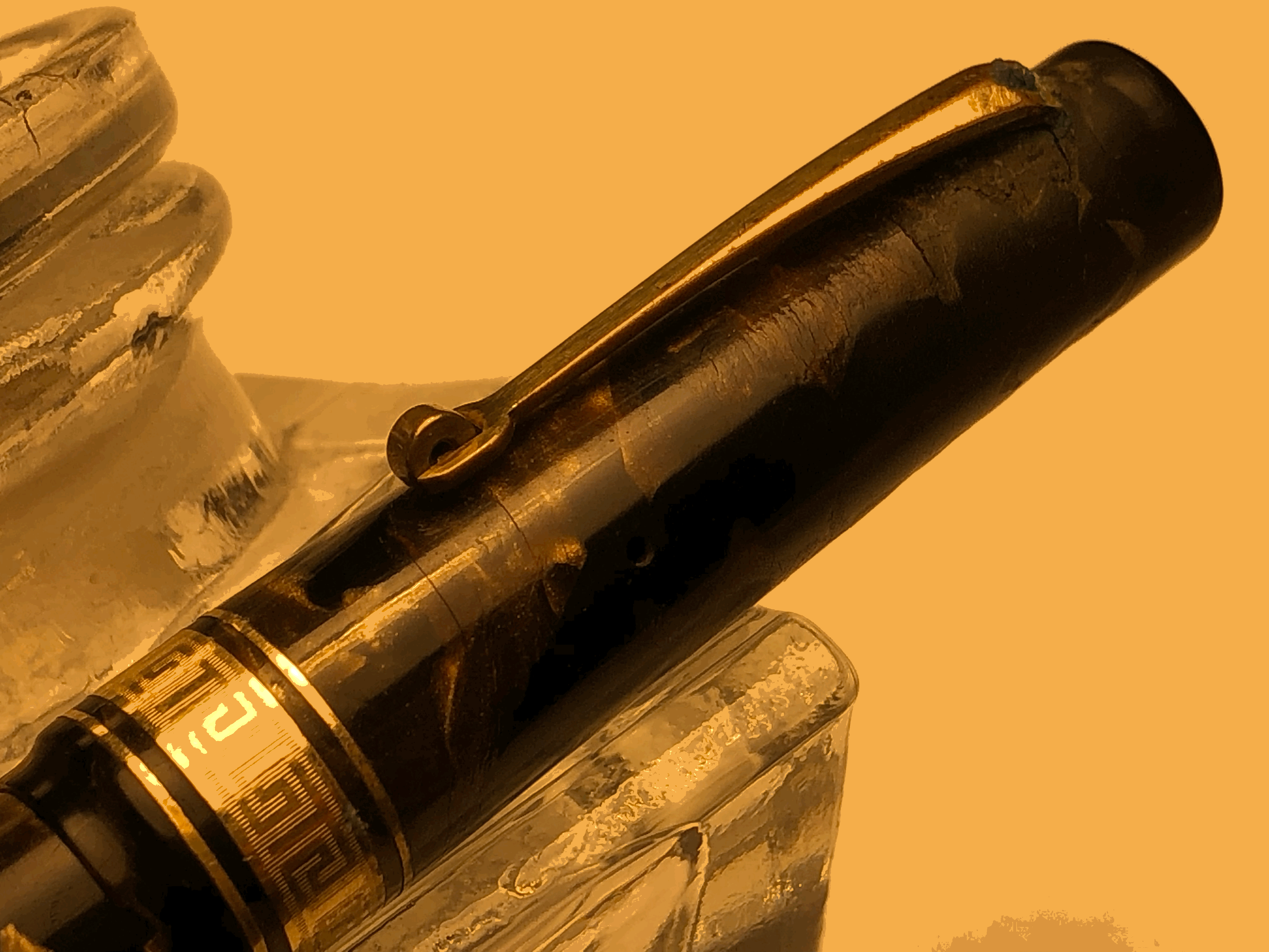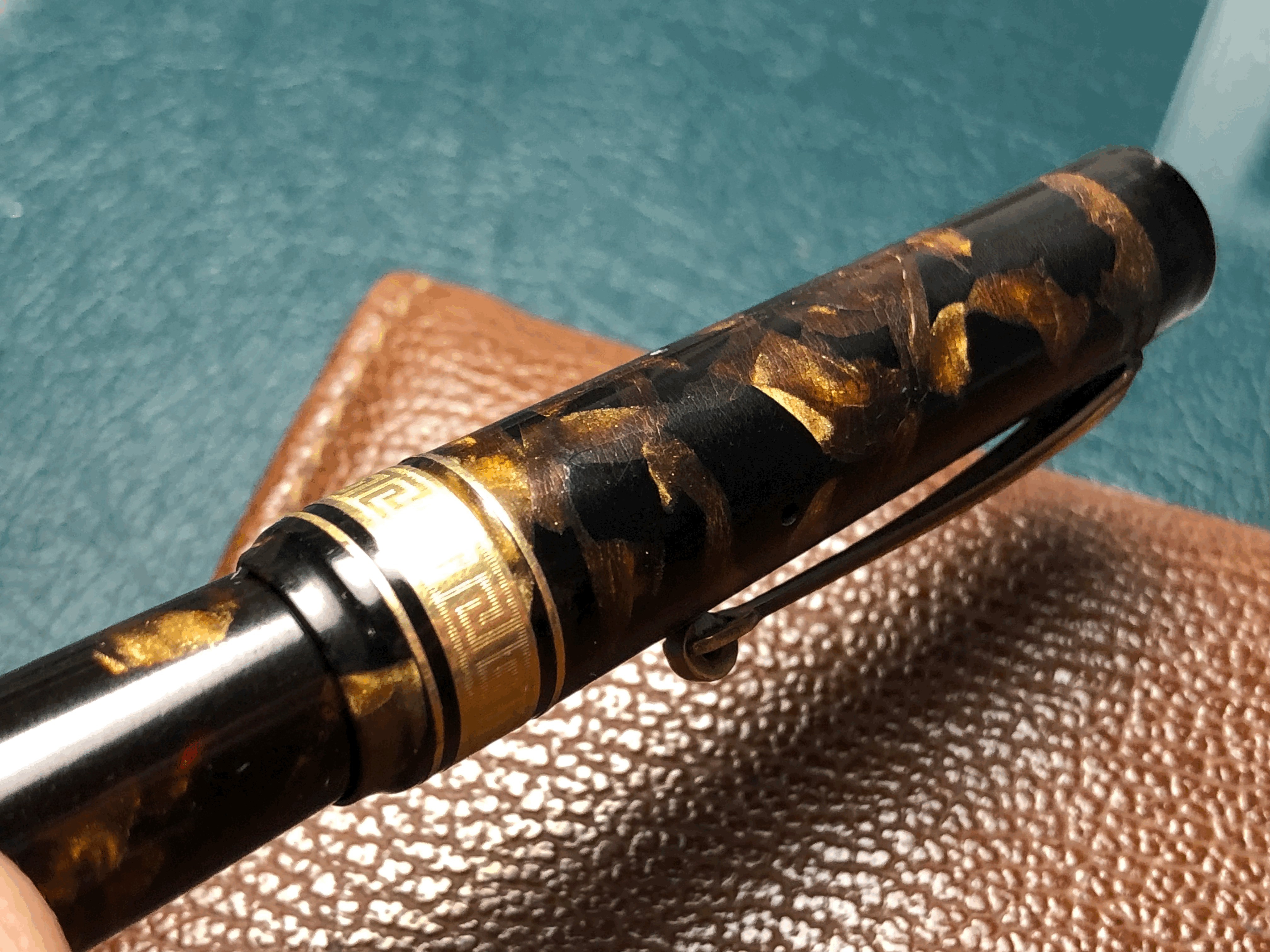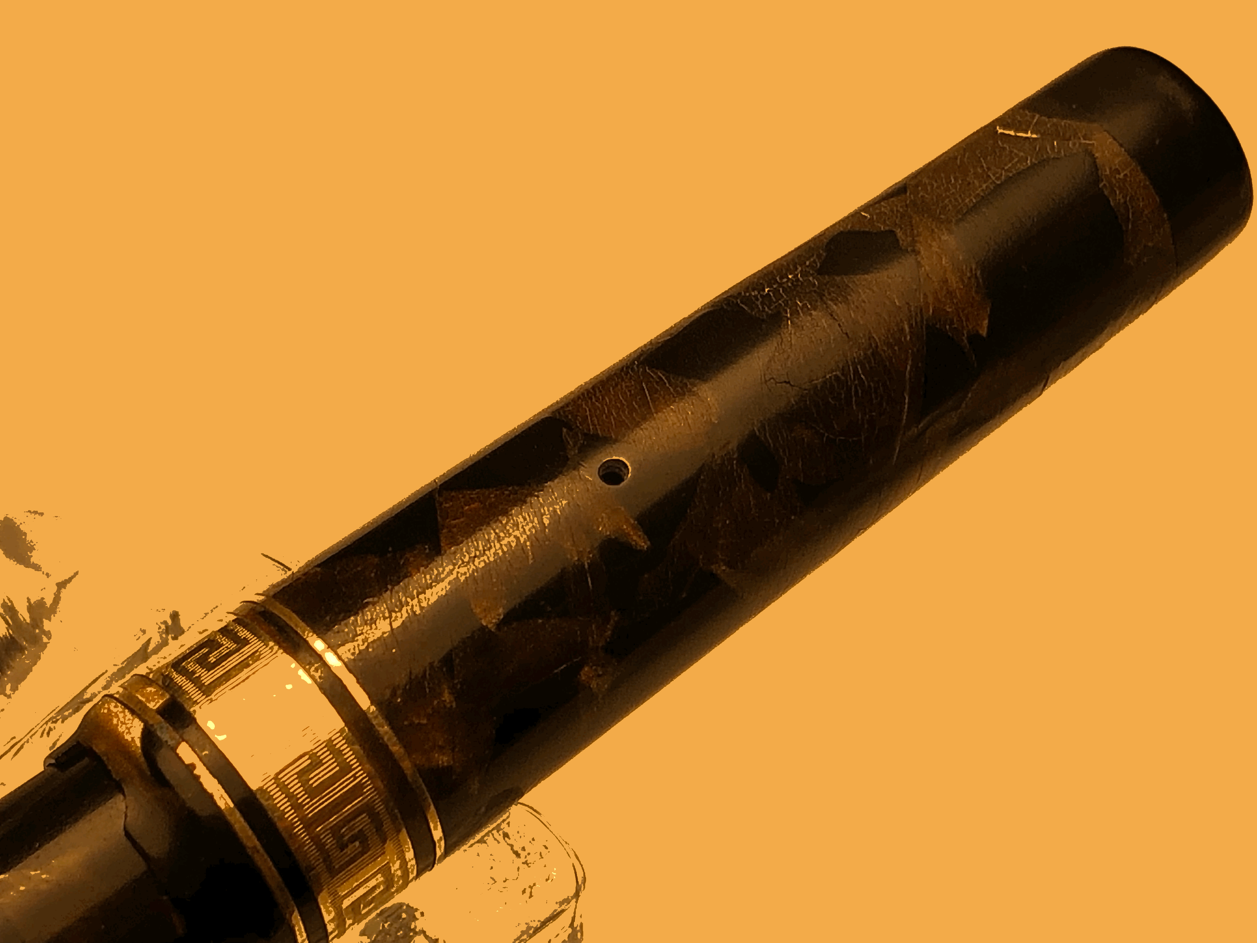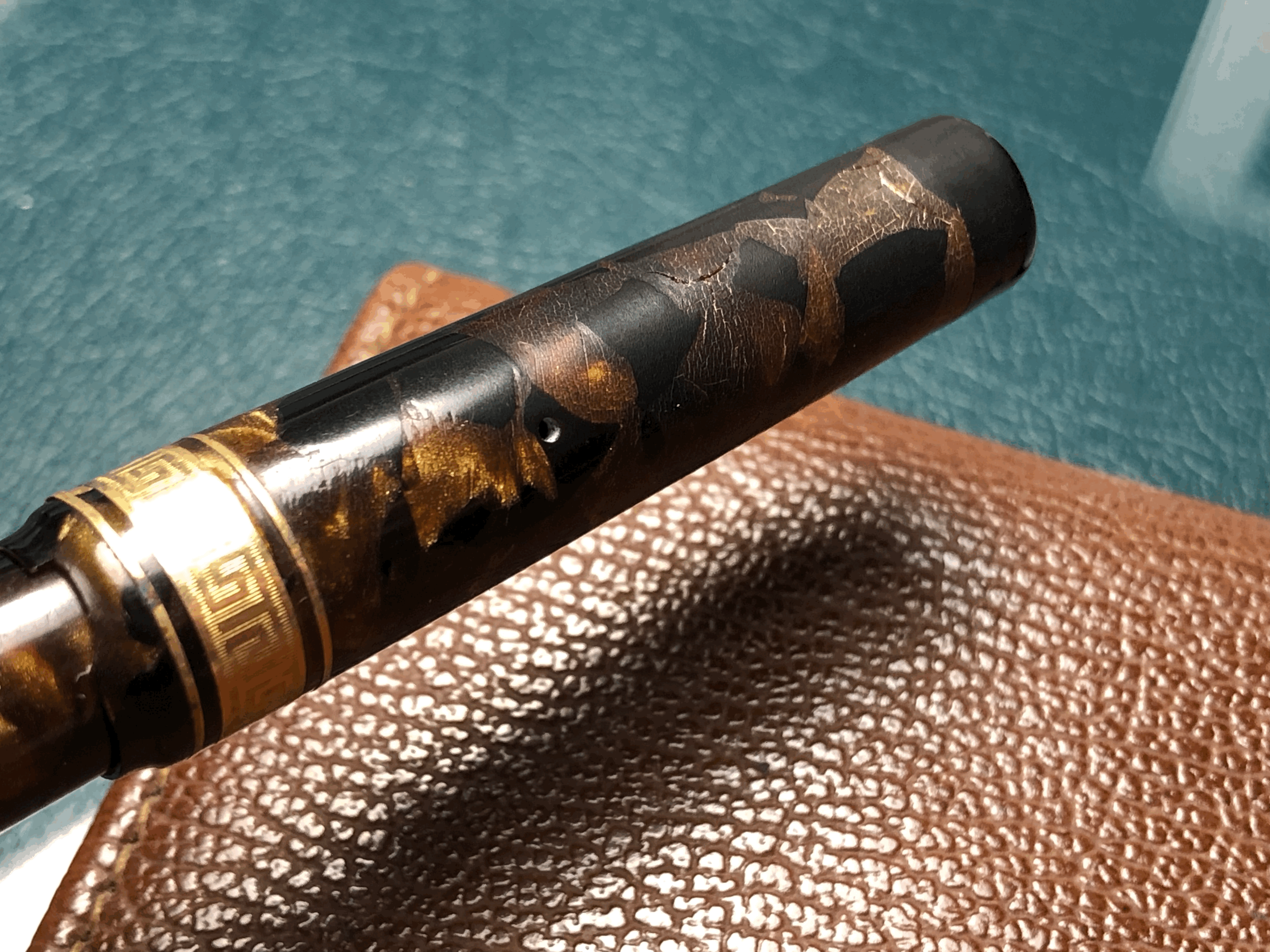 Alcuni dettagli: il cappuccio ha due scheggiature sul bordino, un grande classico dato il suo spessore, quelle so che sono riparabilissime. Sulla parte alta del cappuccio è presente il problema grave, infatti vi sono una decina di crepe dovute al restringimento del materiale; vi sono molte microfratture in solo alcune zone però, ovvero in tutte quella macchie marroni, le parti colorate per intenderci, mentre le parti più nere sono intatte e sembrano essere a posto. Dico che sembrano essere a posto anche perché raschiando leggermente con una piccola lama per togliere via dei residui di ossido azzurri ho notato che il filo della lama raschiava via una polvere di celluloide solo da quella zone, sulle nere non viene via nessuna polverina. Se vado a raschiare lievemente su parti nere, sul fusto della penna, sui fondelli del fusto e del cappuccio questo non accade. In particolare nelle foto si nota che sotto la clip c'è una porzione di celluloide marrone molto opaca e porosa, quella sembra essere la zona peggiore.