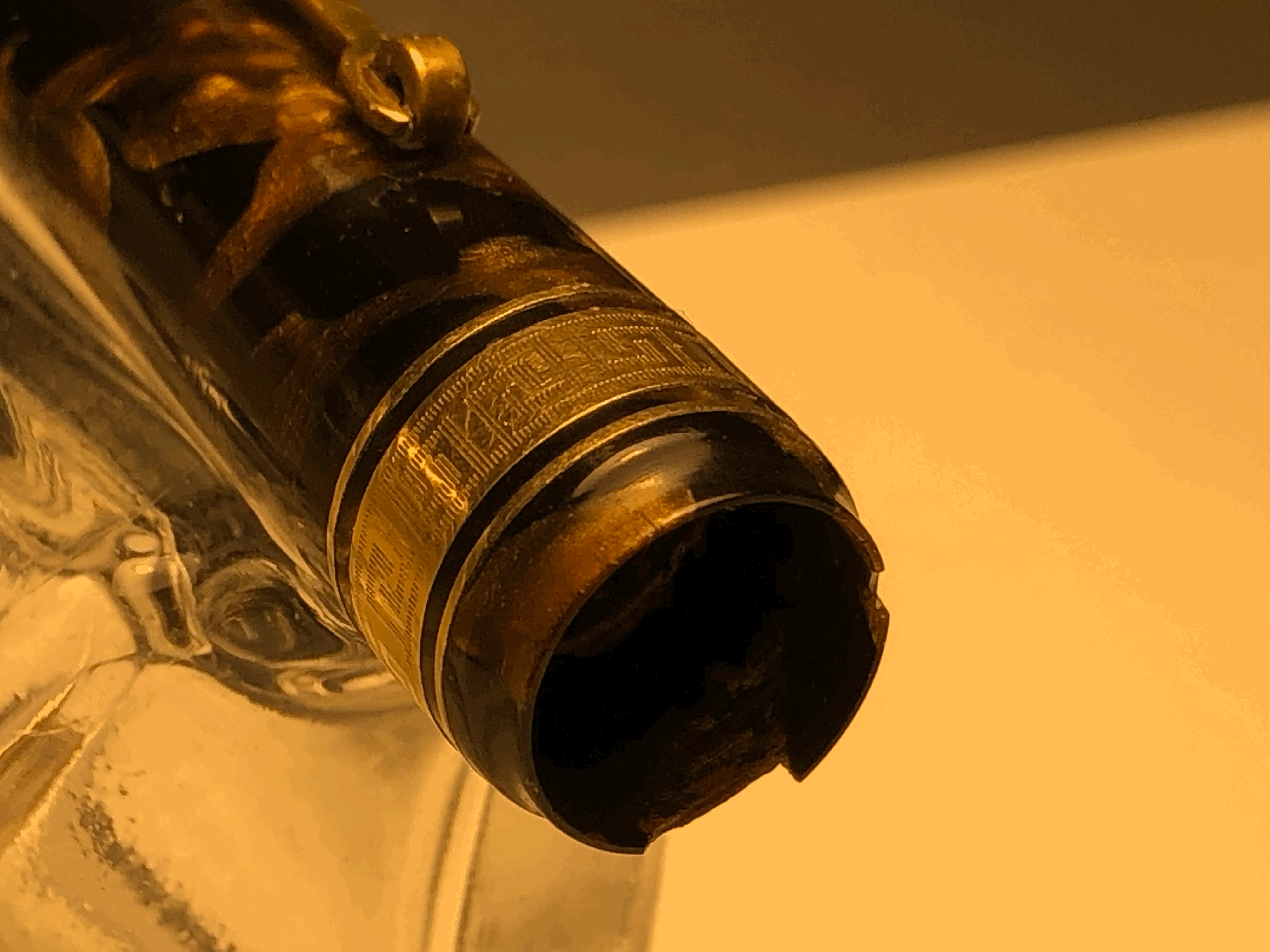 ieri ho acquistato, forse un pò impulsivamente, questa Omas Lucens. Ho notato subito che il cappuccio era pieno di crepe e non mi è sembrata una buona cosa. Ho comunque visto restauri davvero straordinari su questo forum e per questo ero fiducioso che qualcosa si potesse fare, quindi ho comprato.