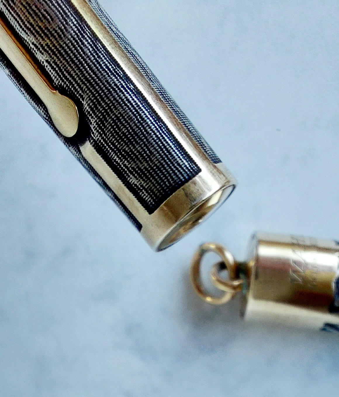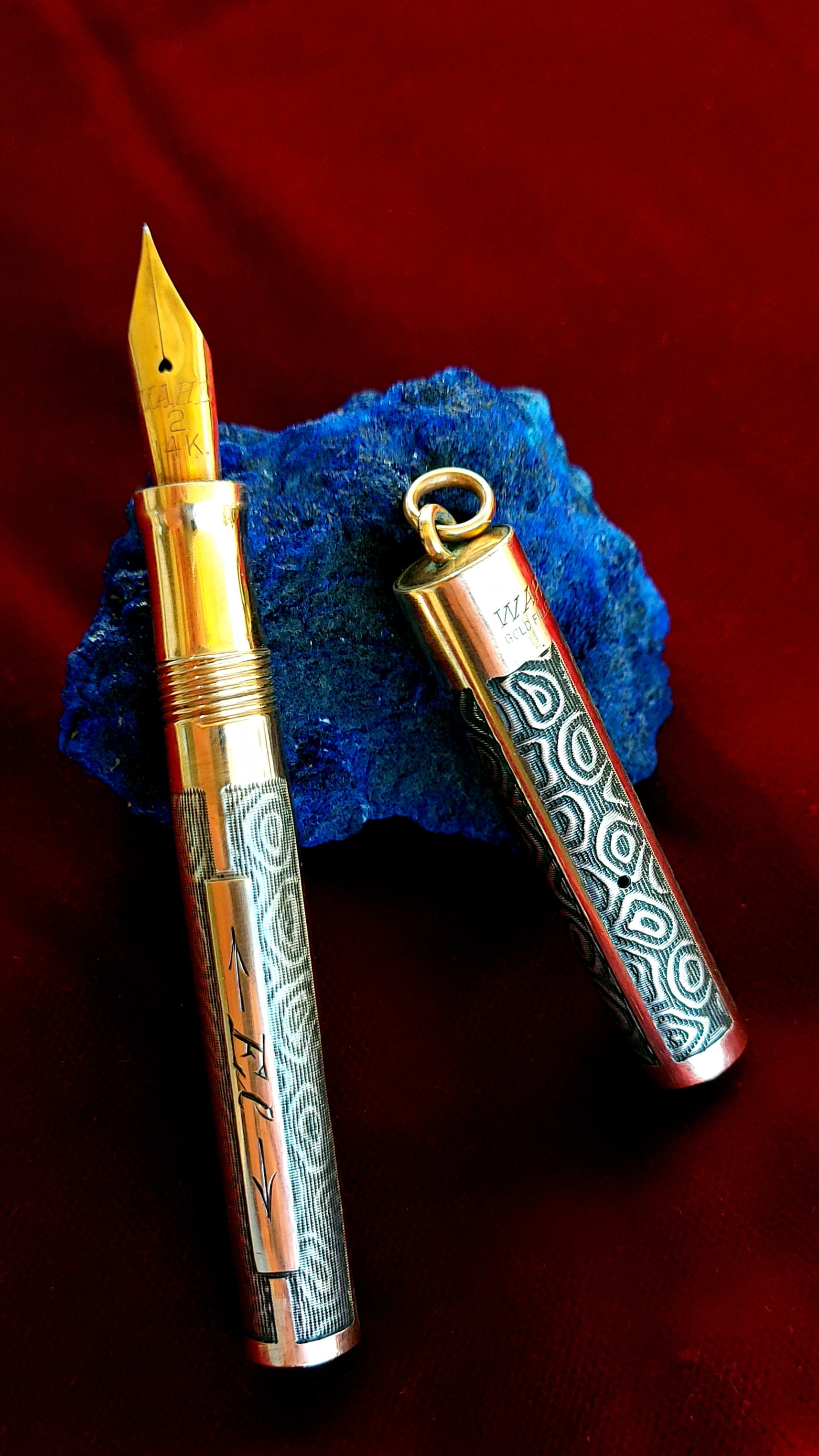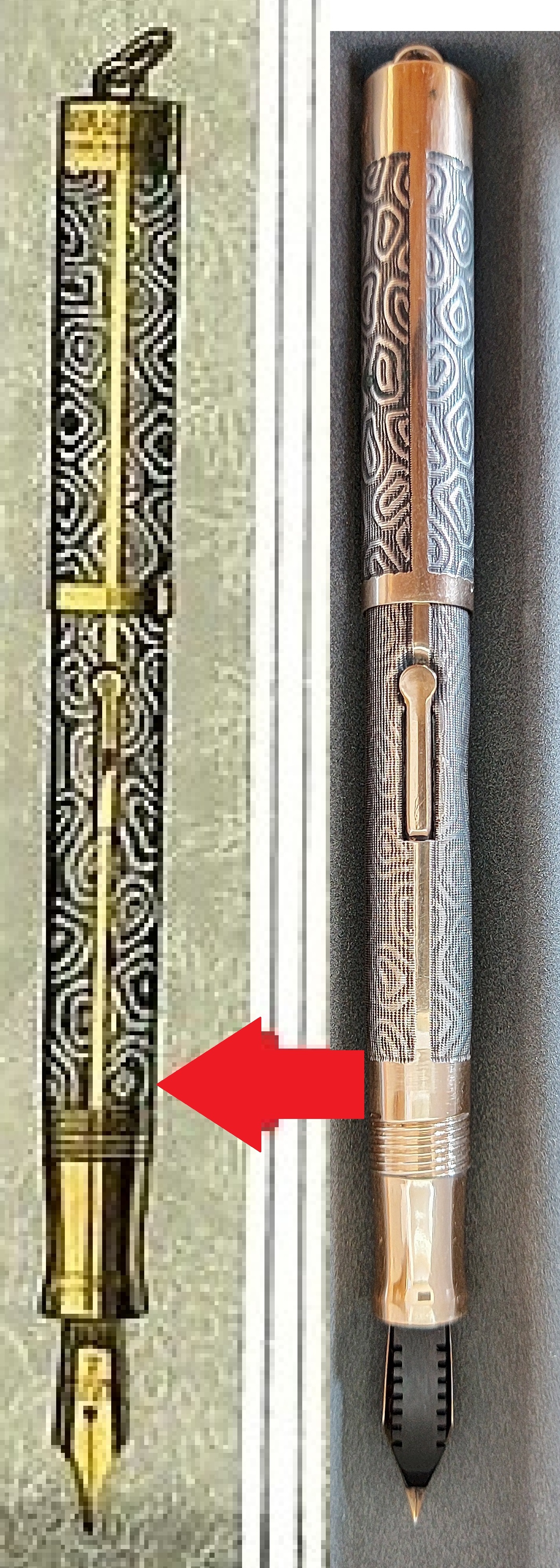 Pur potendo anche apparire come un effetto voluto dal costruttore, dalle pochissime penne consultabili in rete (tutte piuttosto “lisce”, e uniformemente) si direbbe invece che possa trattarsi di semplice “usura”, anche se sul mio esemplare l’altezza del decoro sulle due parti della penna è, come detto, diversa ma assolutamente omogenea, e non vi sono punti più o meno spessi di decorazione sul singolo elemento, nemmeno dove lo sfregamento di metallo su metallo è avvenuto certamente e con frequenza (ad es. sul fondello per la parte che accoglie il cappuccio calzato).