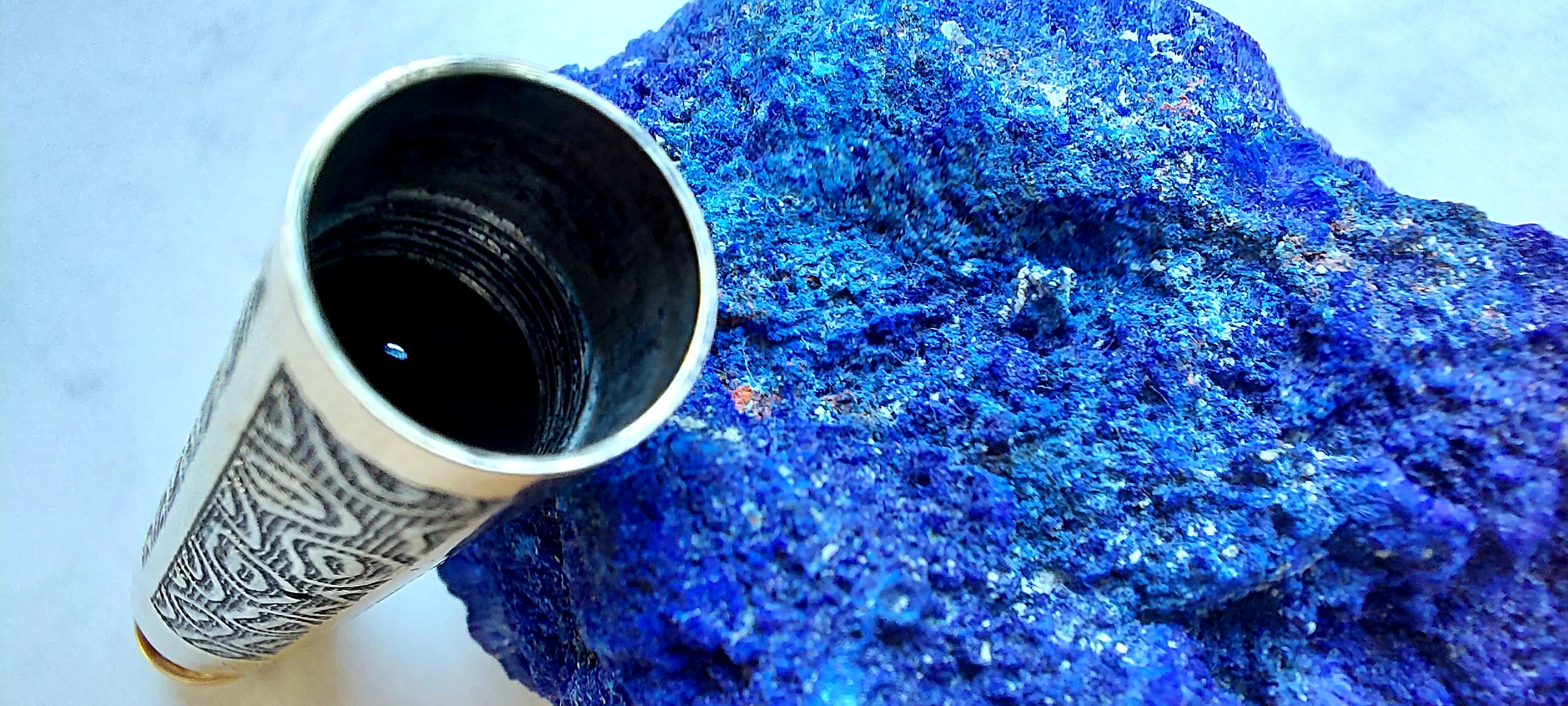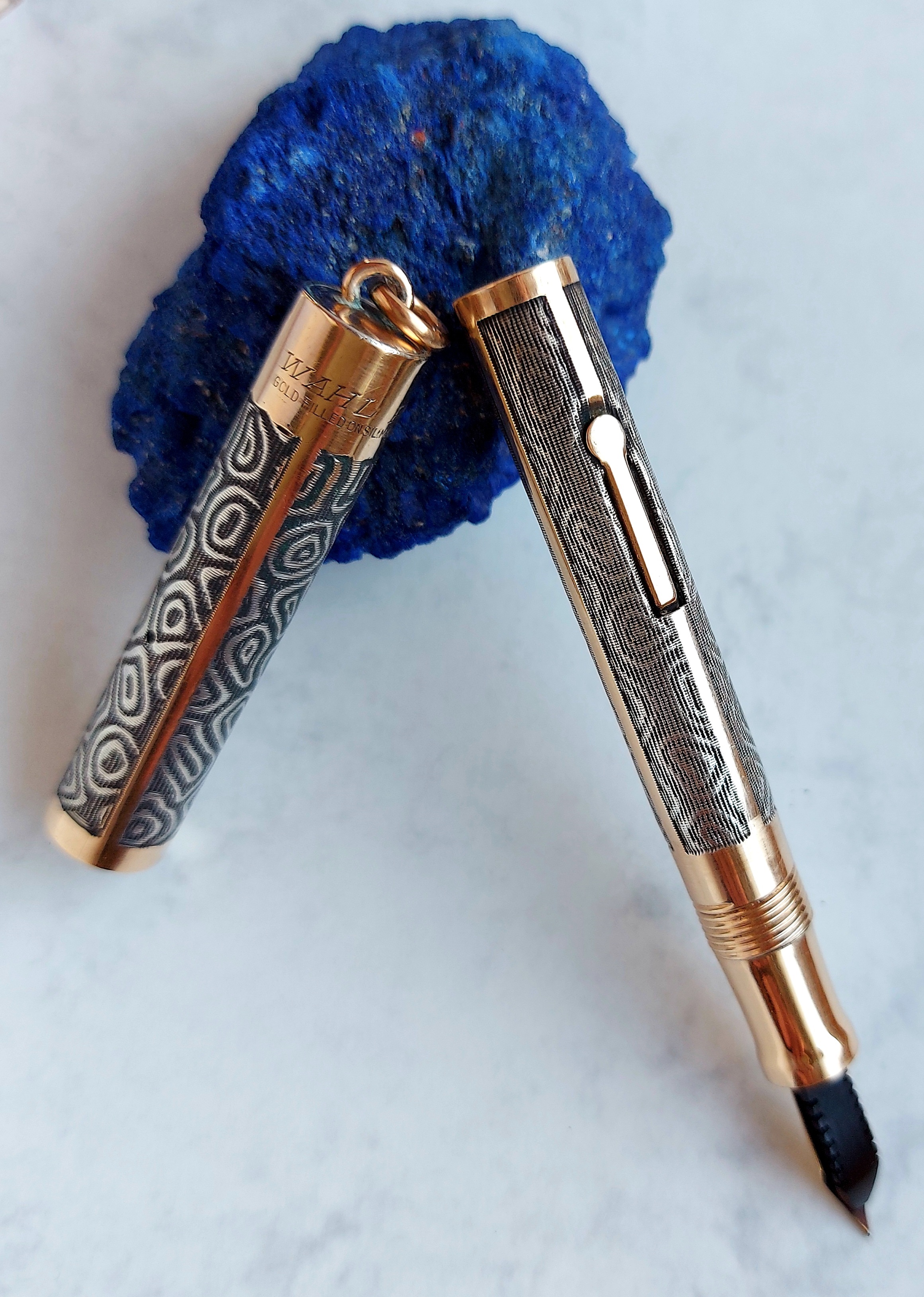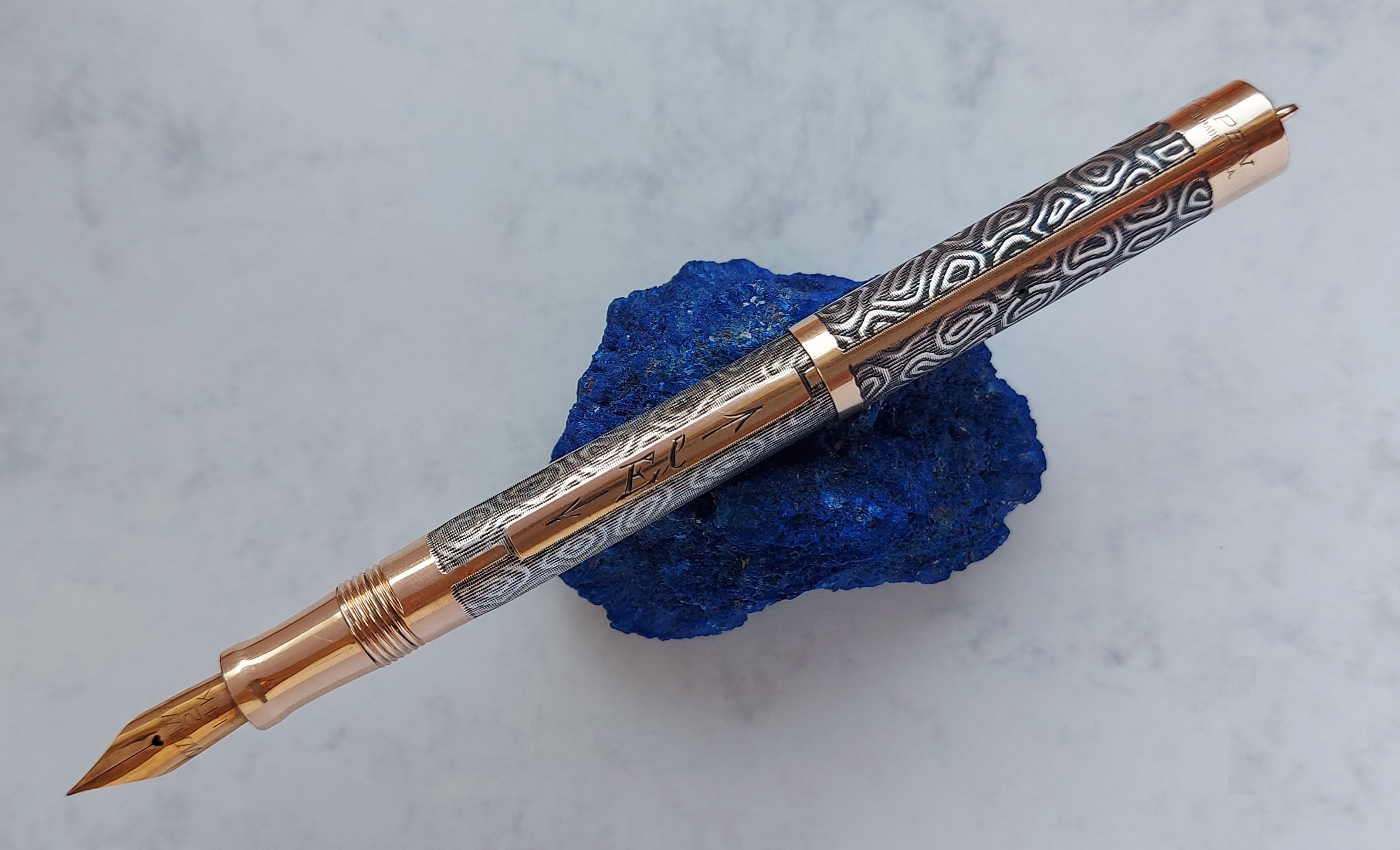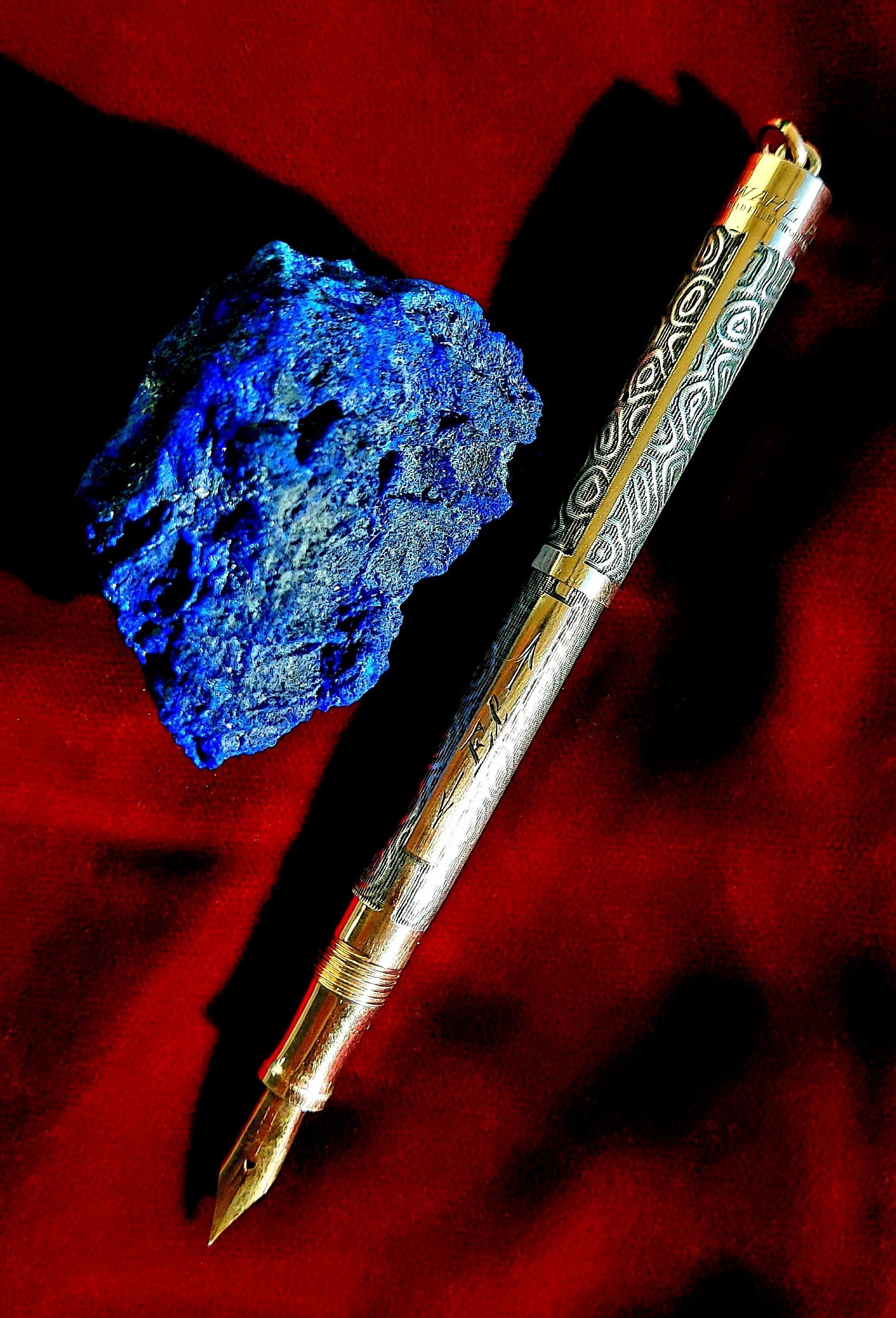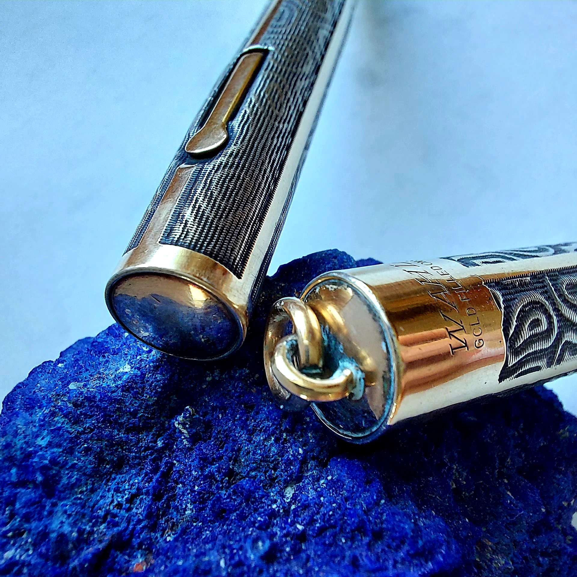 Per quanto riguarda il decoro (“Niagara” design, pattern), tanto prezioso quanto inusuale nel panorama pennistico, nella pagina allegata si apprende trattarsi di un «rivestimento in oro giallo 12K su argento massiccio [vermeil]. Parte della lamina d’oro veniva poi tagliata via e la superficie d’argento liberata veniva quindi lavorata [“Engine turned”] a macchina [quella apposita per il guilloché, per ottenere le caratteristiche isole di materiale]».