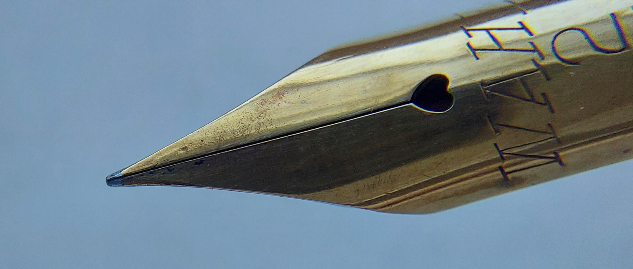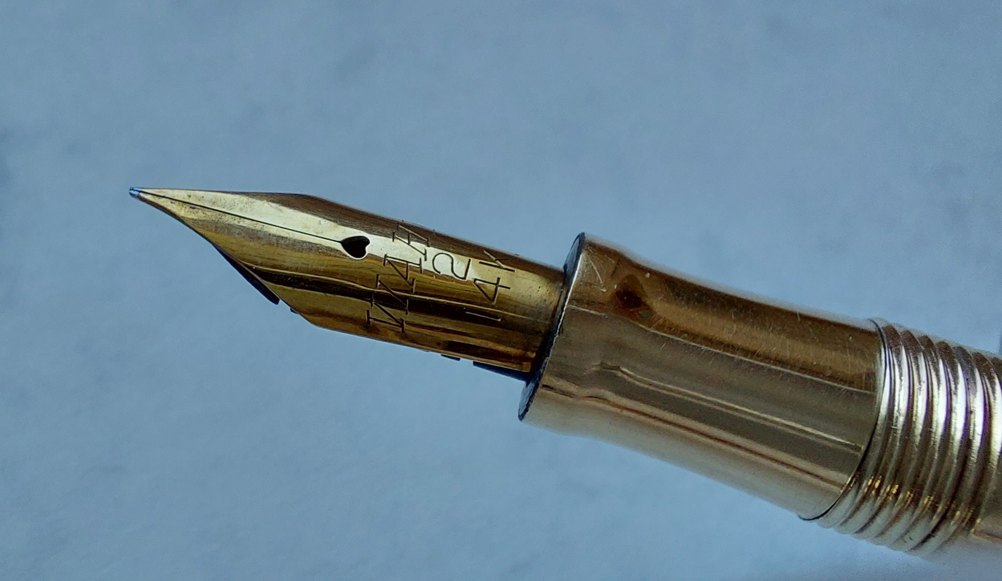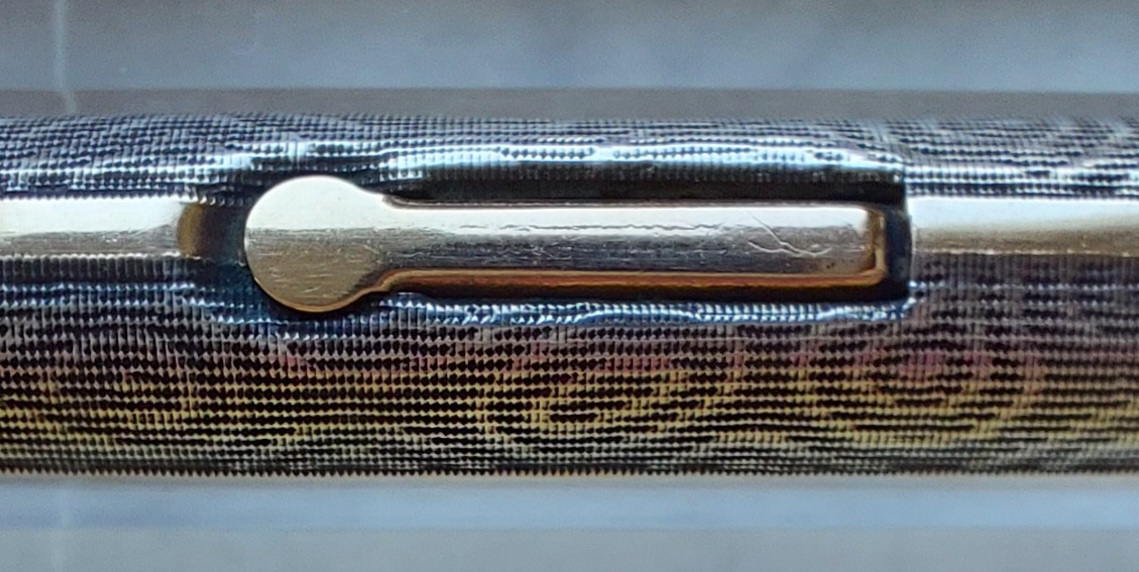Pur potendo anche apparire come un effetto voluto dal costruttore, dalle pochissime penne consultabili in rete (tutte piuttosto “lisce”, e uniformemente) si direbbe invece che possa trattarsi di semplice “usura”, anche se sul mio esemplare l’altezza del decoro sulle due parti della penna è, come detto, diversa ma assolutamente omogenea, e non vi sono punti più o meno spessi di decorazione sul singolo elemento, nemmeno dove lo sfregamento di metallo su metallo è avvenuto certamente e con frequenza (ad es. sul fondello per la parte che accoglie il cappuccio calzato).