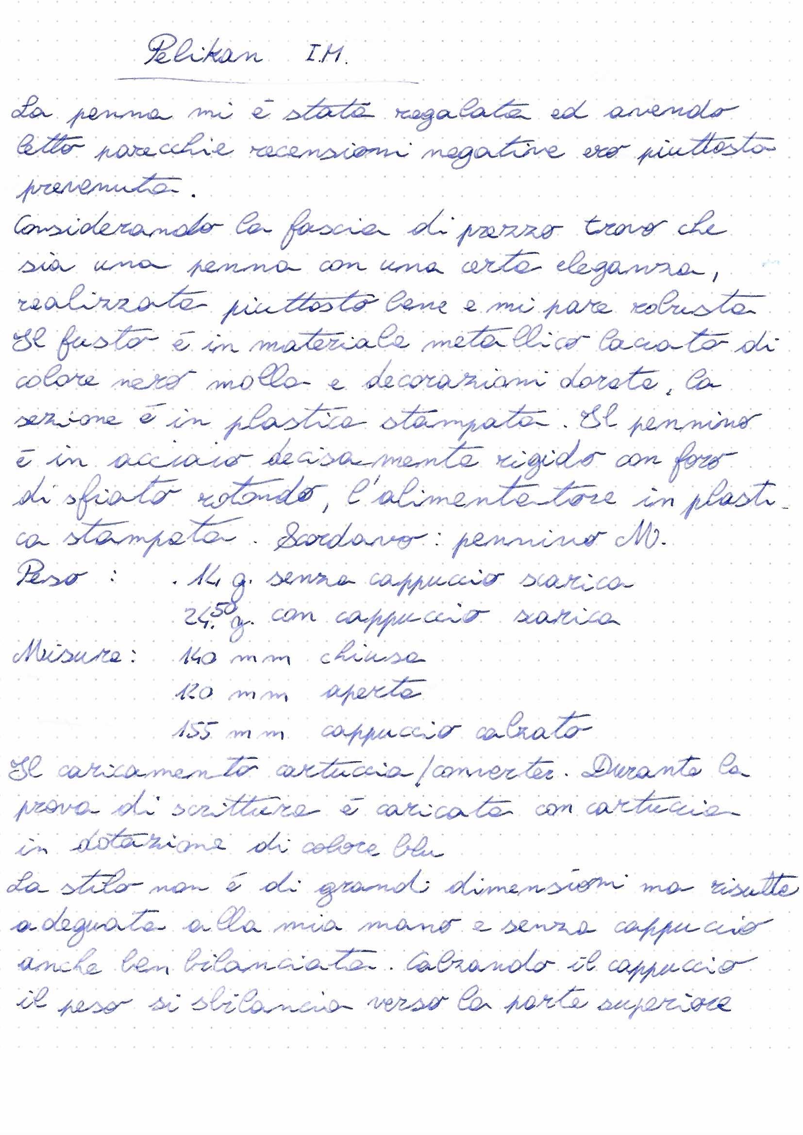 Avendo letto diverse recensioni che ponevano in luce difetti da me non rilevati forse risolti o forse per avere ricevuto un esemplare fortunato, ho voluto scrivere alcune righe che vorrei allegare insieme a qualche foto. Inserendo la stilografica nella propria fascia di mercato mi sento di spezzare una lancia in suo favore. questo come diceva Rino Tommasi è il mio personale cartellino e nulla più! La carta è Rhodia e la pessima calligrafia non è da imputare al pennino ma esclusivamente a me.