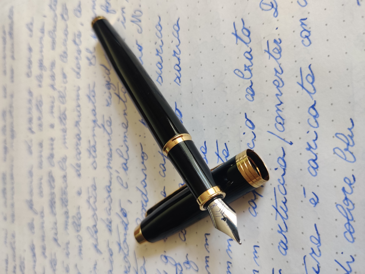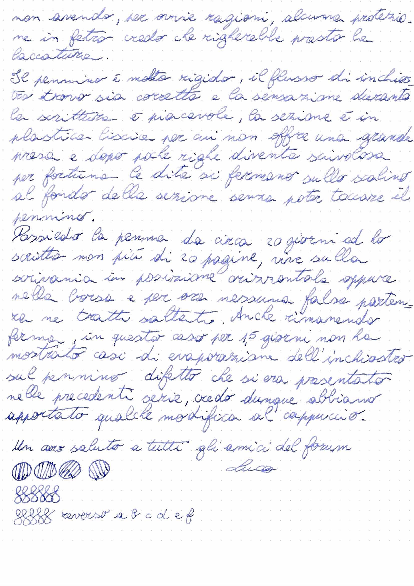 Avendo letto diverse recensioni che ponevano in luce difetti da me non rilevati forse risolti o forse per avere ricevuto un esemplare fortunato, ho voluto scrivere alcune righe che vorrei allegare insieme a qualche foto. Inserendo la stilografica nella propria fascia di mercato mi sento di spezzare una lancia in suo favore. questo come diceva Rino Tommasi è il mio personale cartellino e nulla più! La carta è Rhodia e la pessima calligrafia non è da imputare al pennino ma esclusivamente a me.![]()