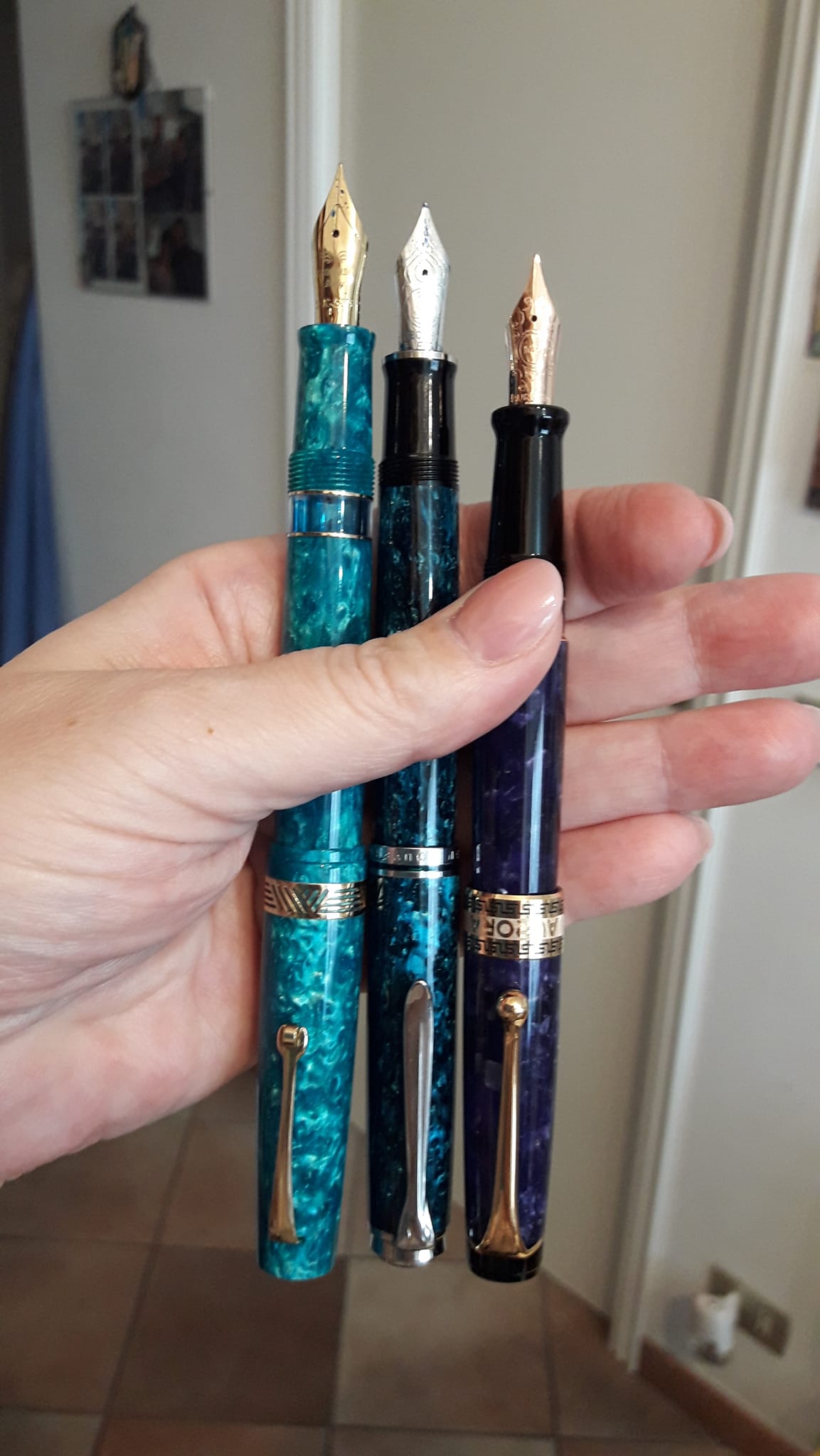 Maruska ha scritto: sabato 2 luglio 2022, 13:21 Ecco un bel trio di penne: da sinistra a destra Leonardo Momento Magico Emerald; Pelikan M805 Ocean Swirl; Aurora Optima 996-VL Violet con finiture oro rosa STILOGRAFICHE.jpg