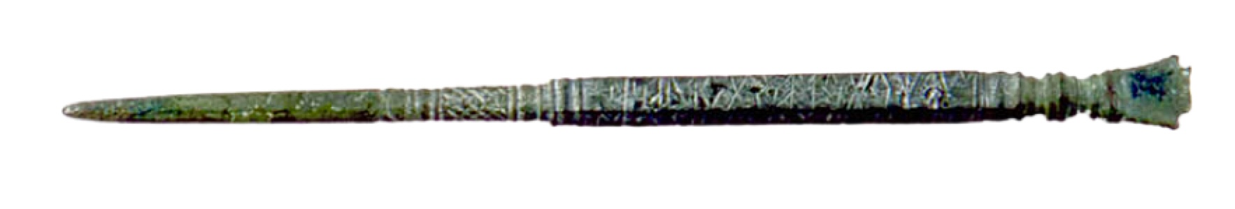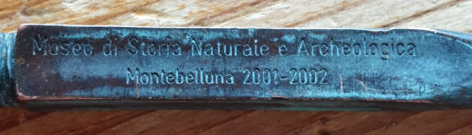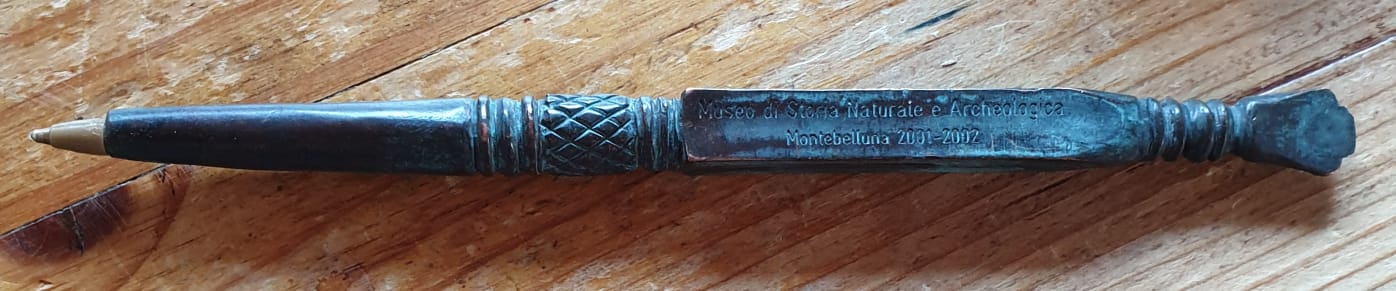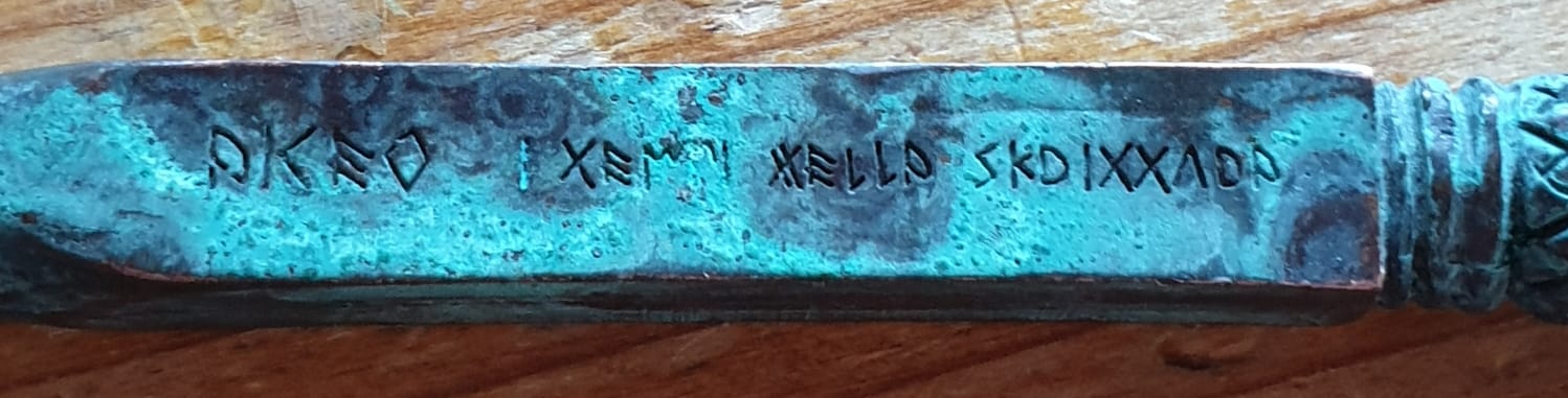 Stilo scrittorio in bronzo a sezione quadrangolare, lungo 19,7 cm, con iscrizione votiva in Venetico (VI - I sec. a.C.), alfabeto ritenuto di matrice etrusca; reperto rinvenuto ad Este (PD), — insieme ad una tavoletta scrittoria, che aggiungo in foto — , e una sua riproduzione, anch’essa in bronzo (con inserimento di contemporanea penna biro), realizzata per la mostra “Akeo. I tempi della scrittura: Veneti antichi. Alfabeti e documenti“ - Museo di Storia Naturale e Archeologica di Montebelluna (TV) 2001-2002. Si noti la parte posteriore, piatta, utilizzata per fare “tabula rasa" sulle tavolette in legno ricoperte di cera, i "fogli" di quel tempo. Mia solo la replica.
