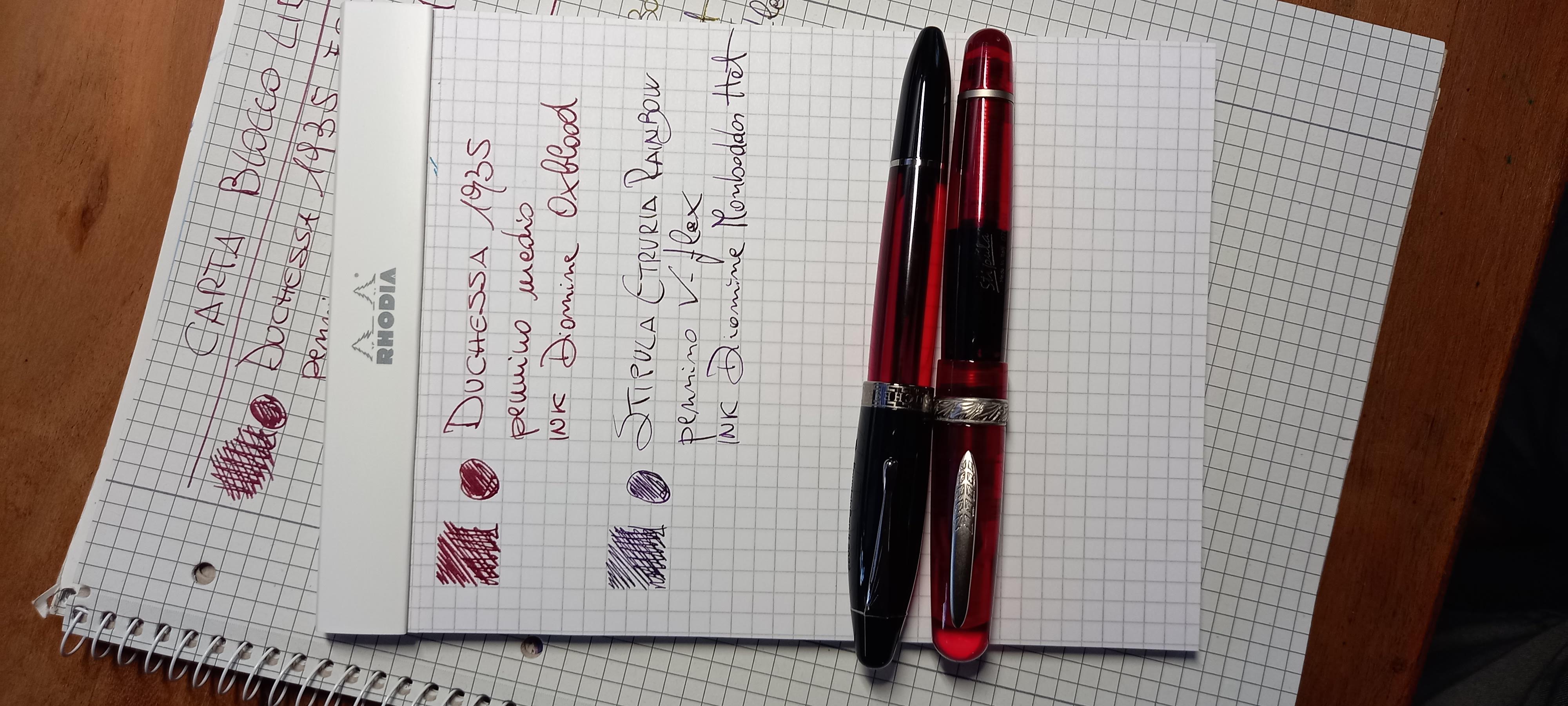 L'ho messa all'opera per ora con quel che avevo sotto mano (Parker blue-black) ed il tratto è bello abbondante, purtroppo non si riesce a leggere la gradazione del pennino. Spero con l'utilizzo (o altro inchiostro) di riuscire ad ottenere una linea un po' più sottile, ma la penna è davvero bella!
