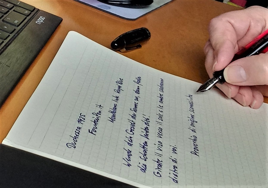 Ho svuotato la DUchessa e l'ho ricaricata con inchiostro AUrora nero: va meglio, un po' meglio, in quando a scorrevolezza. Però, puntualmente, ogni giorno alla ripresa la penna ha delle false partenze e assume un comportamento normale (ma comunque non super fluido) soltanto dopo aver esercitato una pressione.