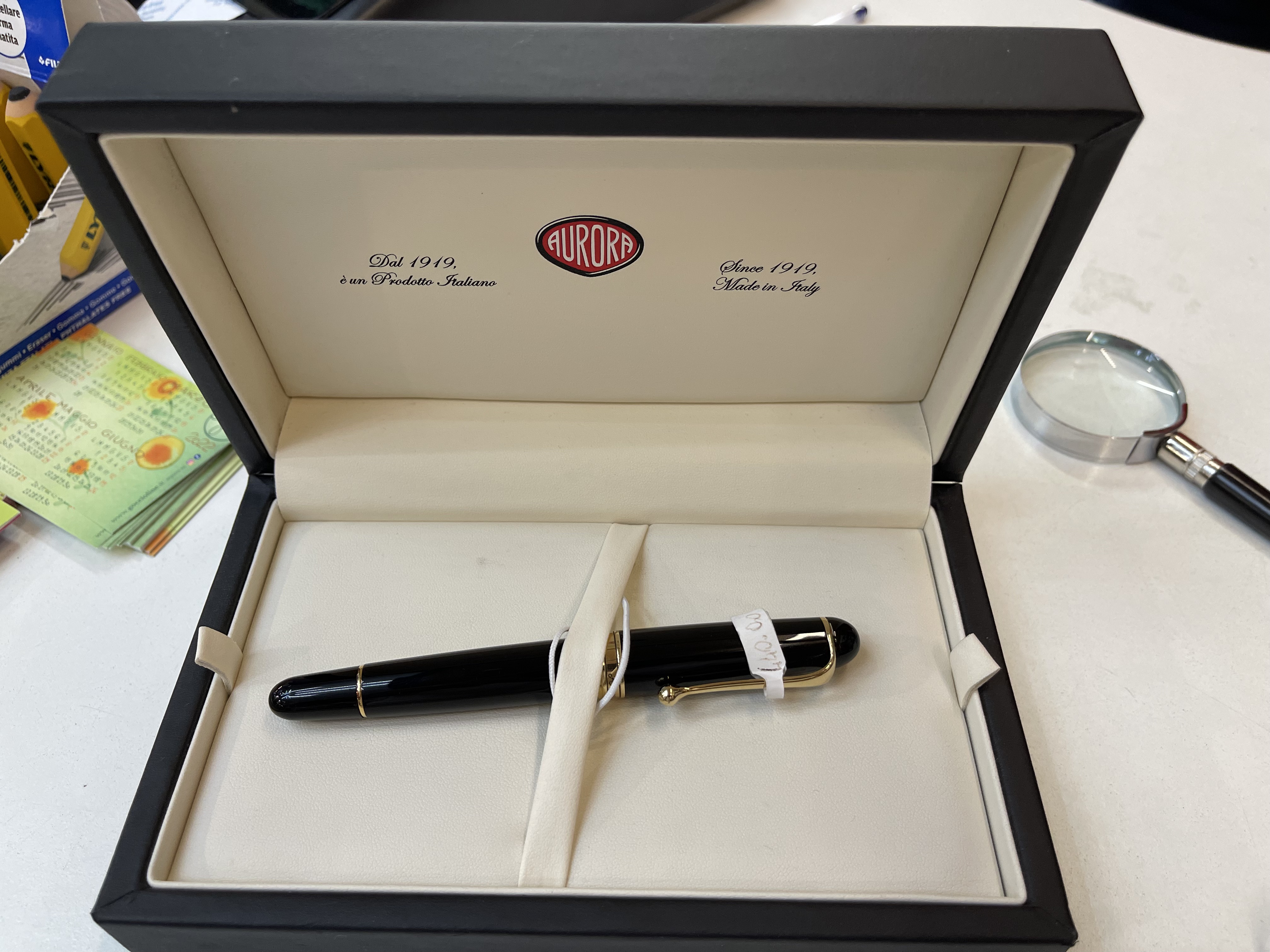 sto per fare un acquisto di una penna Aurora, quella che vedete nell'immagine allegata, qualcuno sa dirmi se effettivamente è una Aurora 88 Big?, il titolare della cartoleria non sa dirmi da quando tempo è in vetrina, non trova nemmeno la scatola di cartone originale.