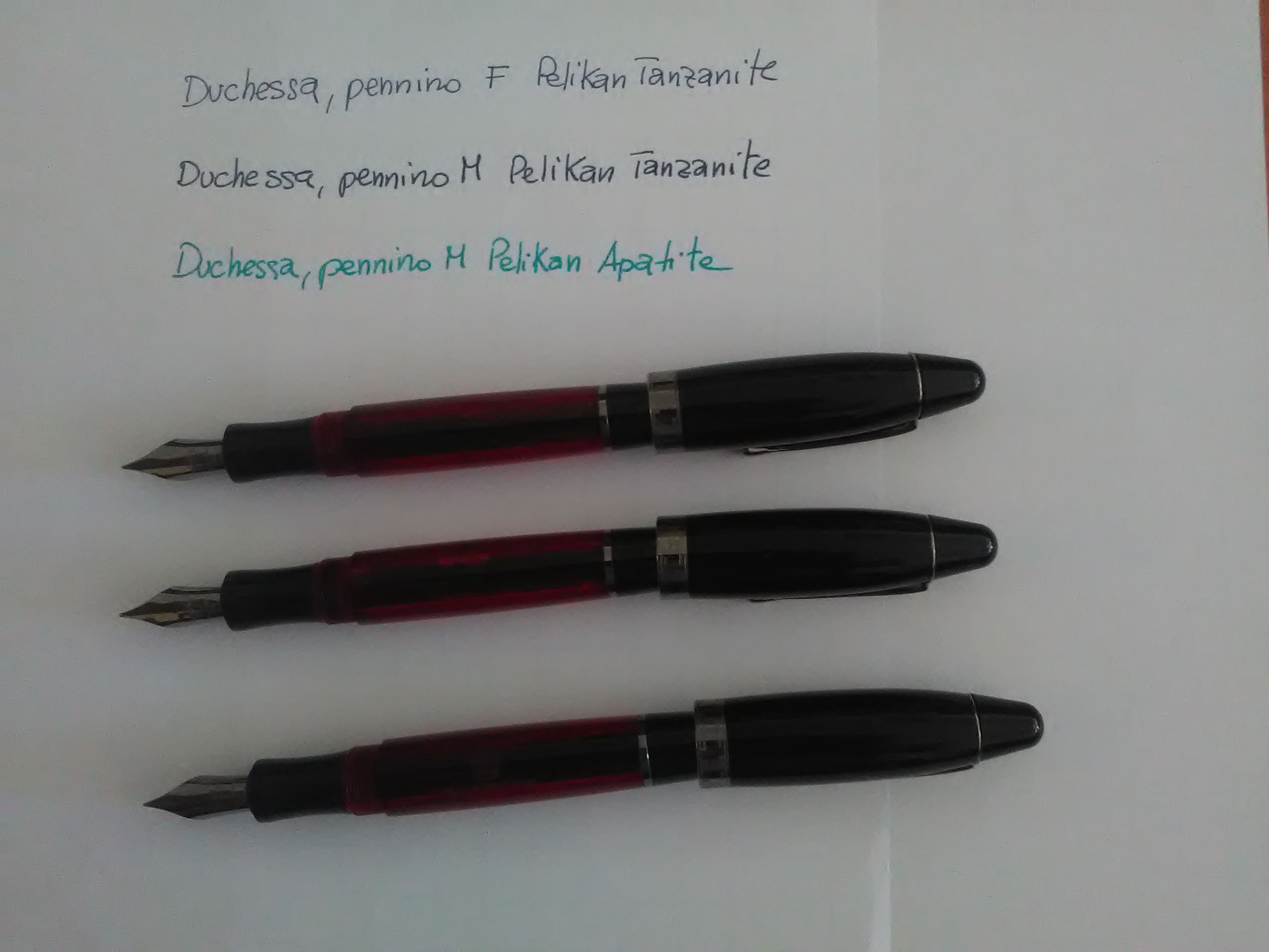 Queste le mie tre Duchesse, su una ho sostituito il pennino F (intera sezione) perché grattava (non confondo con il fruscio), quando avrò cinque minuti di tempo gli darò un'occhiata. Su due sto utilizzando il Pelikan Edelstein Tanzanite perché ho letto che Vinz85 aveva dei problemi con questo inchiostro che io non ho rilevato con le mie. Più fluido l'Apatite. Dopo alcuni giorni di rodaggio devo dire che le penne si comportano bene e preferisco il pennino M, più scorrevole e un ninin di fruscio che non guasta. La carta utilizzata è un normale blocco pubblicitario senza tante pretese. Come al solito pietà per la foto.