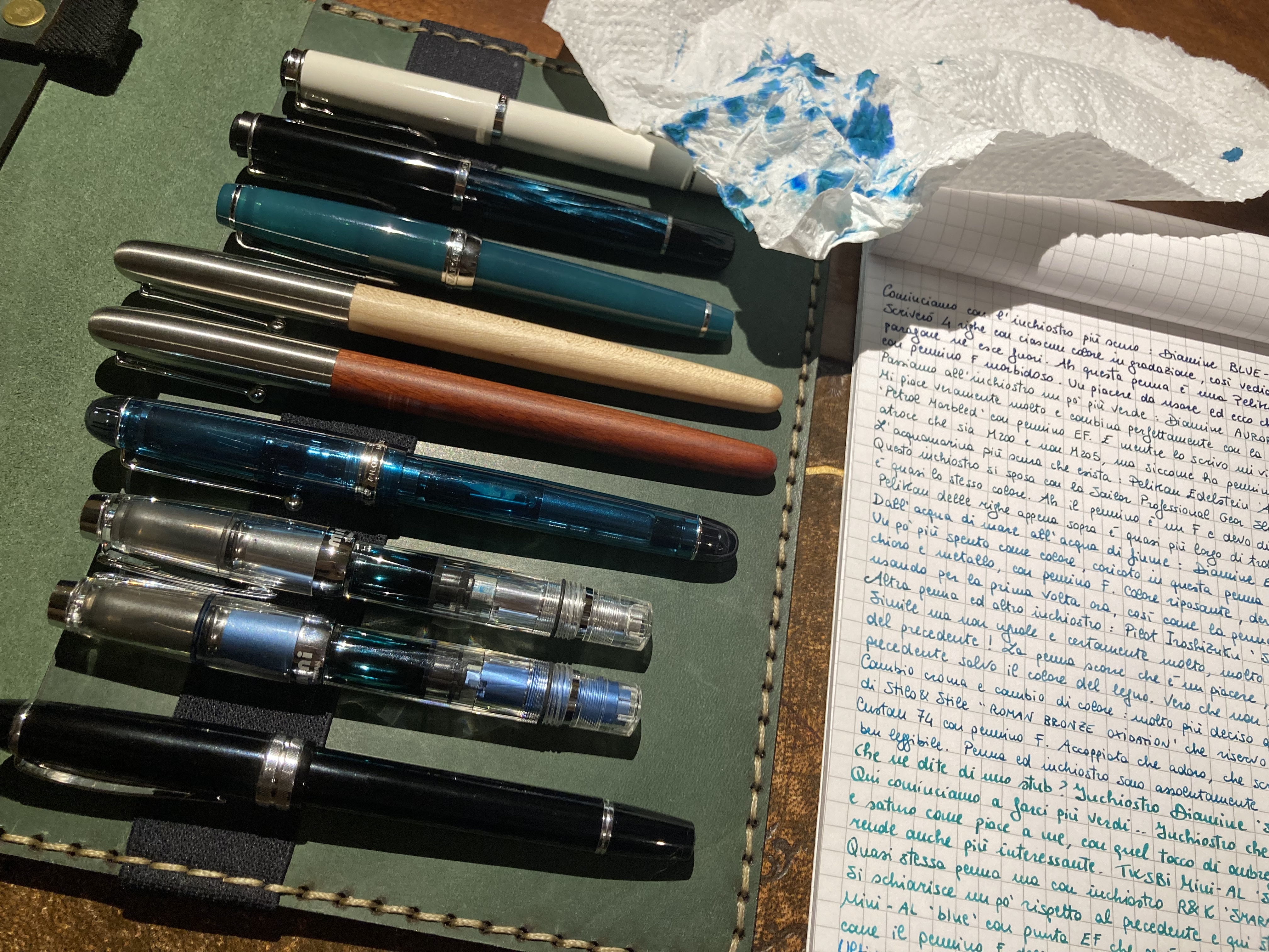 Posso aggiungere che ho notato un po’ di “secchezza” solo in due inchiostri: 4001 Pelikan (risaputo) color turchese e Diamine ‘Eau de Nyl’. Tutti gli altri a pari merito per scorrevolezza, con menzione d’onore per il Pilot Iroshizuku (risaputo bis). Ovvio anche le differenze di pennino incidono, ma prendete questa prova solo come indicazione un po’ per le differenze di colore, giusto per sapere dove collocare qualche nome, se più tra i verdi o più tra gli azzurroverdescuro