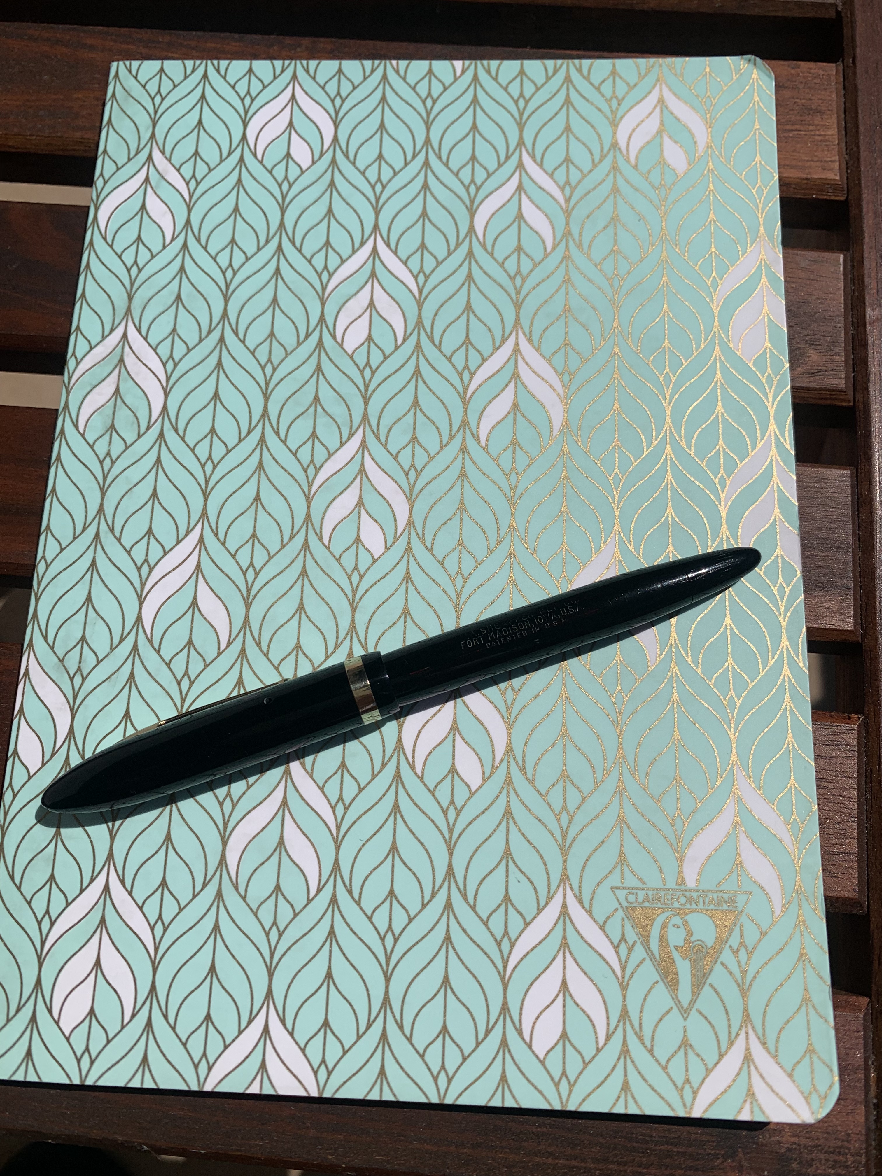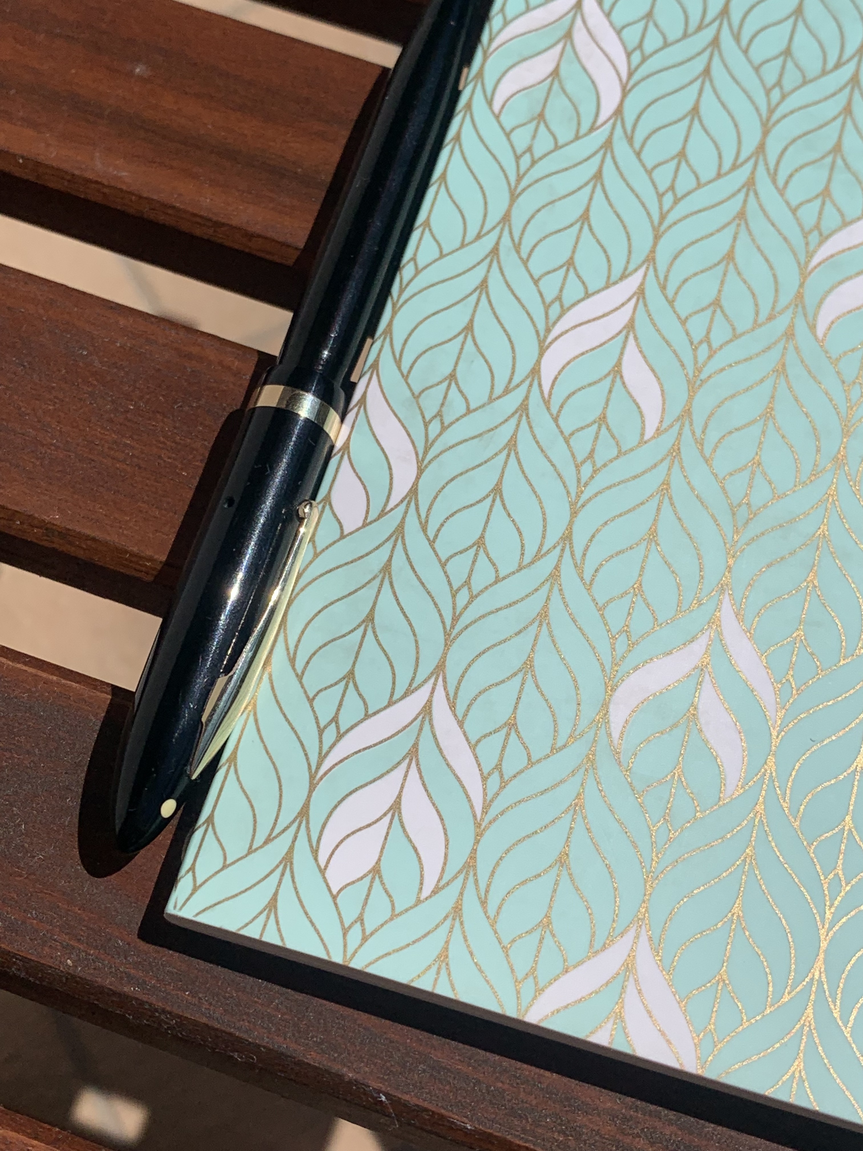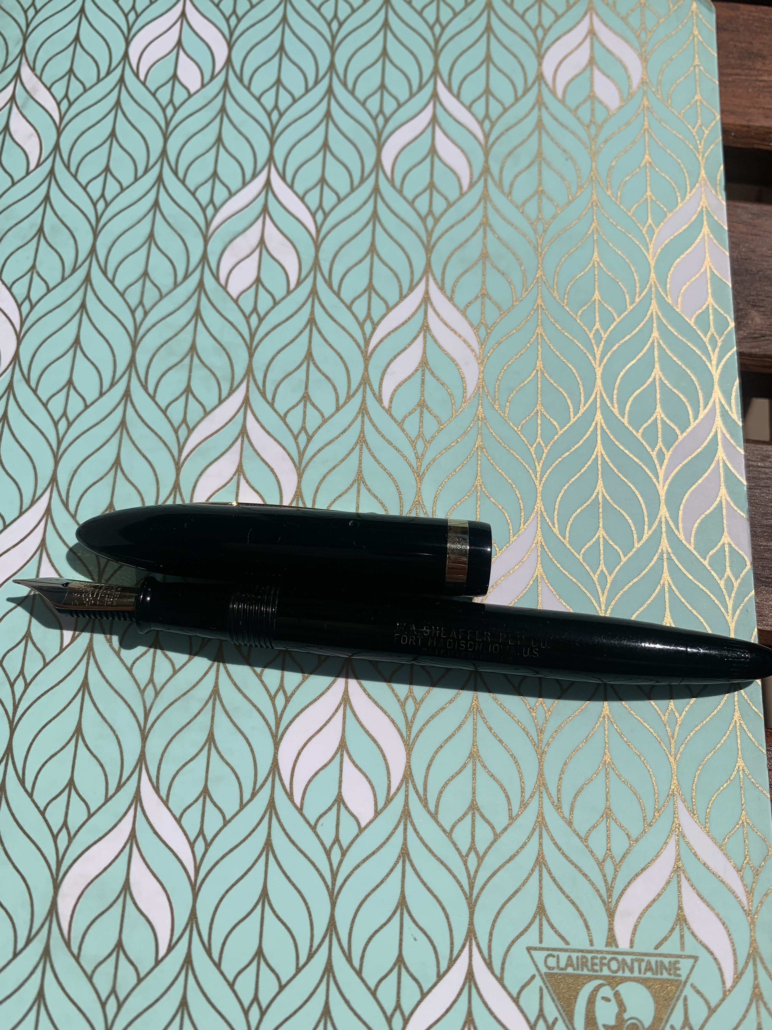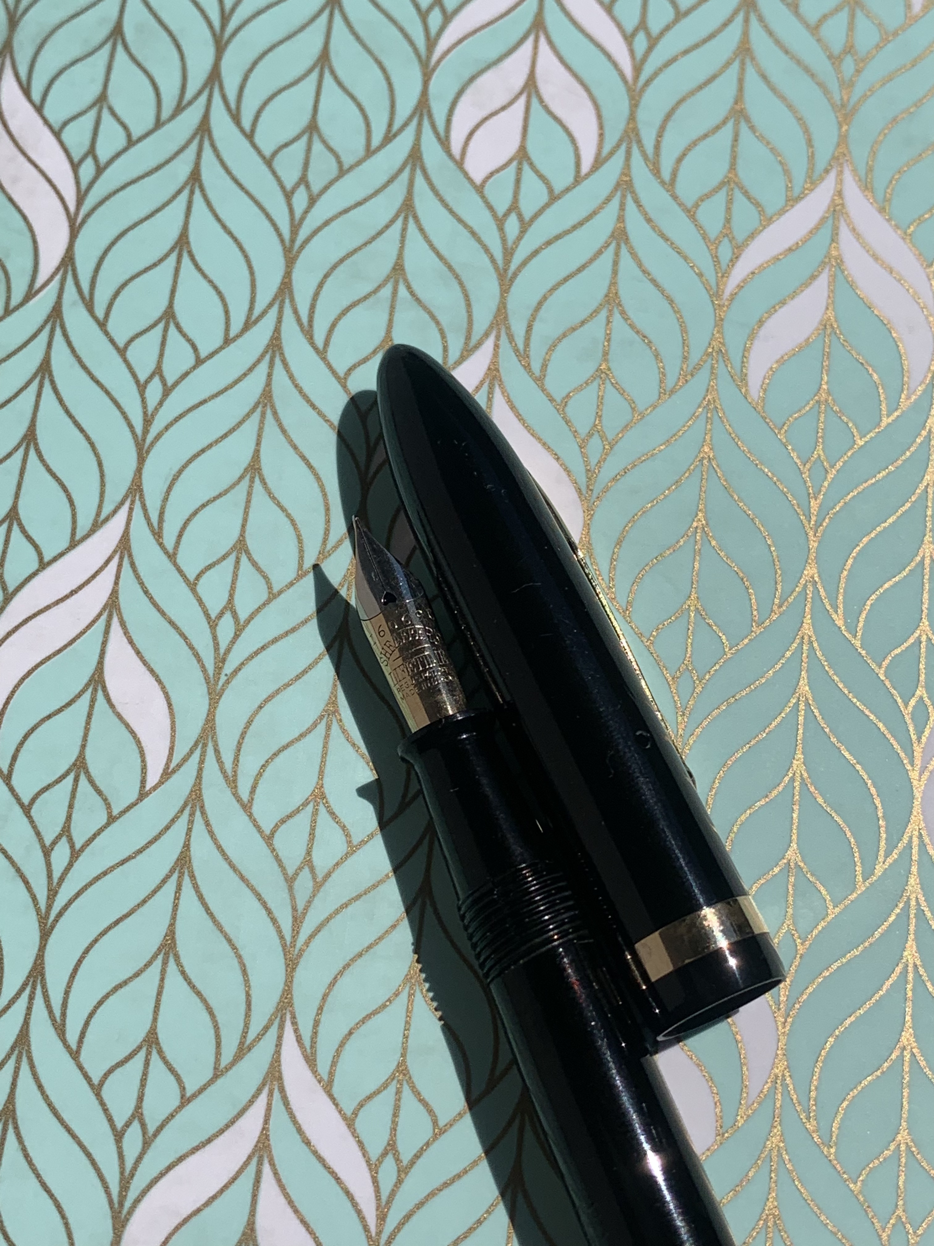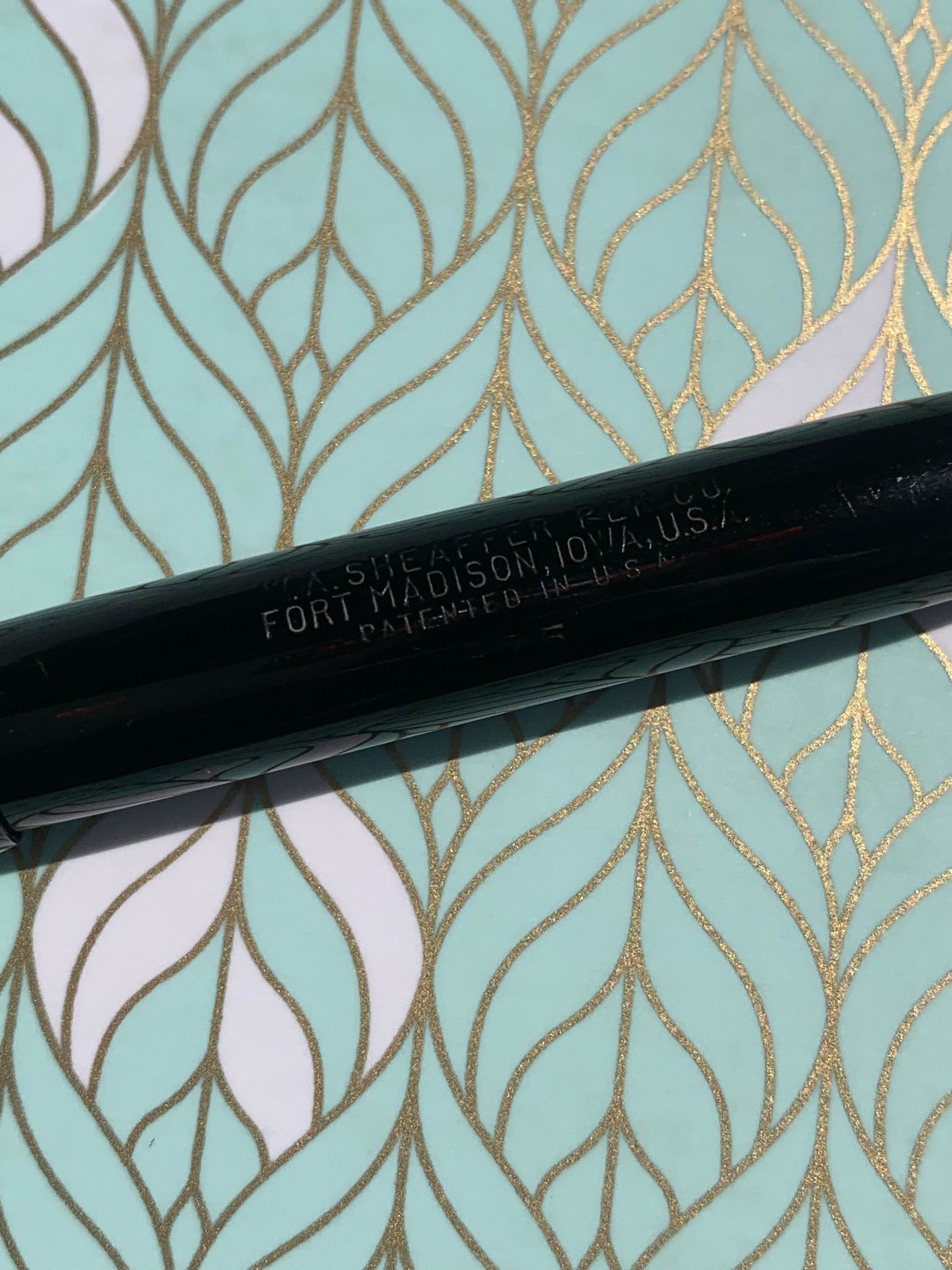 Si tratta di una Sheaffer Balance con caricamento Vacuum-Fill, dalla presenza del White Dot, la scritta 875 (che doveva essere il prezzo di 8,75$ del tempo) e le dimensioni (lunghezza standard ma sottile “Slender”), ho tratto che sia una Sovereign in colore Jet Black, nelle foto non si riesce a vedere ma il serbatoio ha delle striature trasparenti, lunghe tutto lo stesso, per verificare il livello di carica.