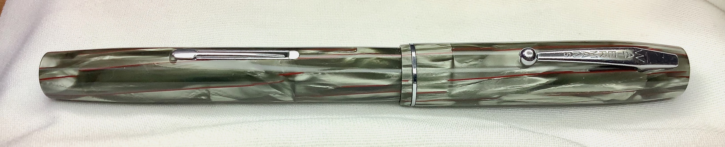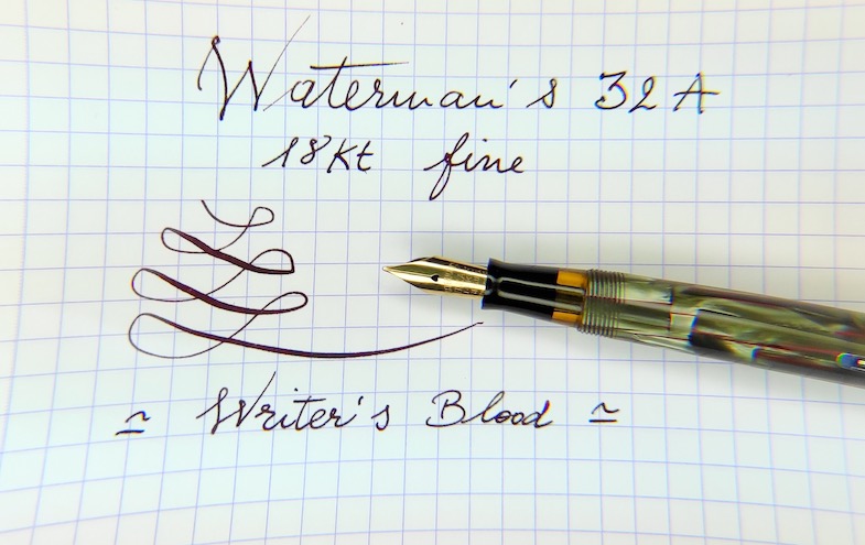 La 32A è una produzione Waterman's che molte fonti fanno risalire alla metà degli anni '30 fino agli inizi del '40 ; penna in celluloide con una livrea molto caratteristica del modello (sembra realizzata a partire da quadròtti di 1-2 o più centimetri di lunghezza di celluloide assemblata tipo mosaico) con sottili venature longitudinali di colore rosso vermiglio. La colorazione di questa penna è di un verde (o grigio-verde) cangiante , che era un colore disponibile assieme al marrone sempre con striature rosse, ed un meno comune rosso con striature verdi.