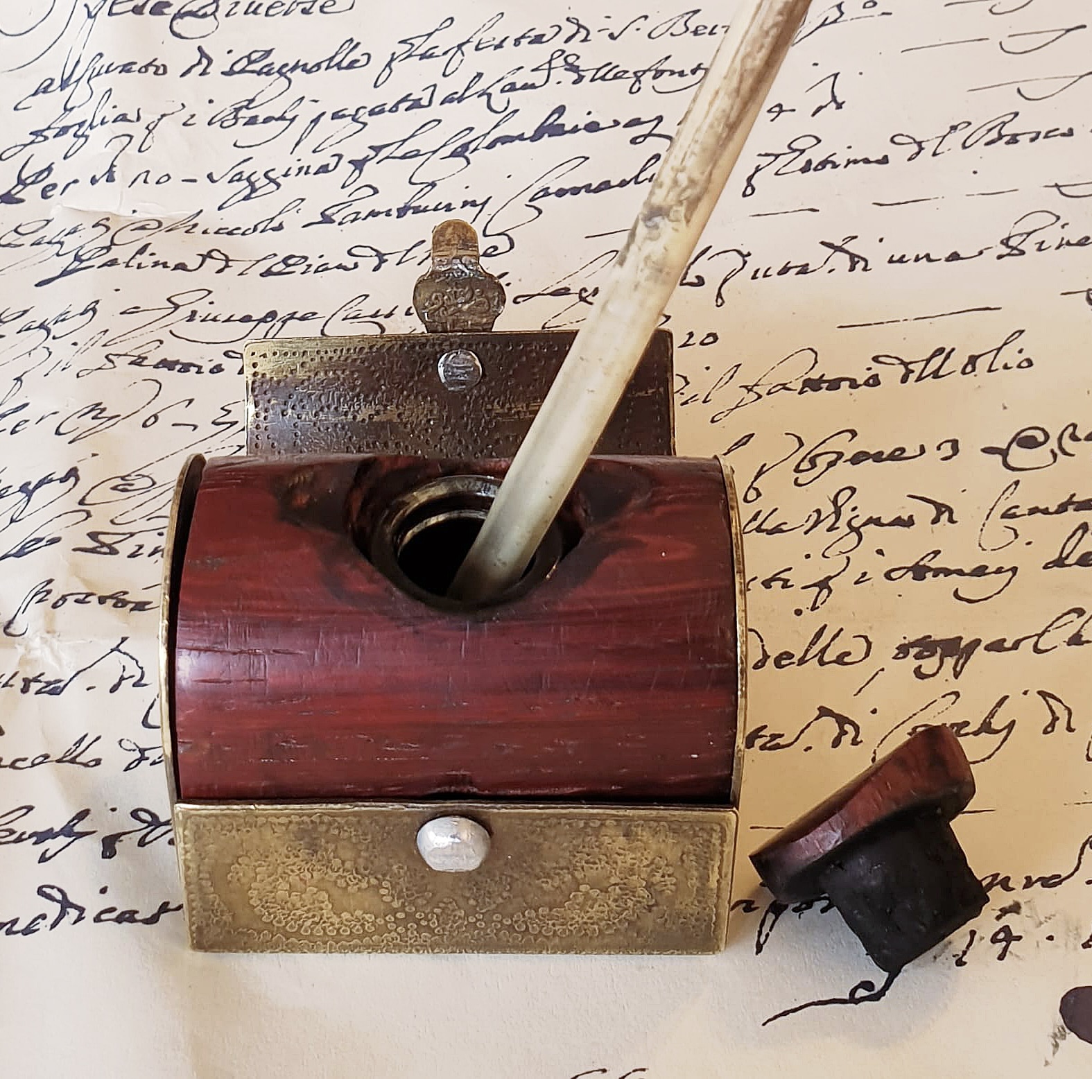 Calamaio tascabile in ottone lavorato a sbalzo e legno rosso