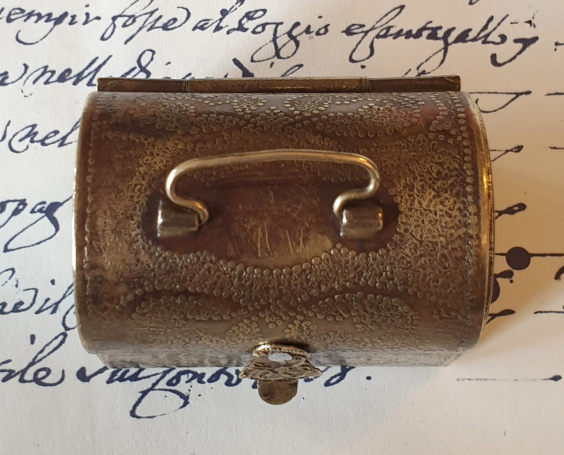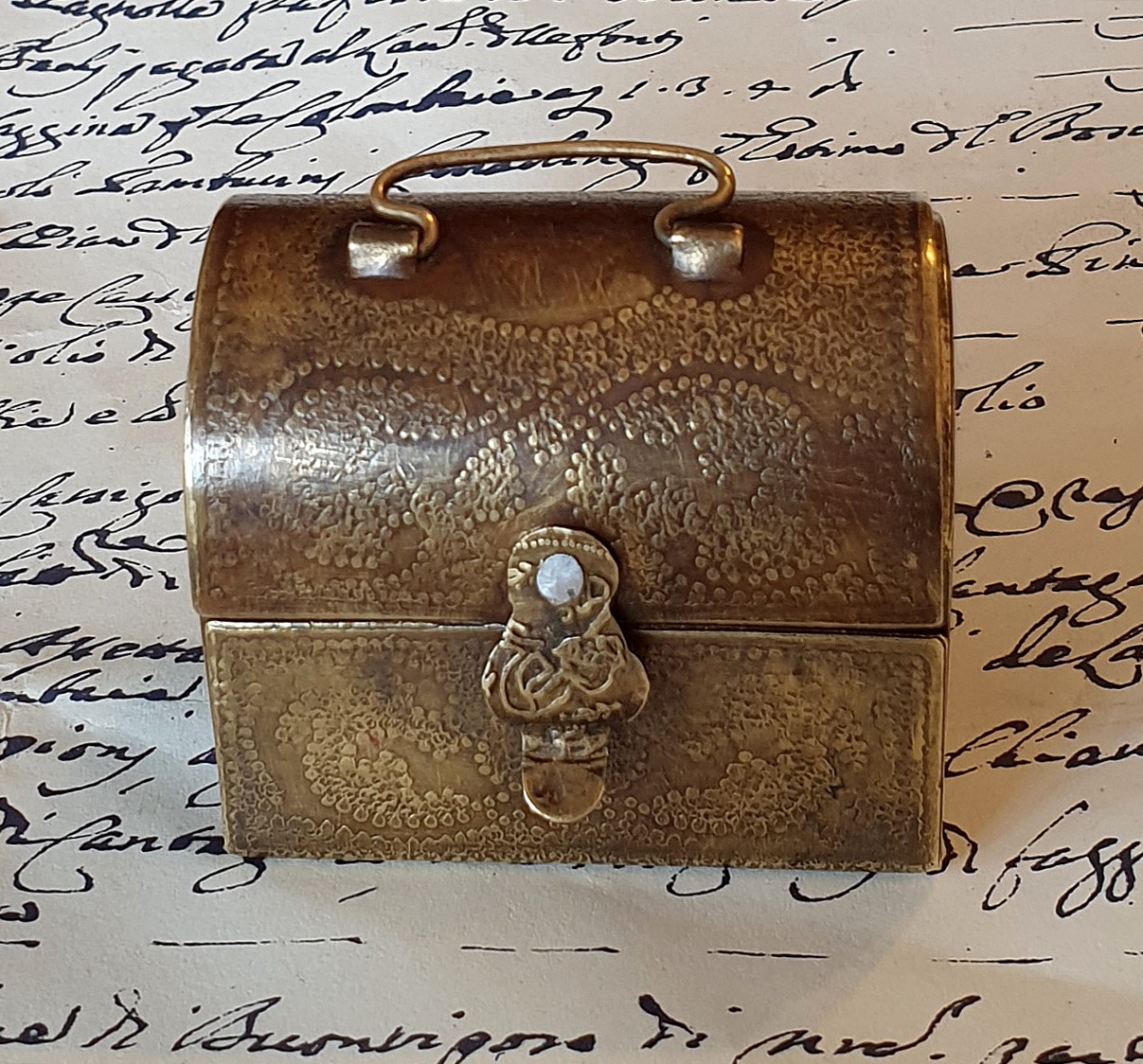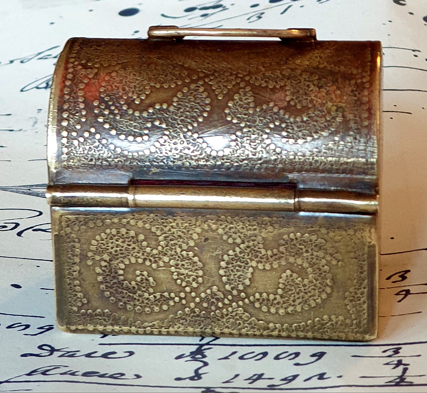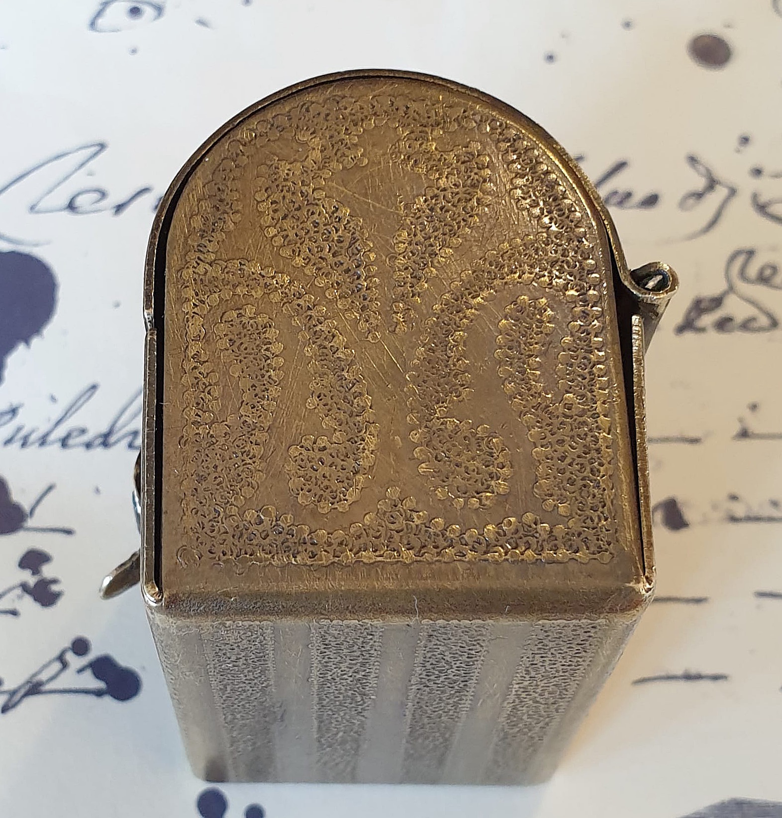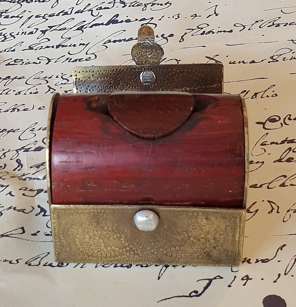 Insolito, raro calamaio tascabile in ottone e legno rosso, con bottiglietta in vetro. Notevoli i decori realizzati a mano mediante la tecnica dello sbalzo puntiforme. Probabilmente ottocentesco.