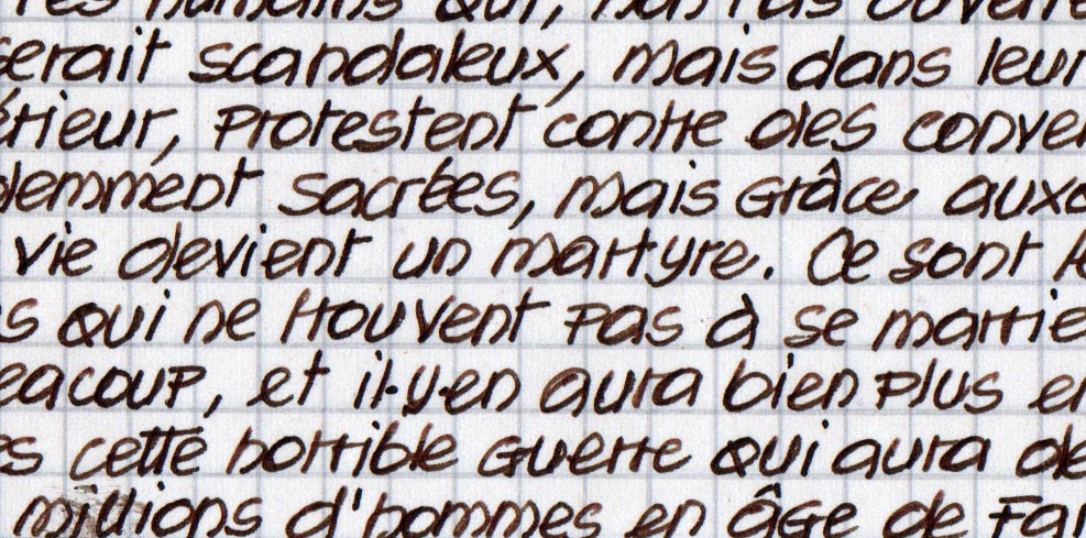 La mia grafia è sviluppata e allenata con penne scivolose e trovarmi ora con un pennino che consenta di avere più controllo è controproducente. Arrivo corto alle curve e chiudo gli occhielli in anticipo, a meno di non tenere il pennino così leggero che ogni tanto si stacca dal foglio.