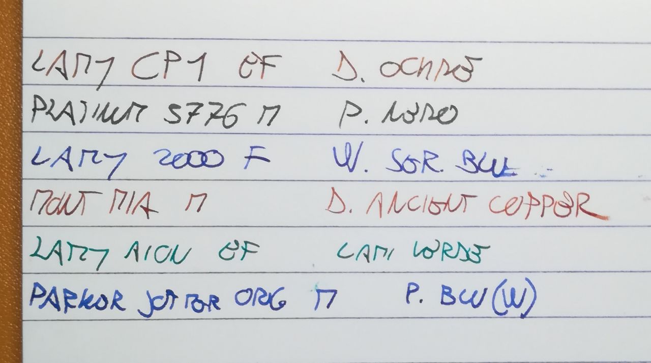 Dopo aver preso la Montegrappa Mia Flaming heart con pennino M (in realtà la seconda, ho restituito la prima, come documentato nell'altro topic) ho fatto un piccolo confronto con tutte le penne che al momento sono inchiostrate (carta Rhodia).