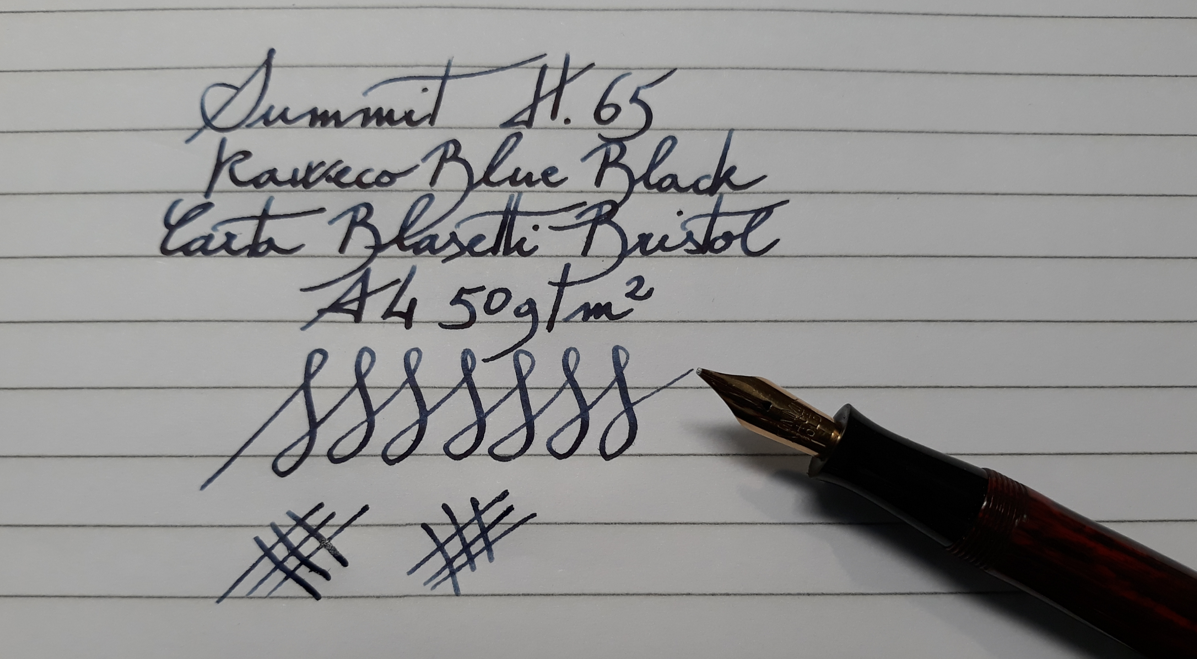 Caricata con il blu nero Kaweco, è partita immediatamente, senza alcuna incertezza, con un flusso regolarissimo ed un tratto perfetto, frutto del pennino stub semiflessibile, che è davvero molto, molto piacevole, tanto da portare questa penna al vertice della mia classifica.