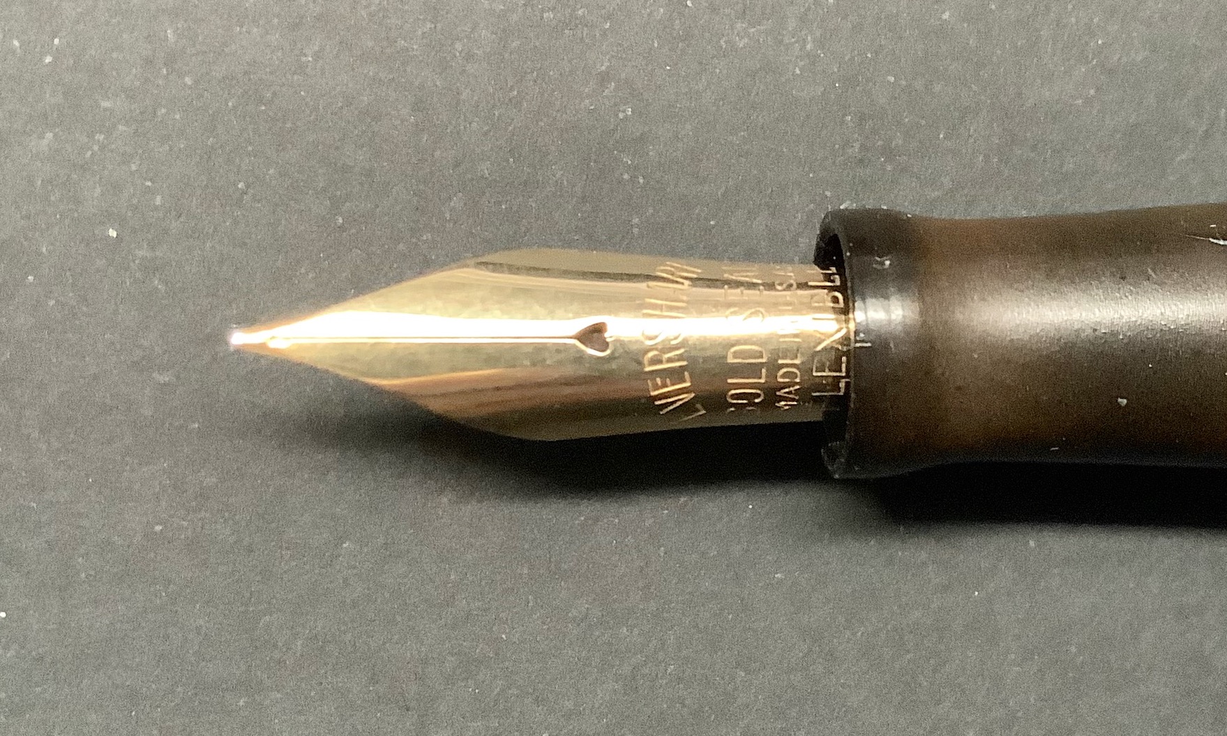 Un pennino Gold Seal di tratto medio, flessibile, della tipologia Personal-Point viewtopic.php?f=13&t=28606 . La sezione (in ebanite immagino) avrebbe bisogno di una bella pulizia !