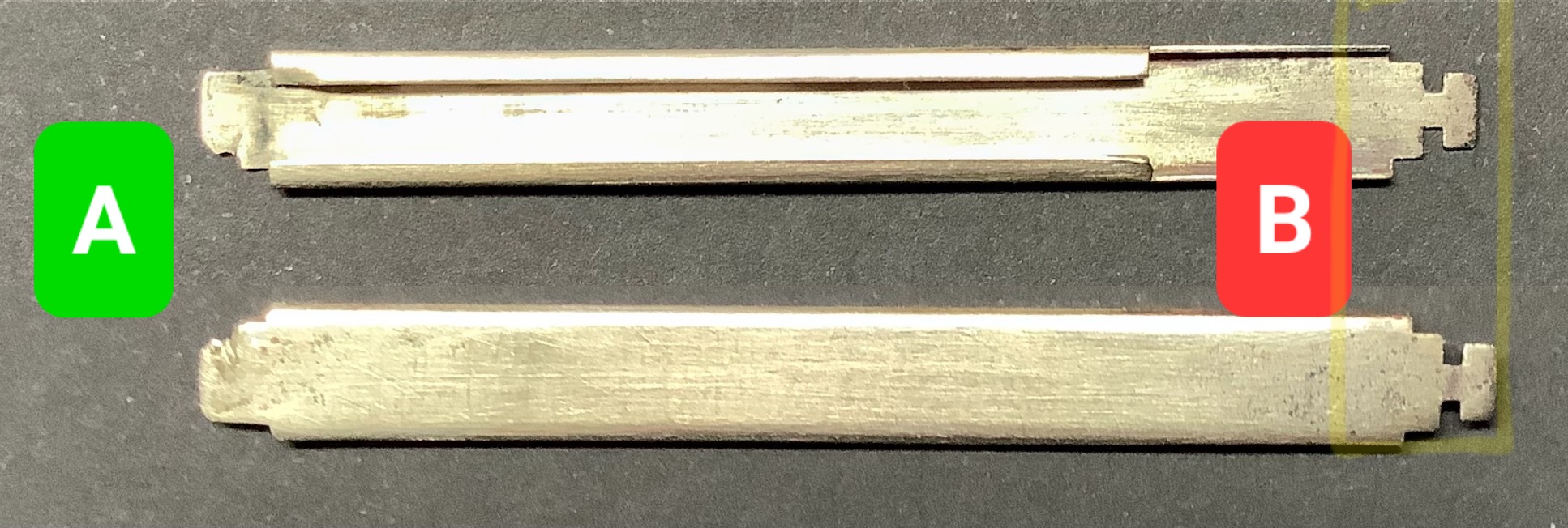 La parte A è semplicemente deteriorata/smangiata, mentre l'estremità B è sagomata "a T" per scorrere nella guida dell'ancoraggio: appare per lo meno improbabile, quindi, che tale ancoraggio non fosse presente anche sulle lady.