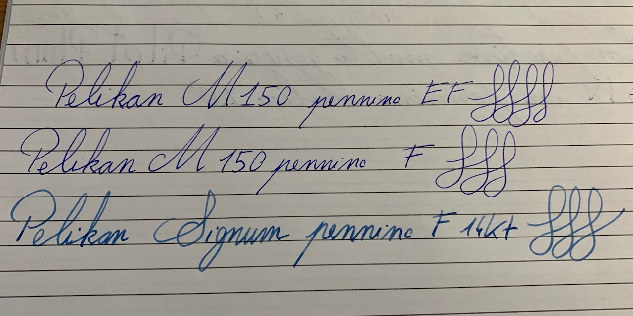 Metto una foto di esempio, dalla quale si vede che le due m150 scrivono in modo sostanzialmente uguale, mentre non vorrei trovarmi il tratto come il fine della Signum che è troppo cicciotto (pennino F 14kt).
