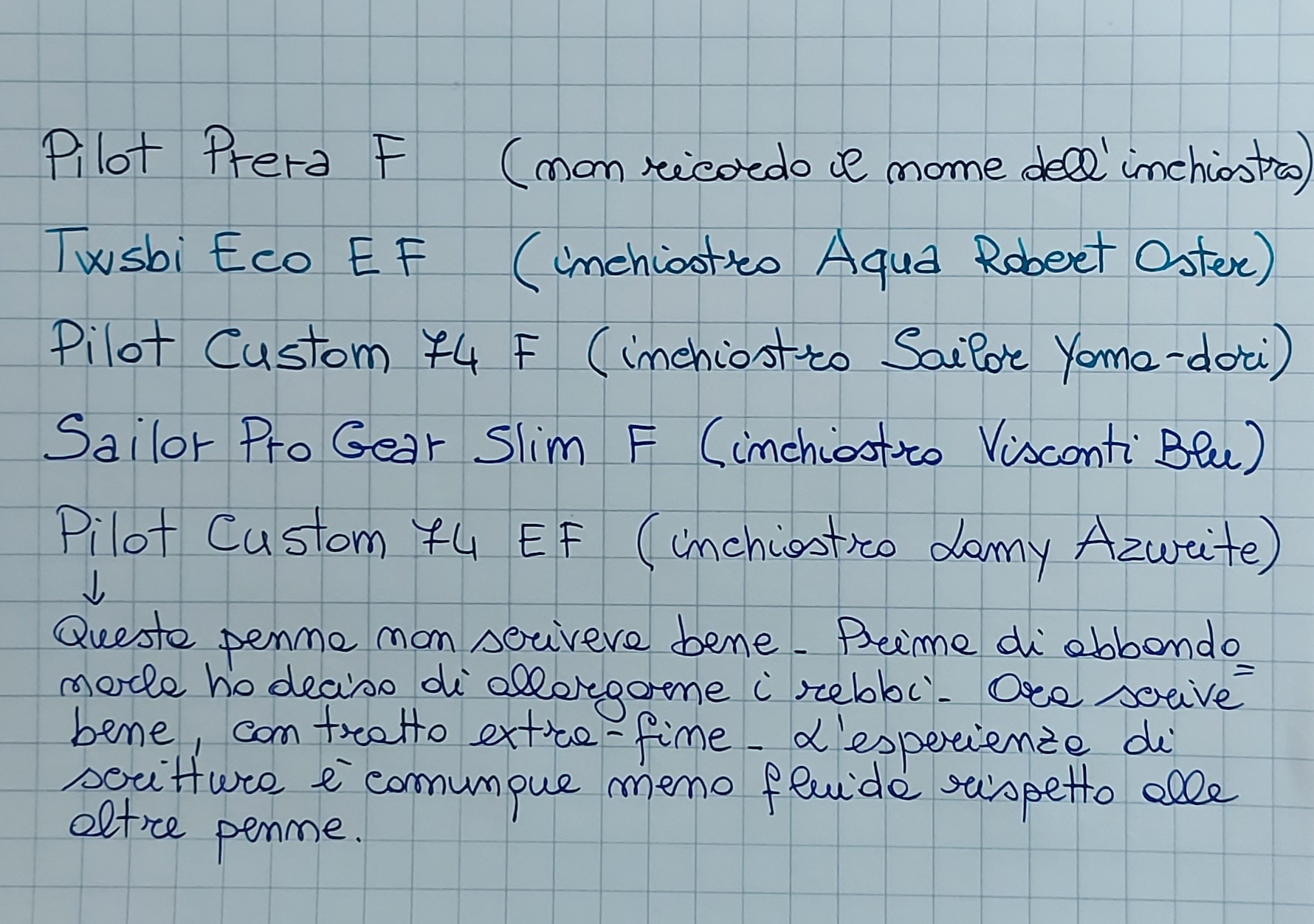 Aggiungo una prova di scrittura con le mie penne dal tratto più sottile. La carta è Tomoe River su quadretto da 5mm. :wave:
