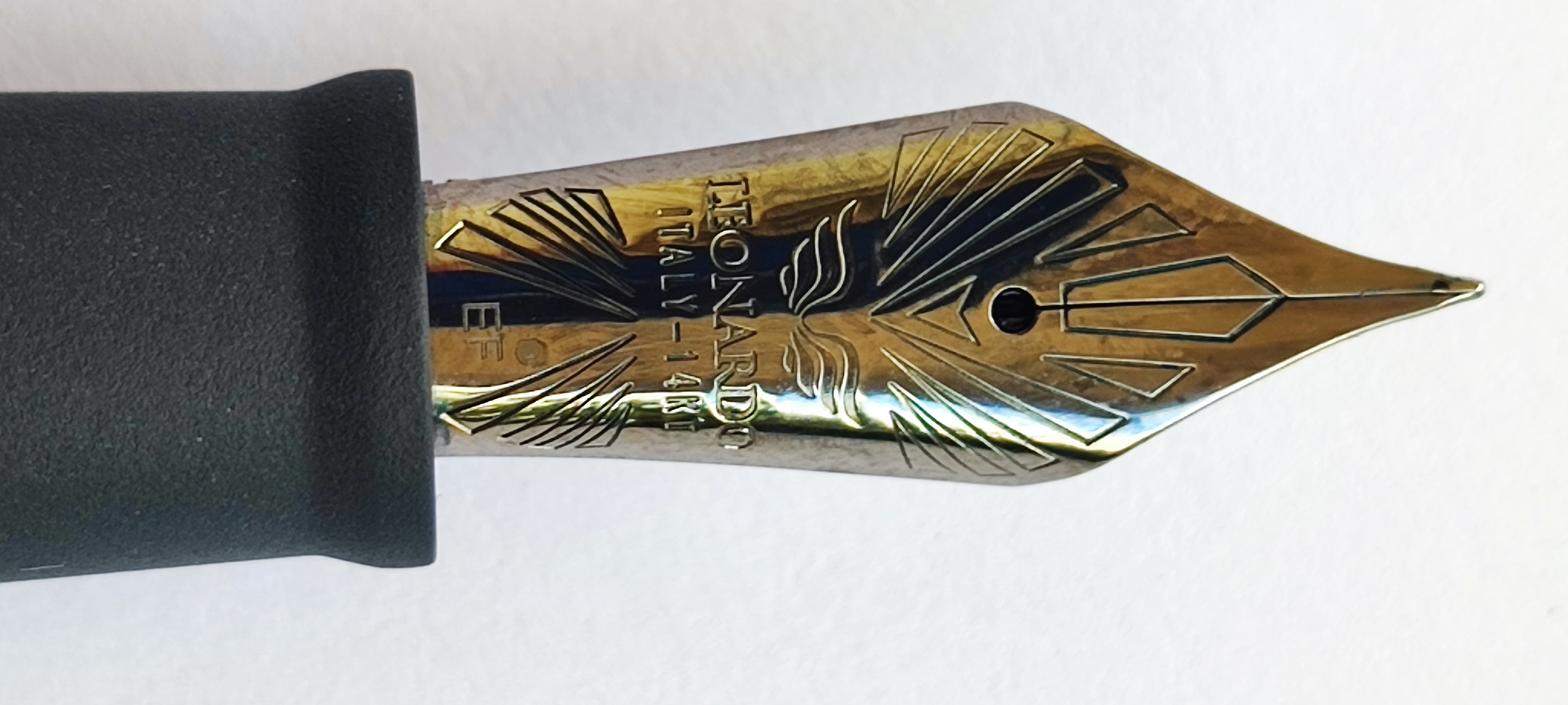Ho scritto a Leonardo segnalando la cosa e mi ha proposto di spedire la penna per una stretta sui rebbi, cosa che non mi ha affatto convinto, in quanto il problema non risiede nel pennino, che è perfetto come tratto quando lo si usa in carenza di inchiostro. Sin dal primo momento ho pensato che il conduttore in ebanite è pensato per un tratto b o bb o csi, in modo da sostenere una richiesta abbondante di flusso ma che per un ef sia decisamente da rivedere con magari dei canali più sottili, in modo da apportare in punta una quantità inferiore di flusso.
