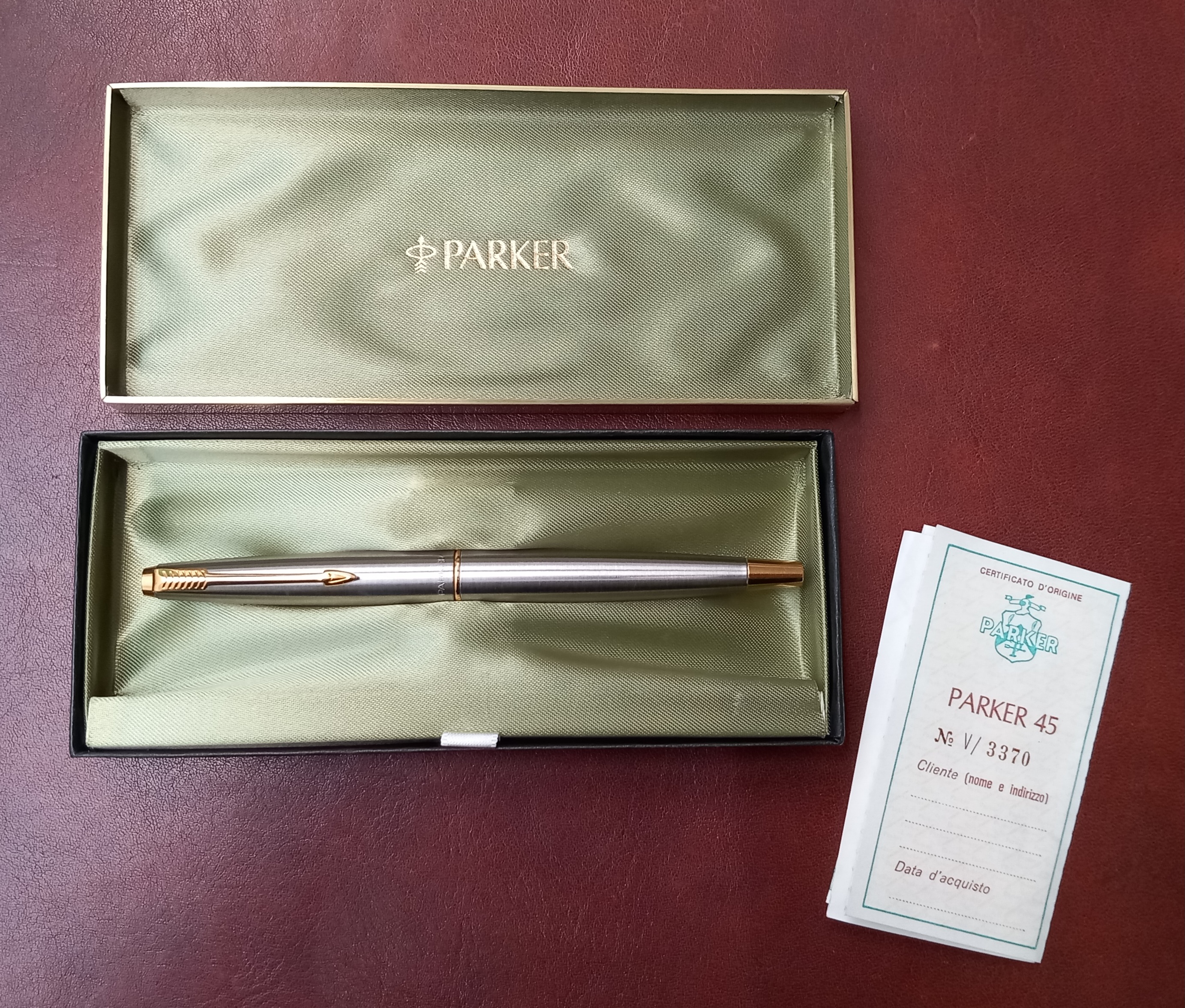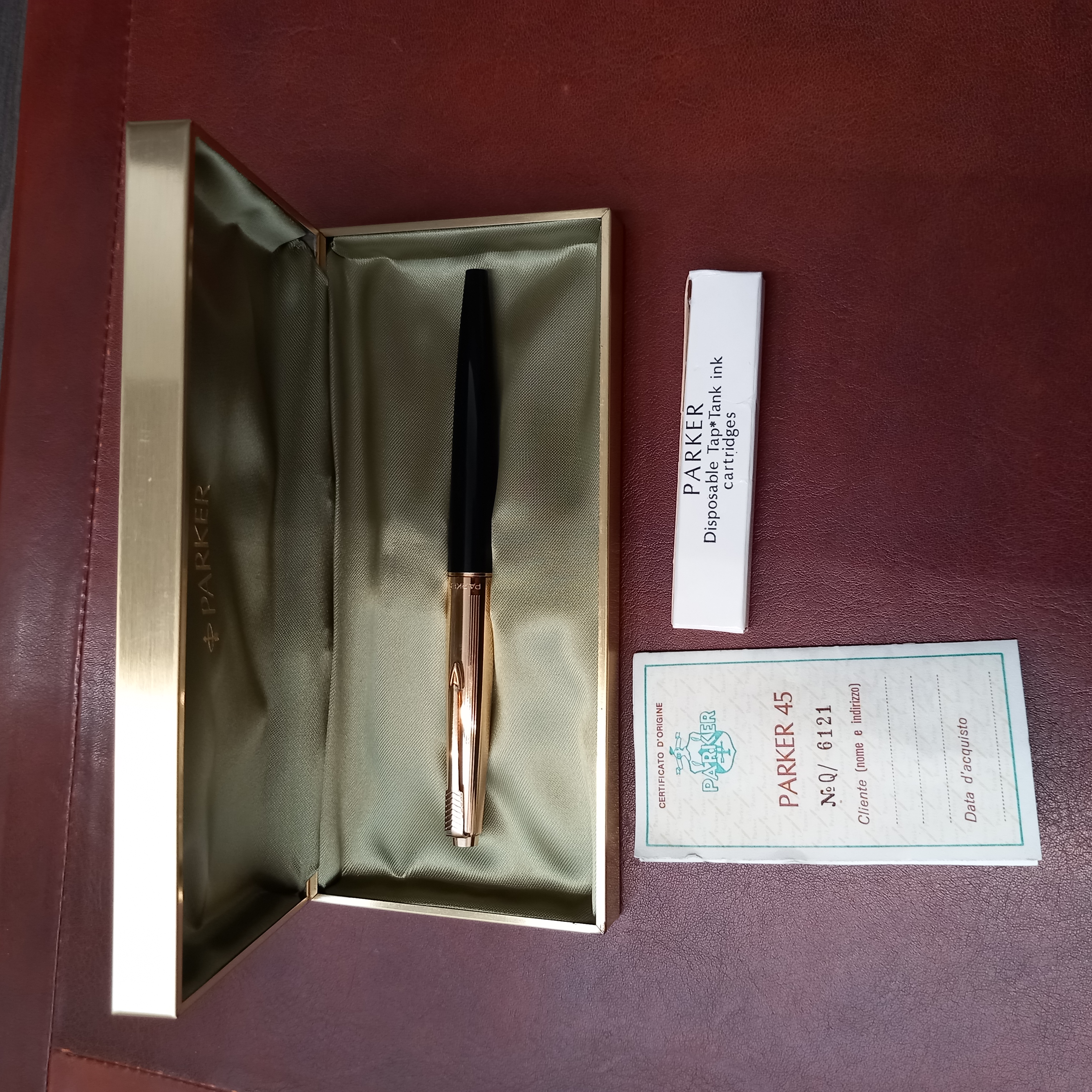 Ecco il mio primo acquisto dell'anno nuovo: due Parker 45 (una Flighter GT ed una Custom) post 1970, nuove, nella loro scatola originale, con certificato, cartucce di cortesia (quella della Flighter è nascosta sotto il vassoio) e, per la Custom, converter originale.