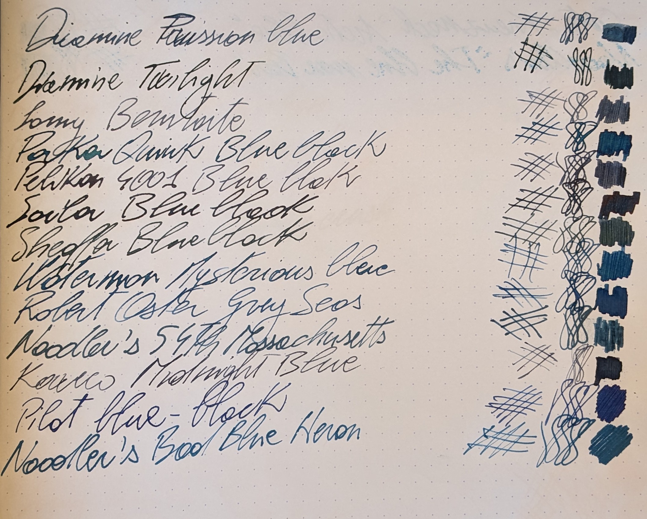 prova a dare una occhiata anche al Gewitterwolke, è un inchiostro tedesco della Fritz Schimpf (un distributore locale). Tradotto sarebbe "blu tempestoso" è un blue-black che però è poco black, tende al grigio. A me piace molto, è un po' più scuro di quelli mostrati finora, come comportamento somiglia vagamente ai Pelikan, non è lubrificato, abbastanza secco.