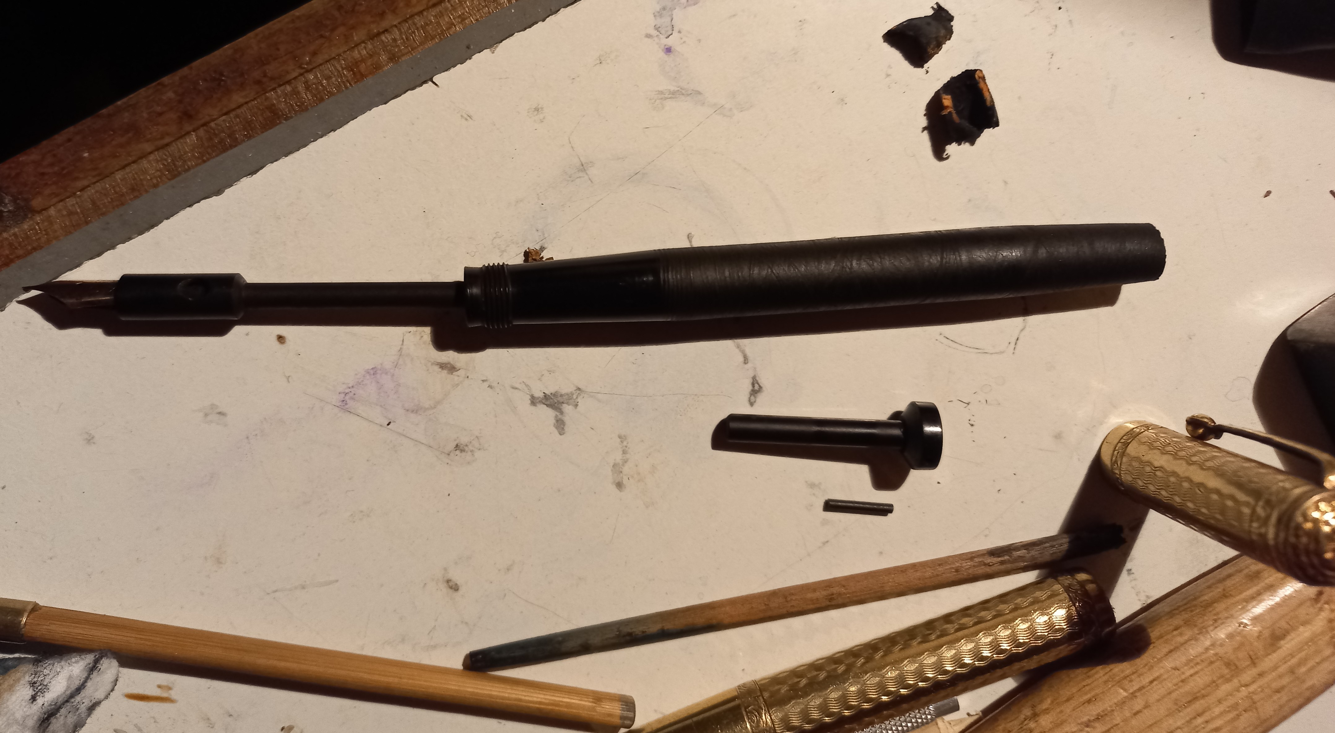 Ho rimosso il rivestimento in lamina e la manopola della spirale ma il fusto in ebanite non ha nessuna apertura a vite sul fondello.