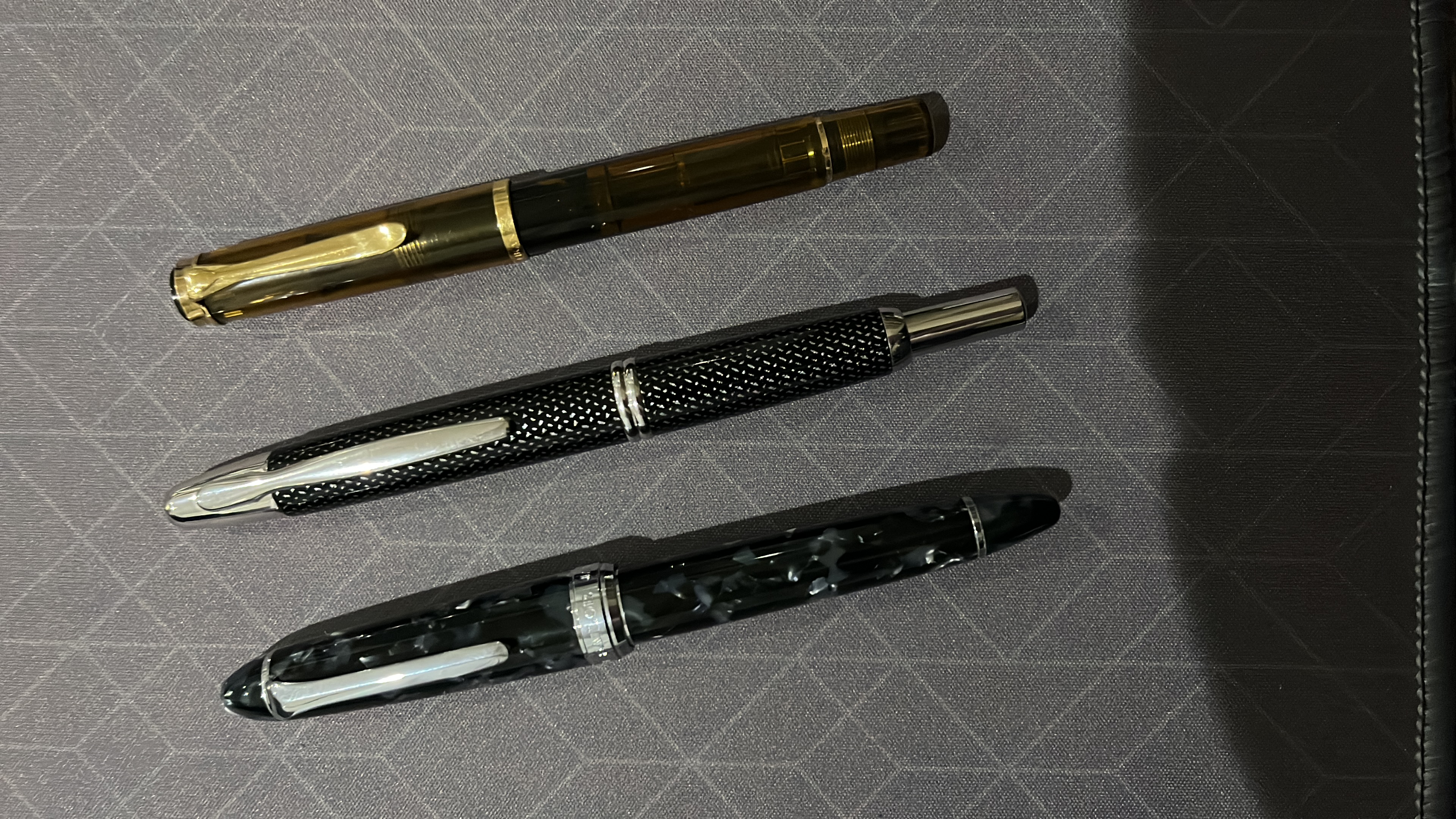 una Sailor 1911 Profit Mosaic, una Pilot Capless, ed una Pelikan M200 Cognac.