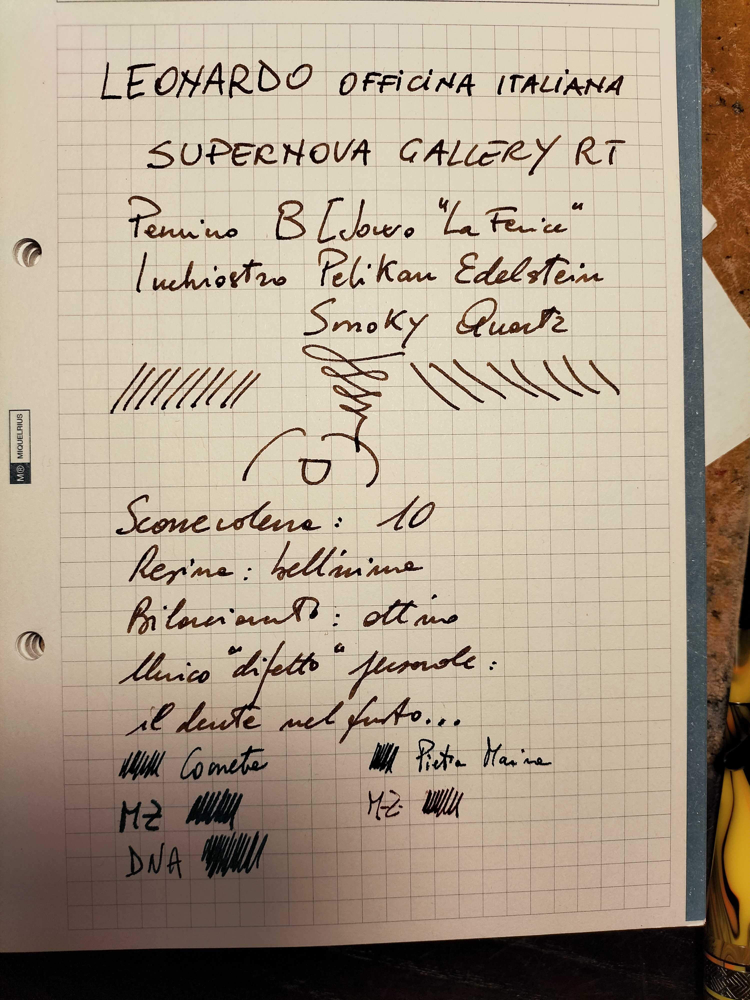 I confronti sono finiti e mi godo questa Leonardo Supernova che ha una sua personalità autunoma. Le dimensioni sono grosso modo quelle delle Leonardo: Lunghezza con cappuccio: 141,0 mm / Lunghezza cappuccio calzato: 163,3 mm / Lunghezza del corpo: 126,7 mm / Lunghezza del cappuccio: 65,5 mm / Diametro del corpo: 14,5 mm / Diametro del cappuccio: 14,7 mm / Diametro dell'impugnatura: 10,9 mm / Peso: 28,63 g.