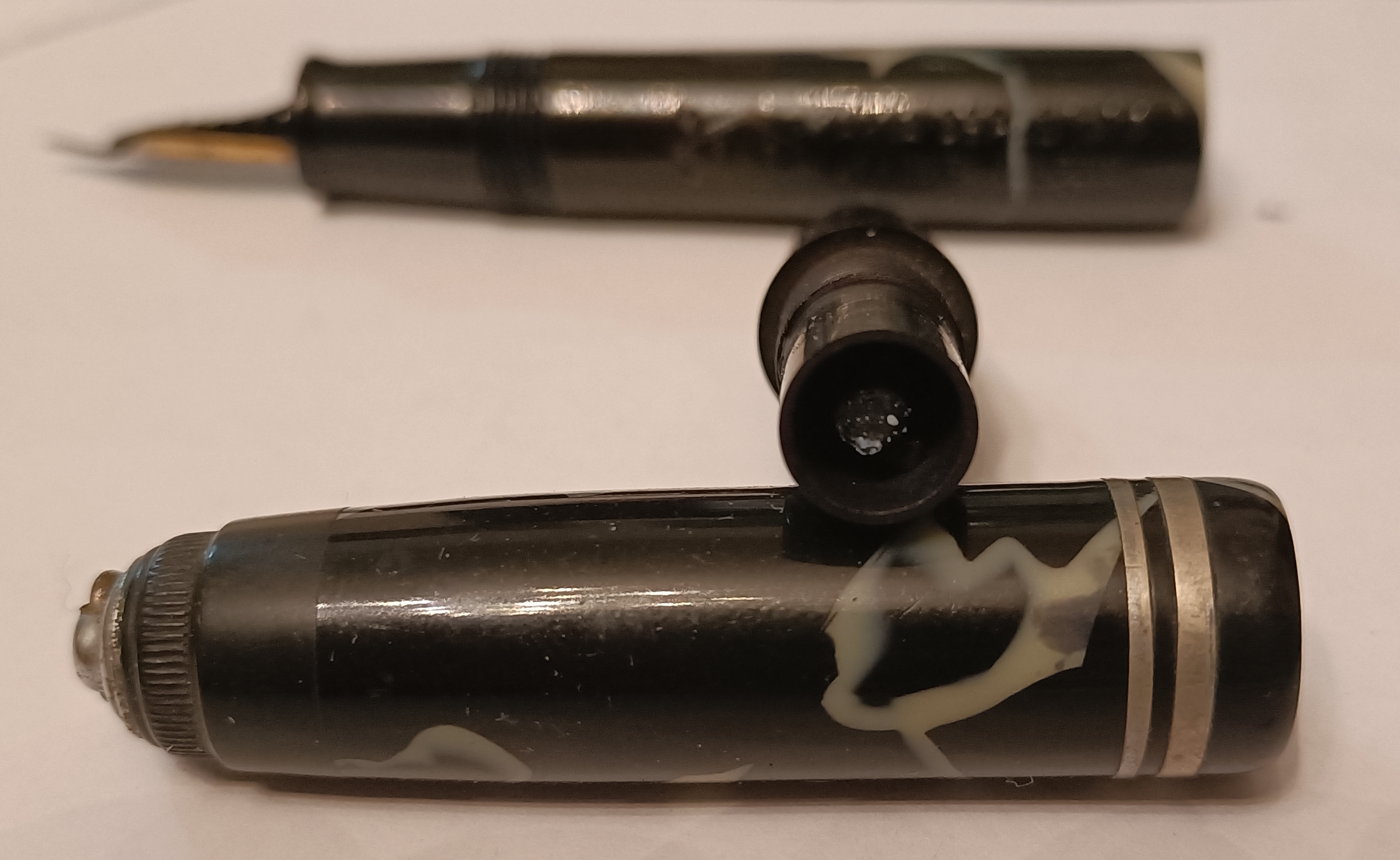 Nella Wiki, alla voce "Piave" si legge " La produzione era costituita sia da rientranti in ebanite, che da modelli in celluloide colorata con caricamento a pulsante di qualità media" ma a me pare evidente che questa penna, o meglio, questo oggetto misterioso, non sia né una rientrante né una "pulsante di fondo".
