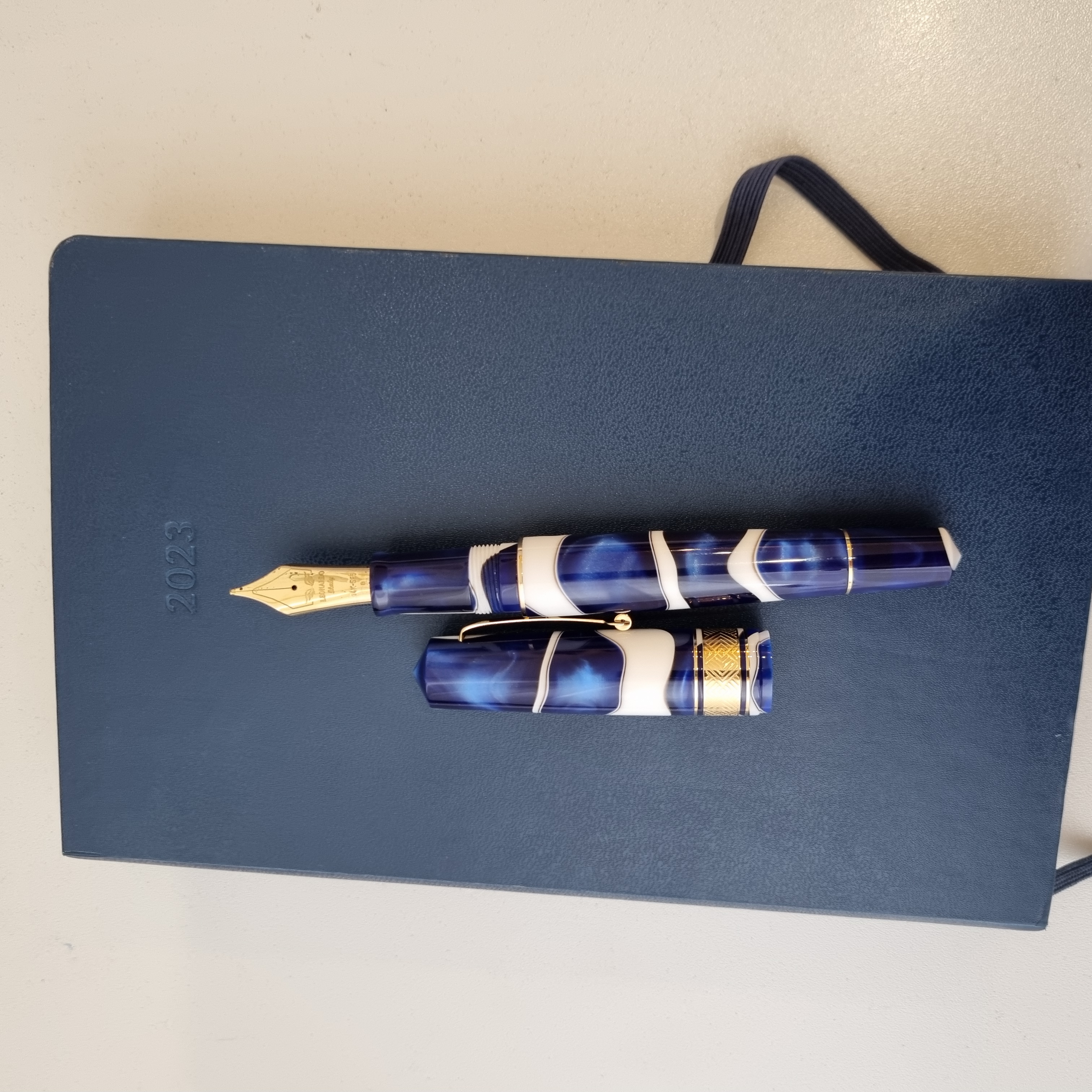 Una bella penna, colorazione interessante. Chissà perché quando ho letto il titolo mi aspettavo una penna celeste. Deve trattarsi di un cielo “nuvoloso”