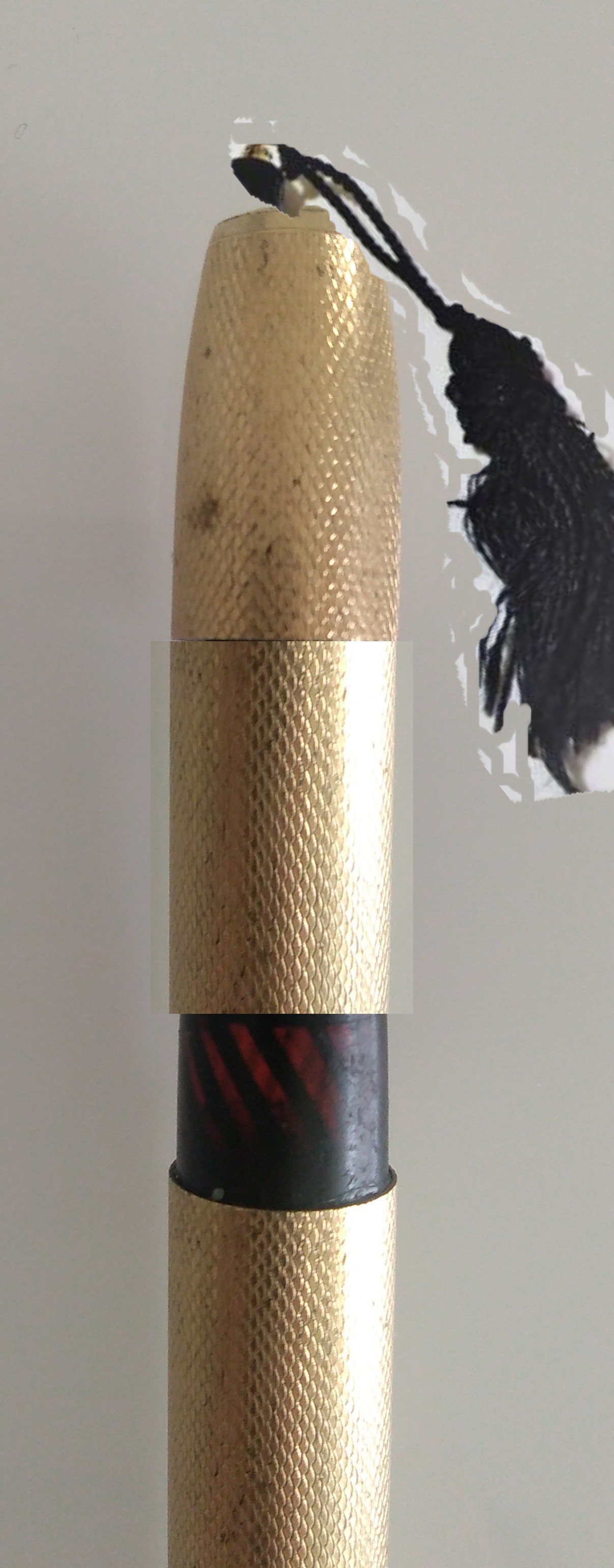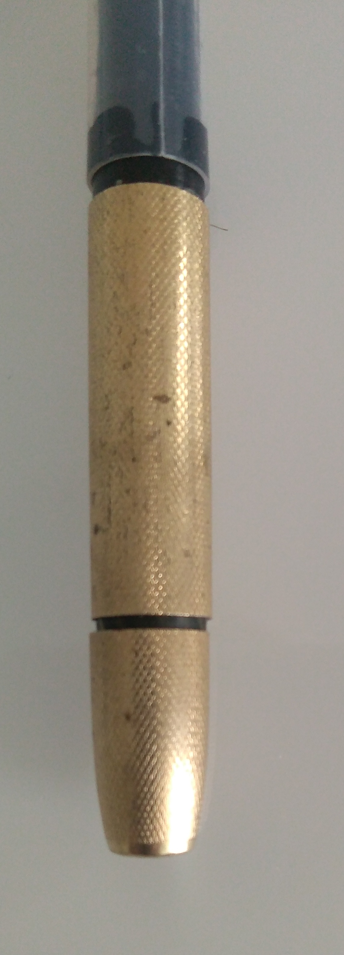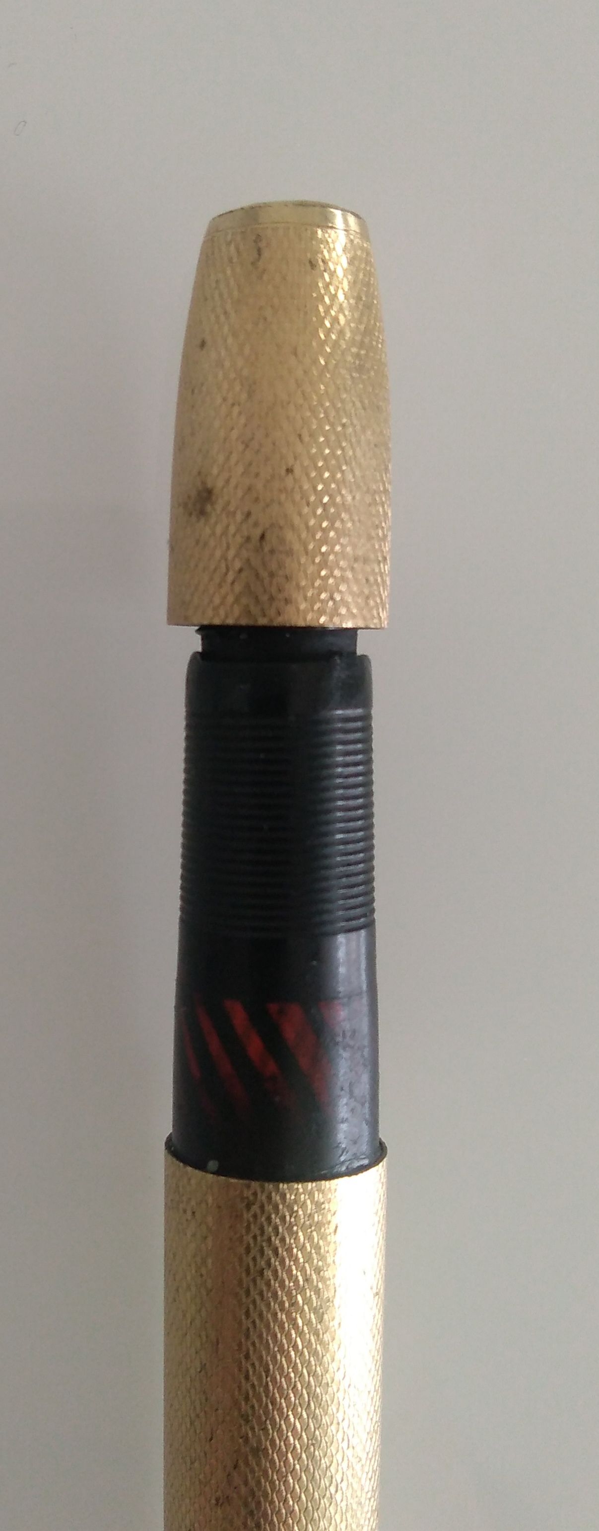 Quasi sicuramente il cappuccio era formato da un tappo in ebanite( o materiale simile) interno ad avvitare, identico all'ogiva del fondello (infatti ho provato ad invertire e si avvita perfettamente al lato pennino), mentre la parte laminata esterna del cappuccio, a differenza del fondello, presumo fosse più profonda e andasse a coprire l'intera sezione anteriore fino alla finestrella di ispezione inchiostro e magari in cima al cappuccio il solito anellino con fiocchetto