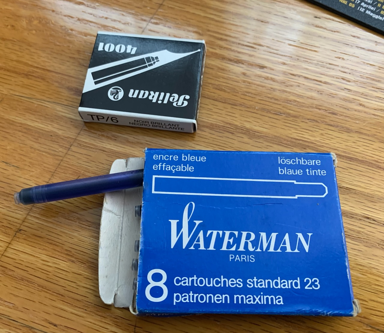 La scatola Pelikan 4001 in realtà conteneva dellle cartucce Waterman nere corte, al 30% o meno, molto vecchie, recuperate con una siringa le ho caricate anch'esse senza aggiungere altro, nero profondo, molto bello, lubrificazione ottima, ma allargava un bel po' il tratto e spiumava abbastanza, però anche loro nessun problema.