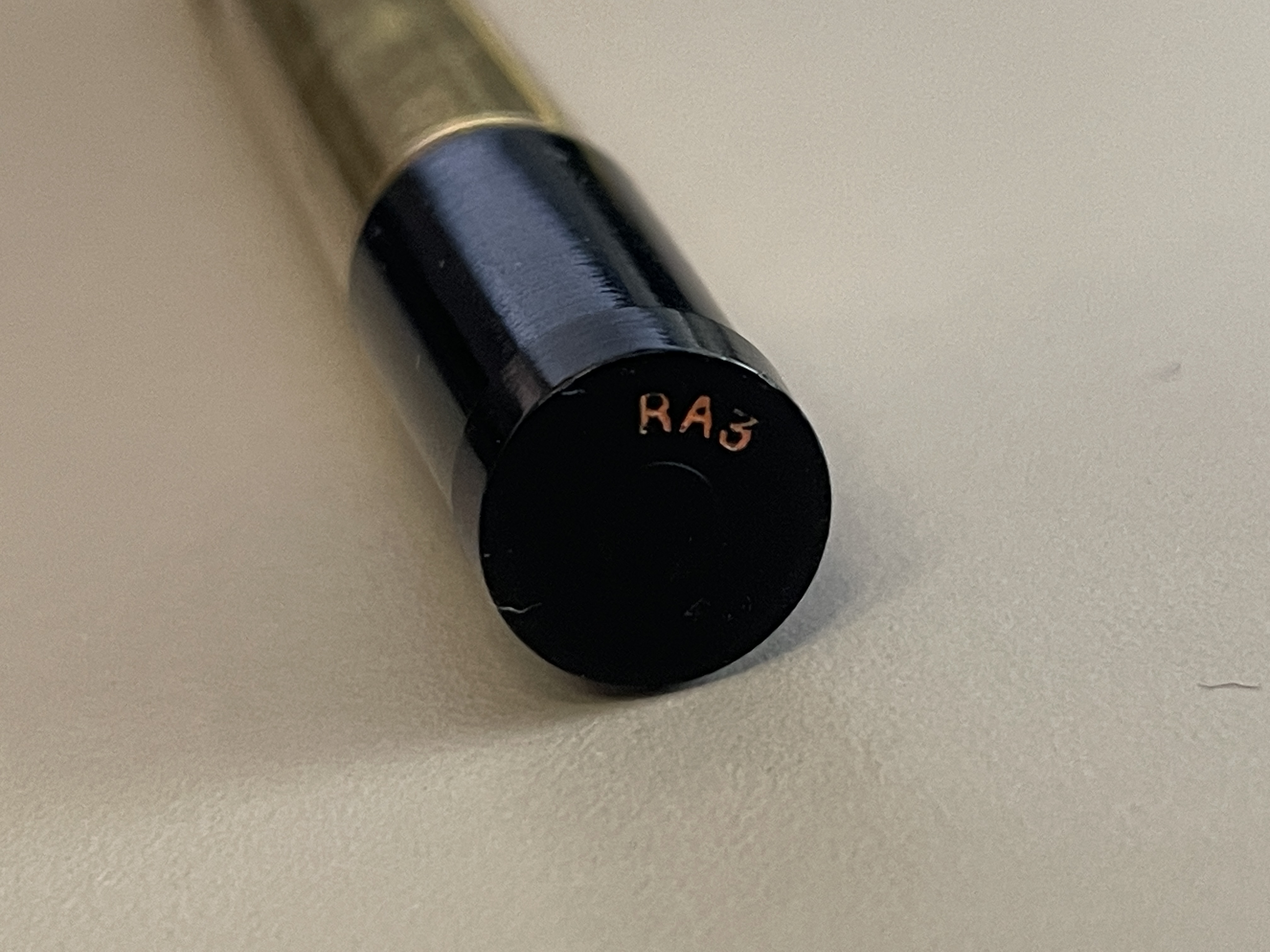 Il modello RA3 è una stilografica rientrante con parti in ebanite e rivestimento in oro 18K (corpo, tappo e anello) e pennino 14K.