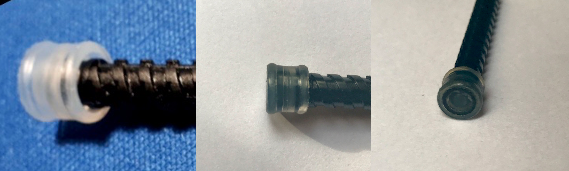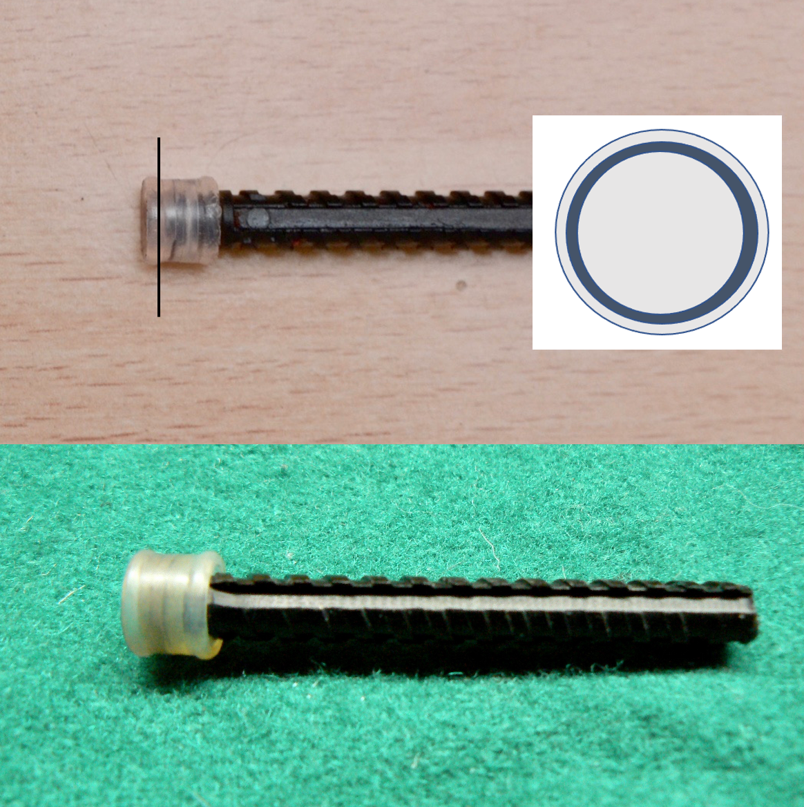 Fascietta durante il taglio, su un tubetto di plastica rigido (qui sul fondello di un ago da siringa!)