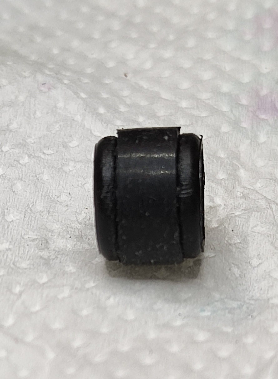 Utilizzando una fascetta di opportuno spessore (qui poco meno di 4mm) e diametro (inferiore a quello del gommino), ritagliata da un avanzo di un sacchetto/serbatoio inchiostro di caucciù, l'ho inserita sul gommino tra i due anelli di tenuta dello stesso, creando così una fascetta di diametro maggiore del gommino, ma elastica e comprimibile (v. foto).
