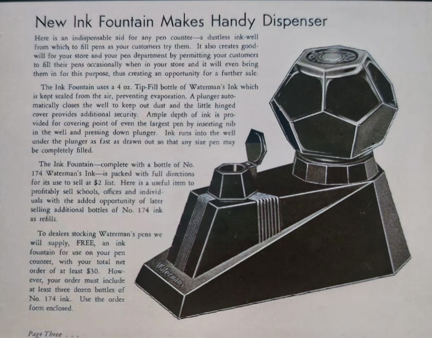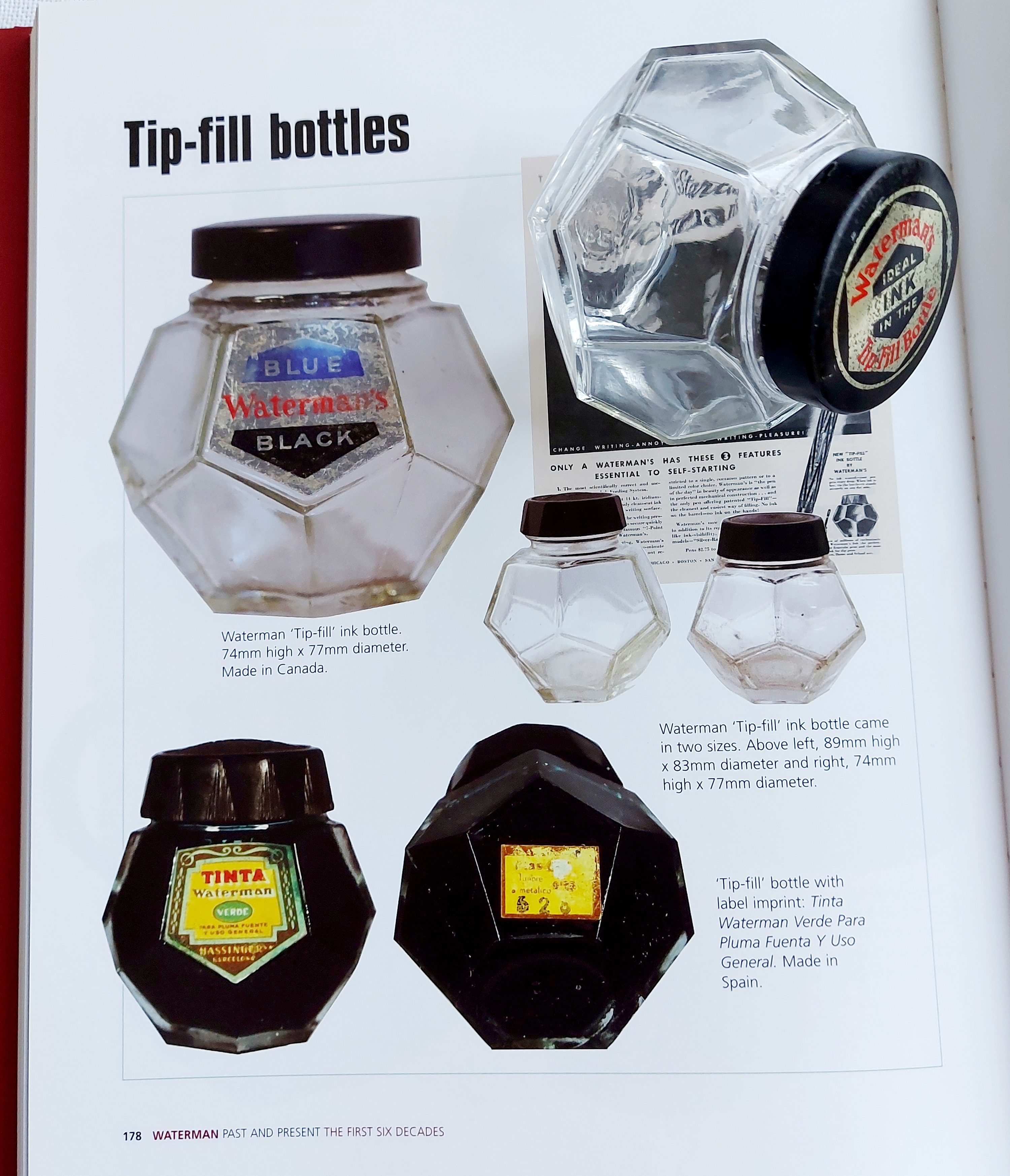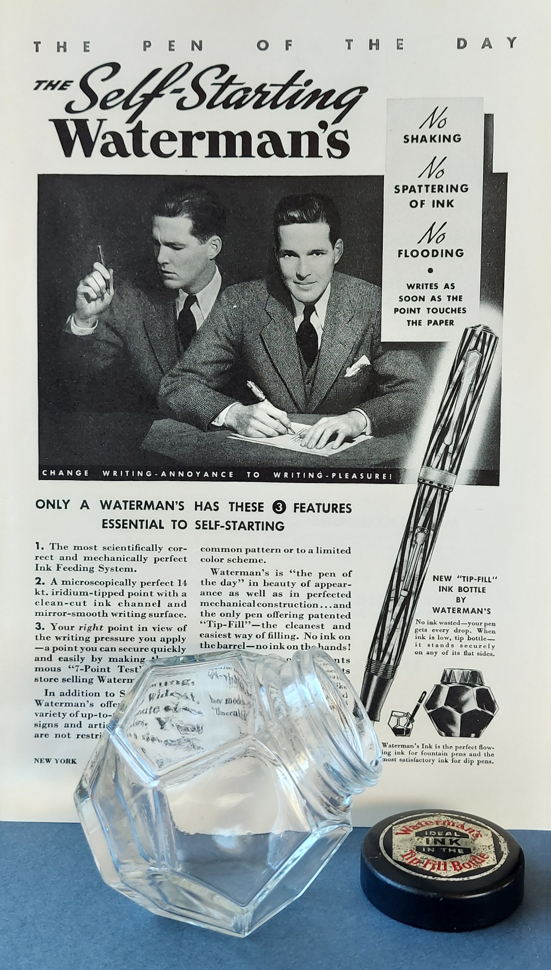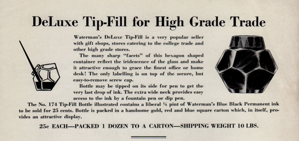 La situazione cambiò dal 1933, sicuramente anche in vista del cinquantesimo anniversario di attività della Casa (1884-1934), e nel 1936, per promuovere più efficacemente la vendita dei quattro nuovi flaconi di inchiostro mostrati in apertura (stilisticamente tutti così pienamente quanto irresistibilmente Art Déco), il marketing della Waterman decise di presentarli come dotati di “special features” (caratteristiche speciali), non solo evidentemente per il design, ma anche per il tipo di impiego per essi suggerito.