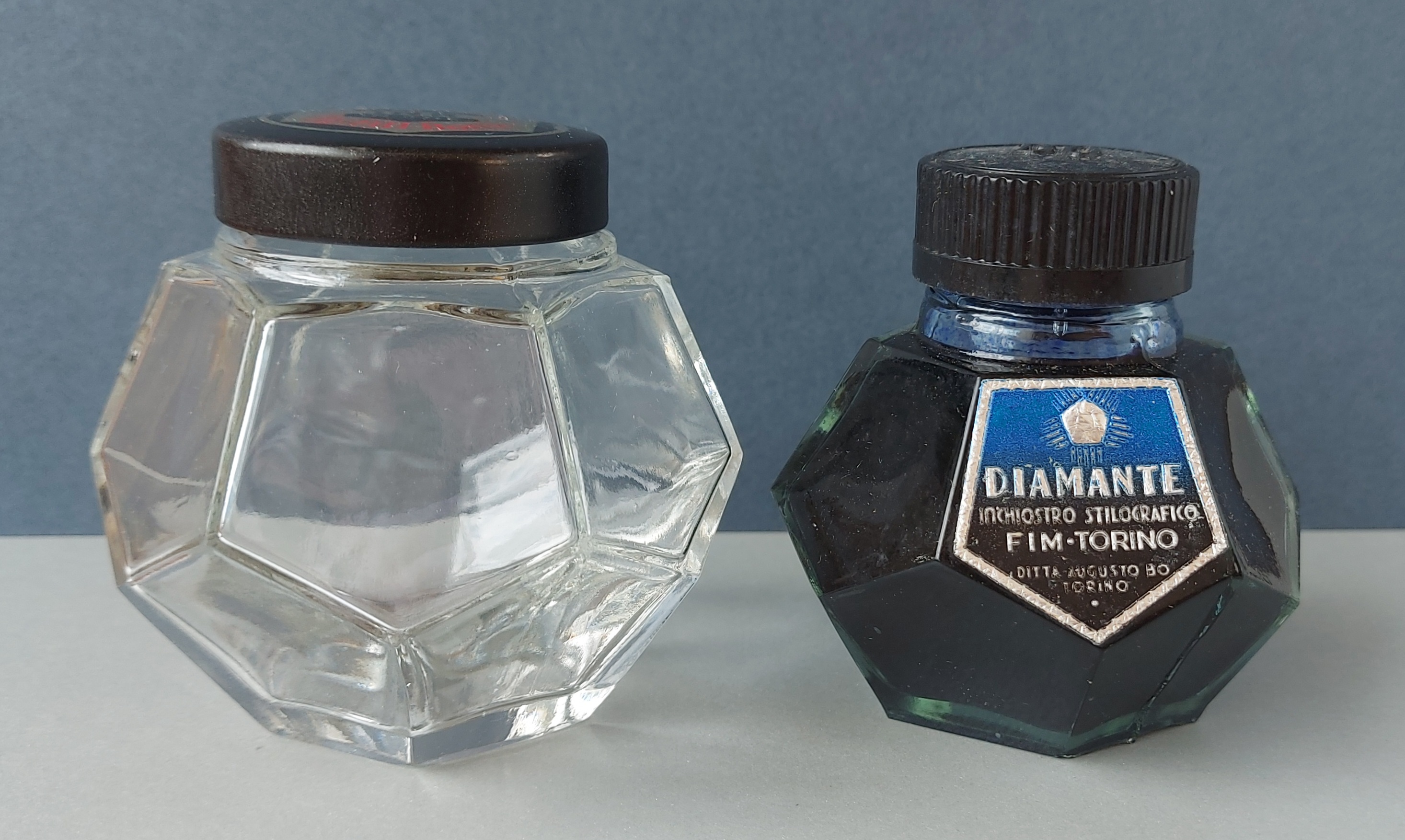 • e dai “calamai da viaggio”, che erano invece ancora e sempre cilindrici, di piccole dimensioni e inseriti in contenitori protettivi in legno e metallo (alluminio) e bachelite.